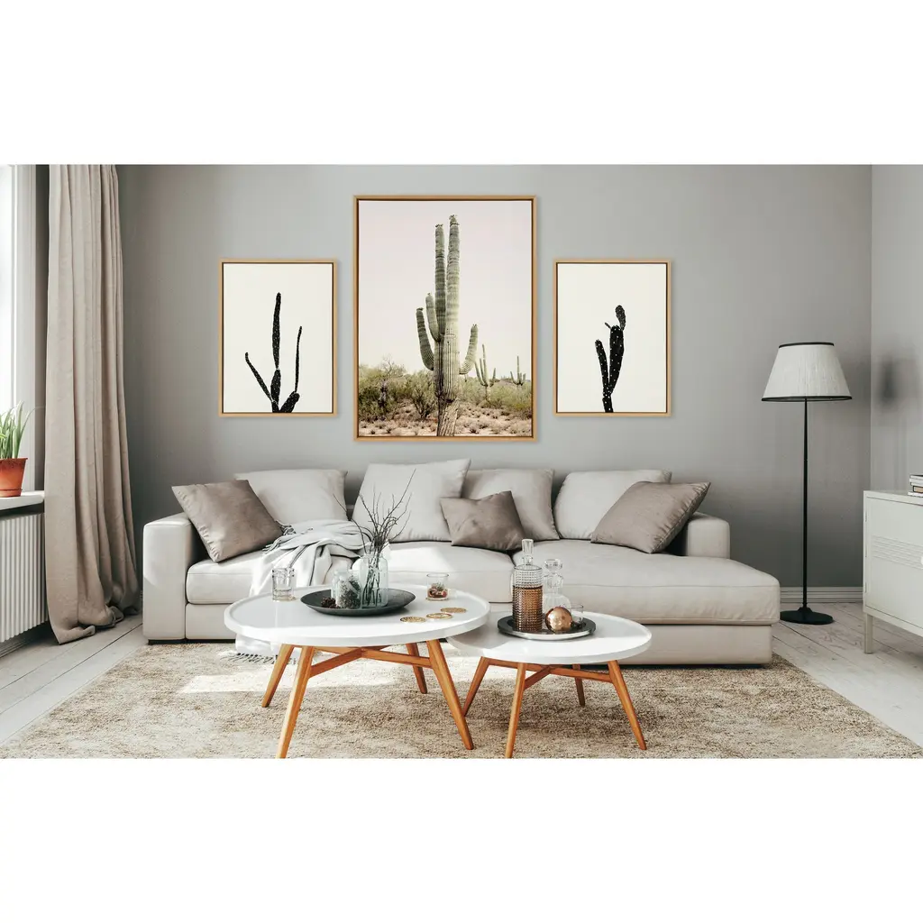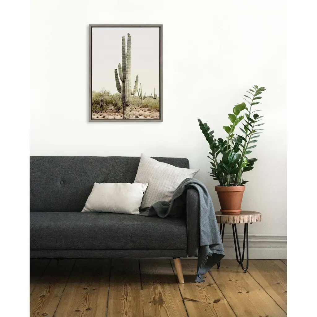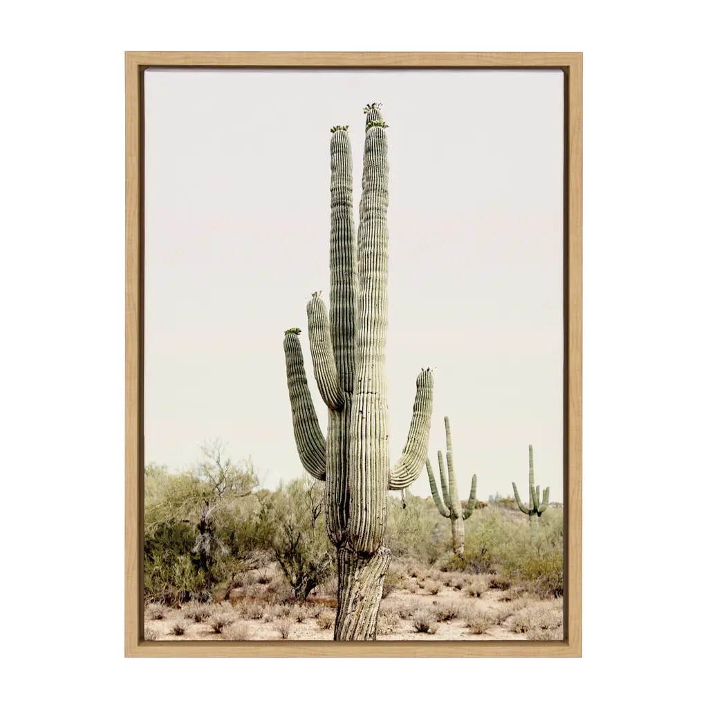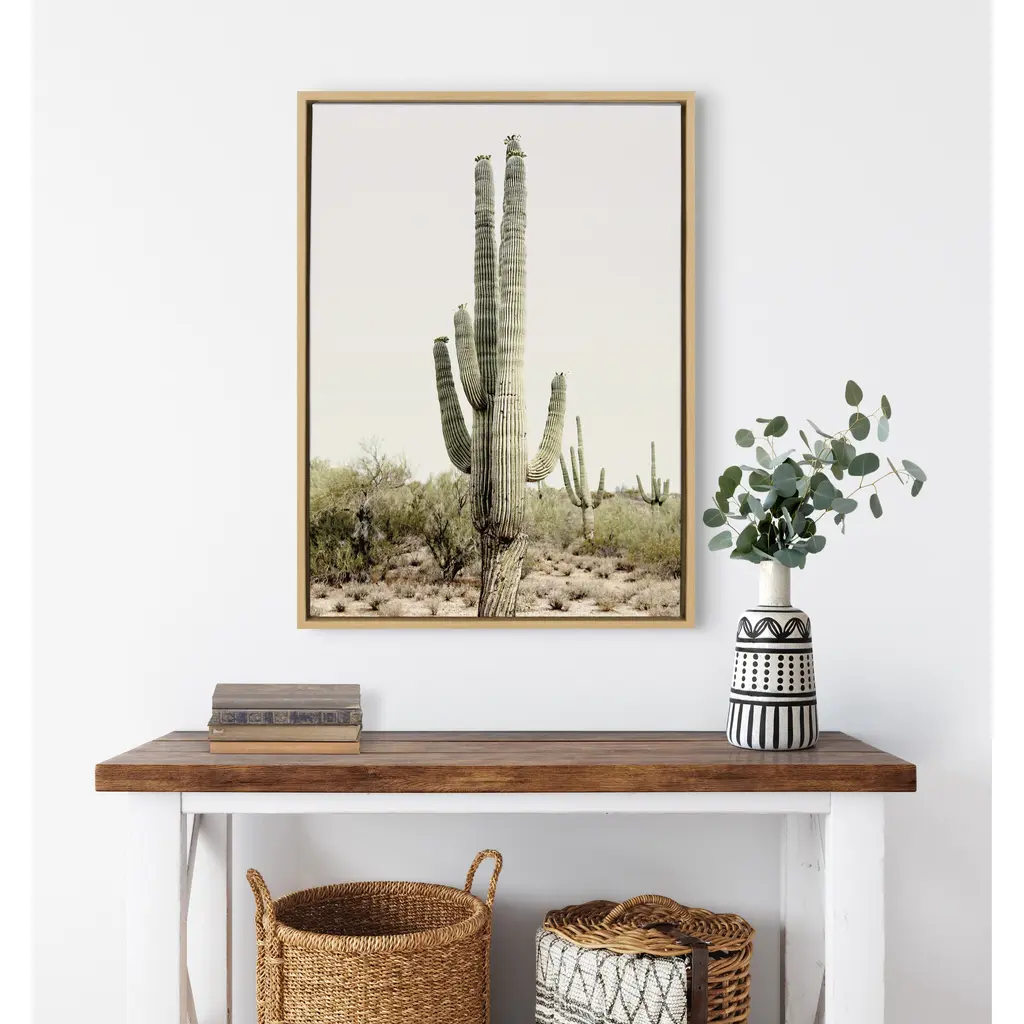 Create a beautiful Southwest vibe in your home with this cactus art by Amy Peterson. Framed in the USA in Waunakee, Wisconsin, this floating canvas art will be a pleasure to look at every day in your living room, bedroom, nursery, or any room in the home. Printed on gallery-wrapped canvas and framed with a lightweight polystyrene frame, this wall art has two hangers already attached to the MDF back for easy wall display. The outer dimensions are 33 inches tall by 23 inches wide by 1.63 inches deep. Print Name: "Sunrise Cactus"