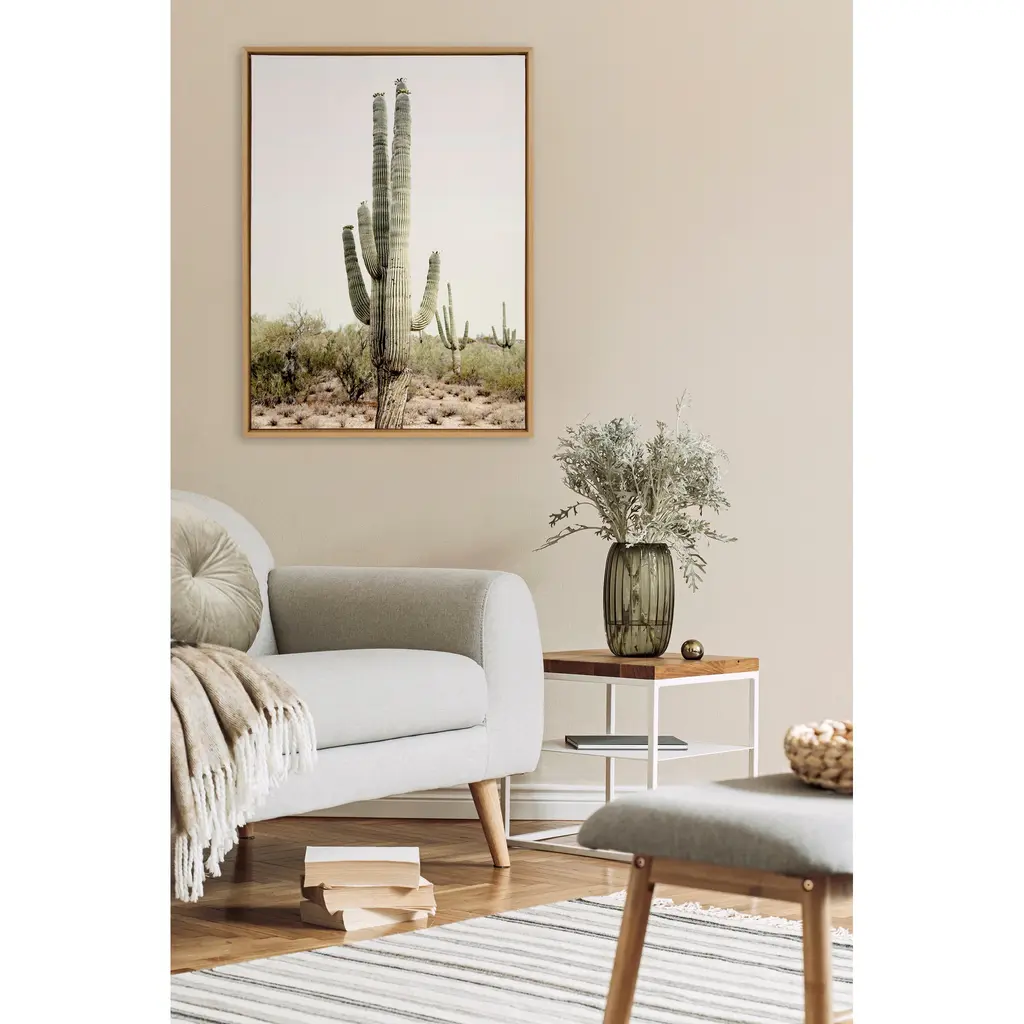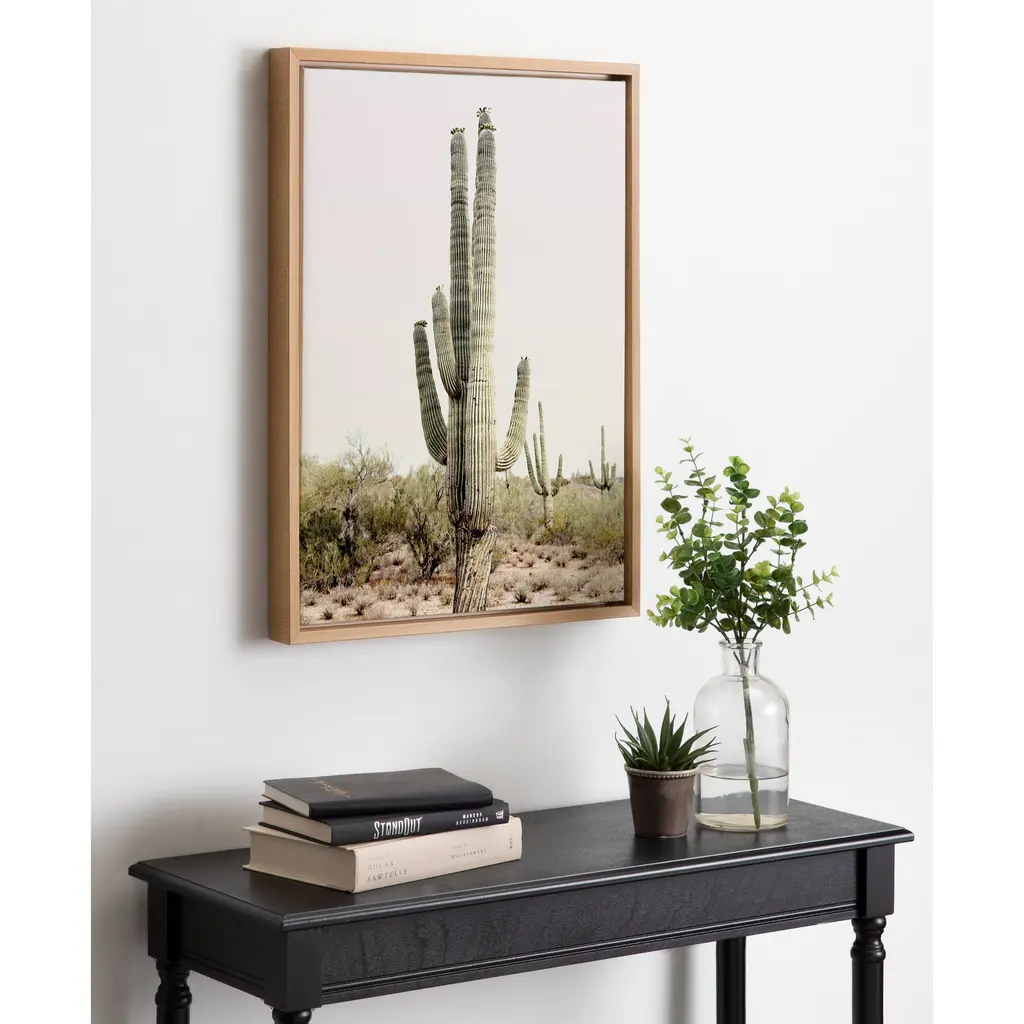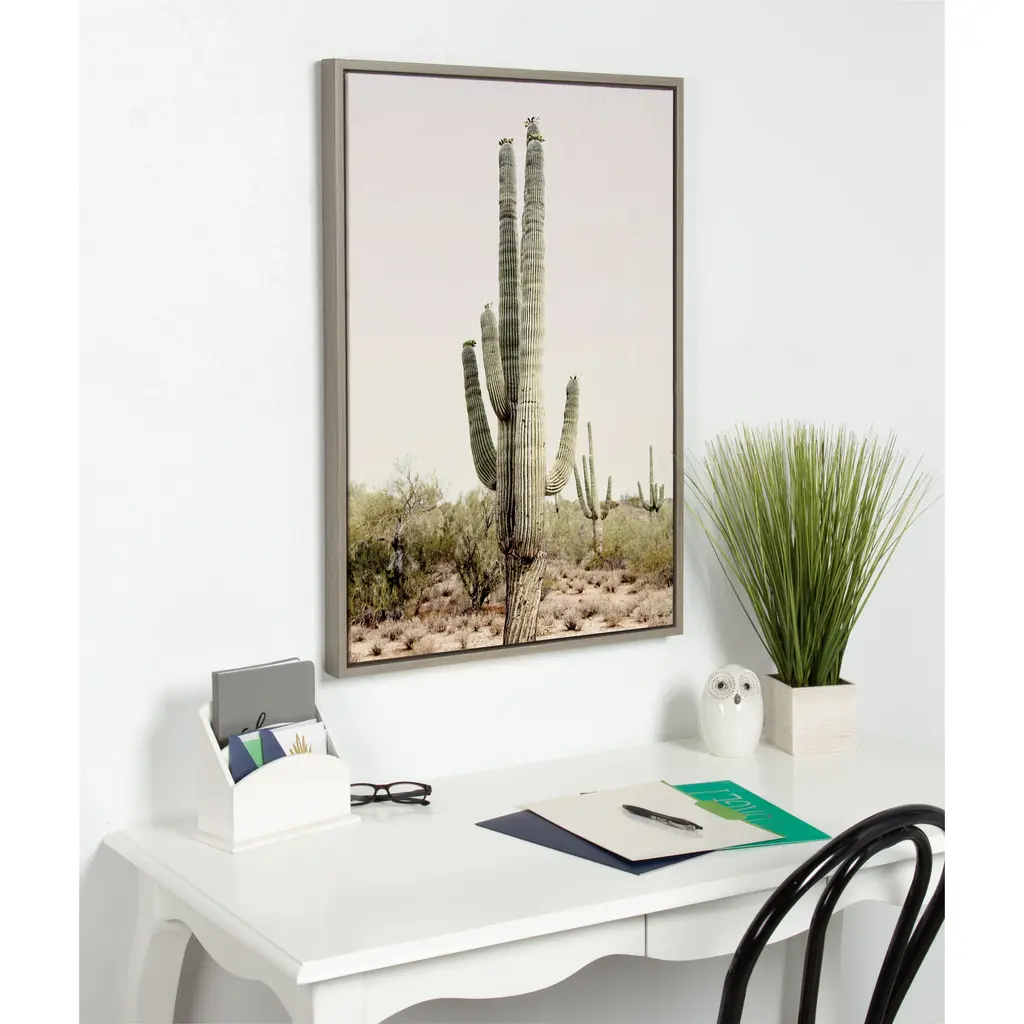 Create a beautiful Southwest vibe in your home with this cactus art by Amy Peterson. Framed in the USA in Waunakee, Wisconsin, this floating canvas art will be a pleasure to look at every day in your living room, bedroom, nursery, or any room in the home. Printed on gallery-wrapped canvas and framed with a lightweight polystyrene frame, this wall art has two hangers already attached to the MDF back for easy wall display. The outer dimensions are 33 inches tall by 23 inches wide by 1.63 inches deep. Print Name: "Sunrise Cactus"