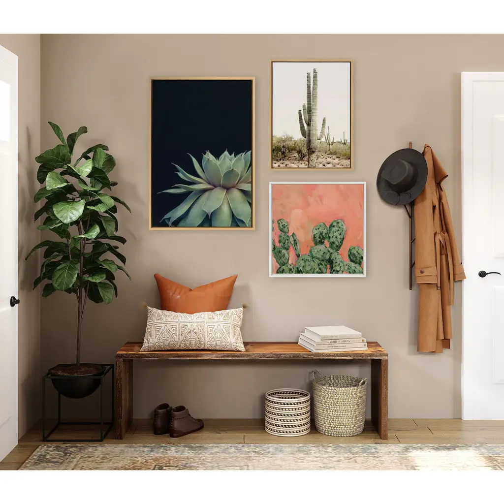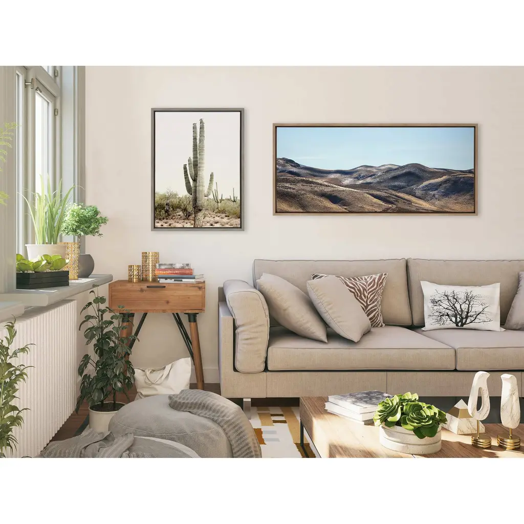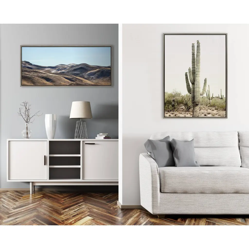 Create a beautiful Southwest vibe in your home with this cactus art by Amy Peterson. Framed in the USA in Waunakee, Wisconsin, this floating canvas art will be a pleasure to look at every day in your living room, bedroom, nursery, or any room in the home. Printed on gallery-wrapped canvas and framed with a lightweight polystyrene frame, this wall art has two hangers already attached to the MDF back for easy wall display. The outer dimensions are 33 inches tall by 23 inches wide by 1.63 inches deep. Print Name: "Sunrise Cactus"