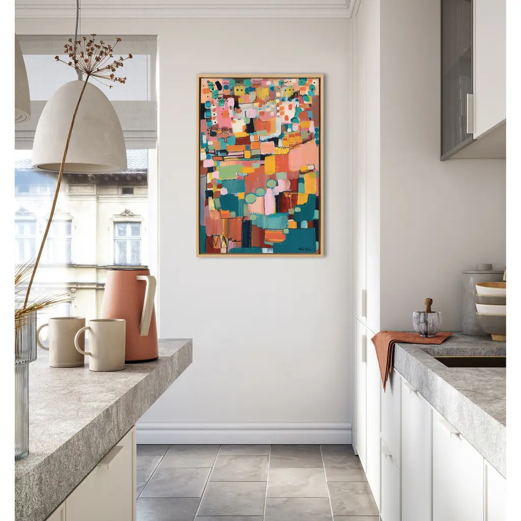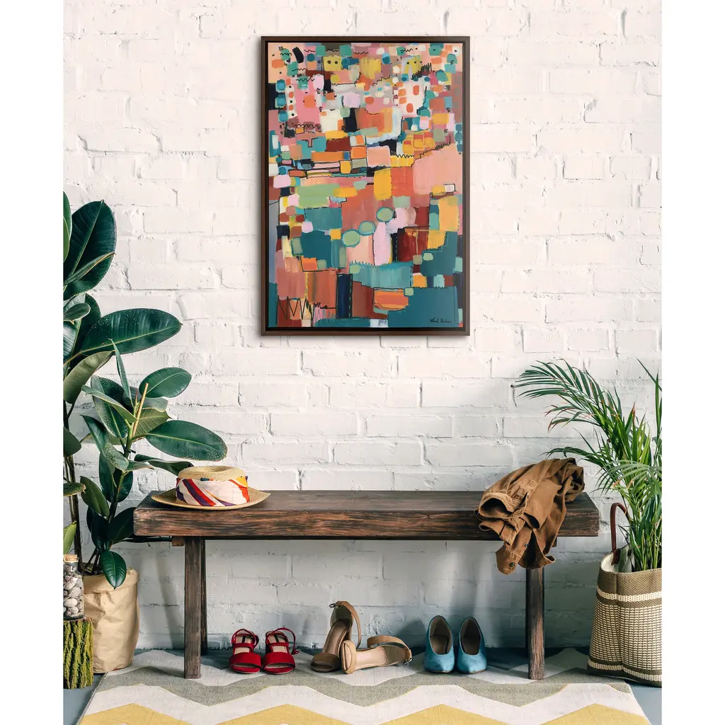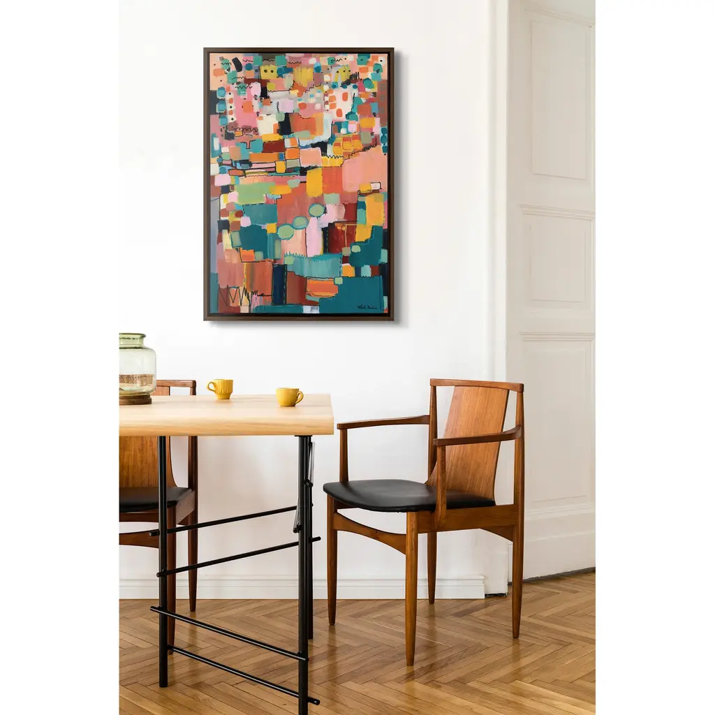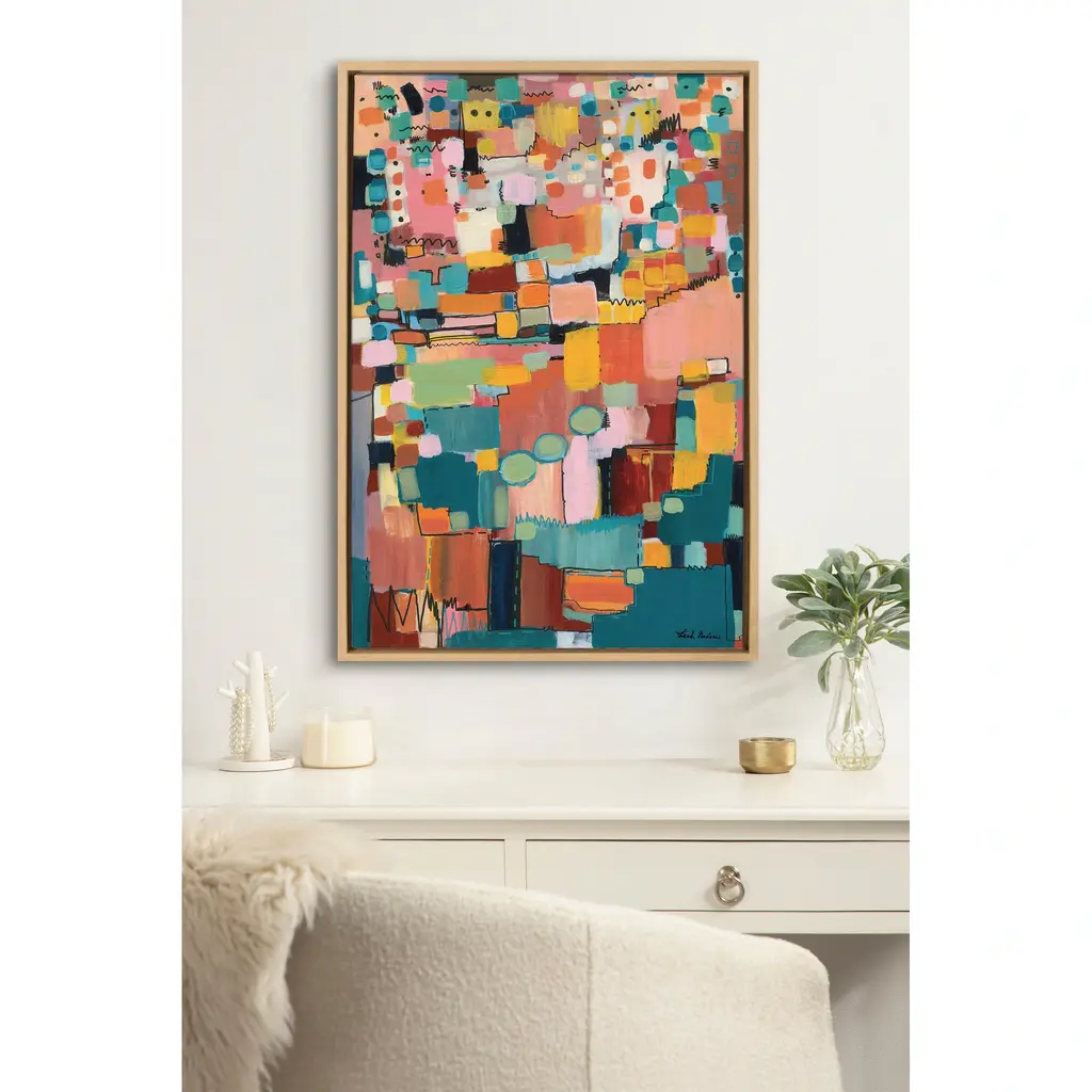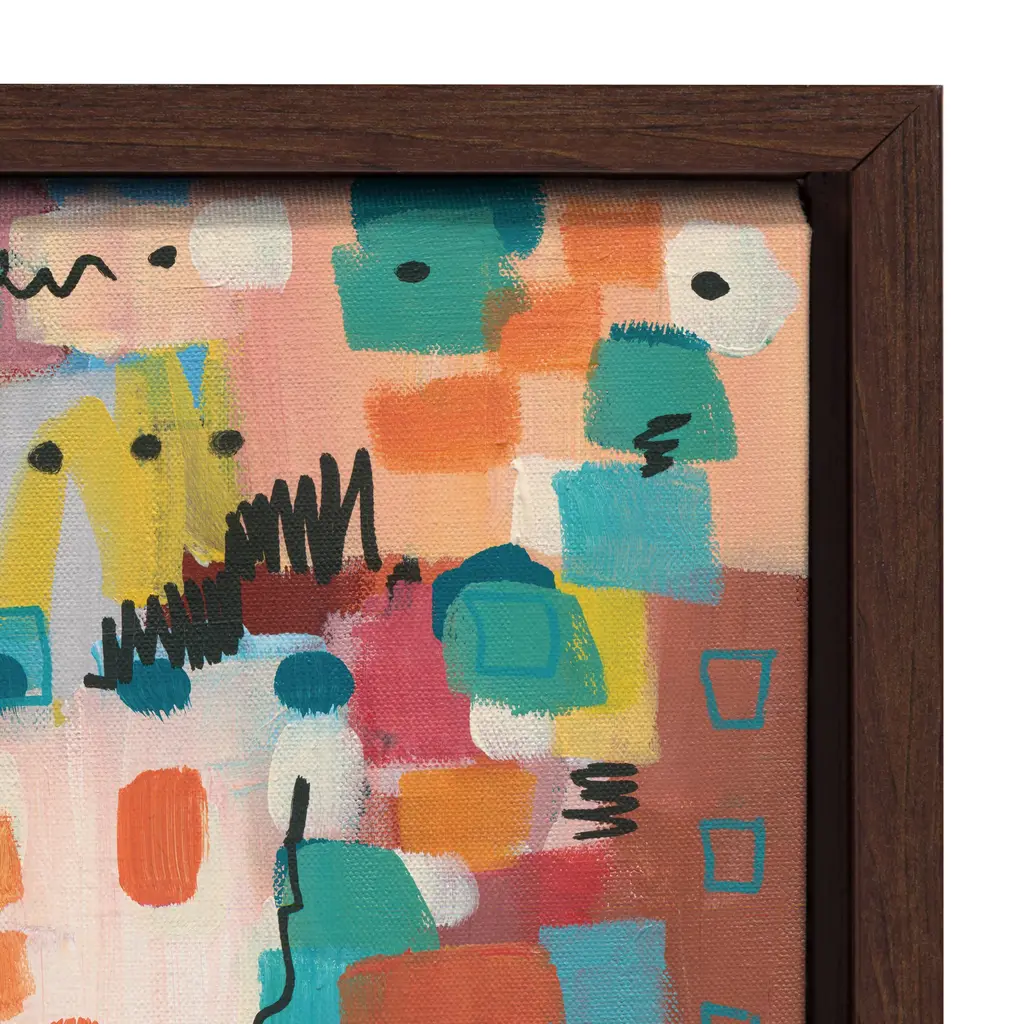 The avant-garde design of this festive abstract art print brings colorful hues and unique forms to your space. Framed in the USA in Waunakee, Wisconsin, this floating canvas art will be a pleasure to look at every day in your living room, bedroom, office, or any room in the home. This art print also makes an excellent gift for birthdays, holidays, or house-warming parties. Printed on gallery-wrapped canvas and framed with a lightweight polystyrene frame, this wall art has two hangers already attached to the MDF back for easy wall display. Print Name: "Sunset Fiesta"