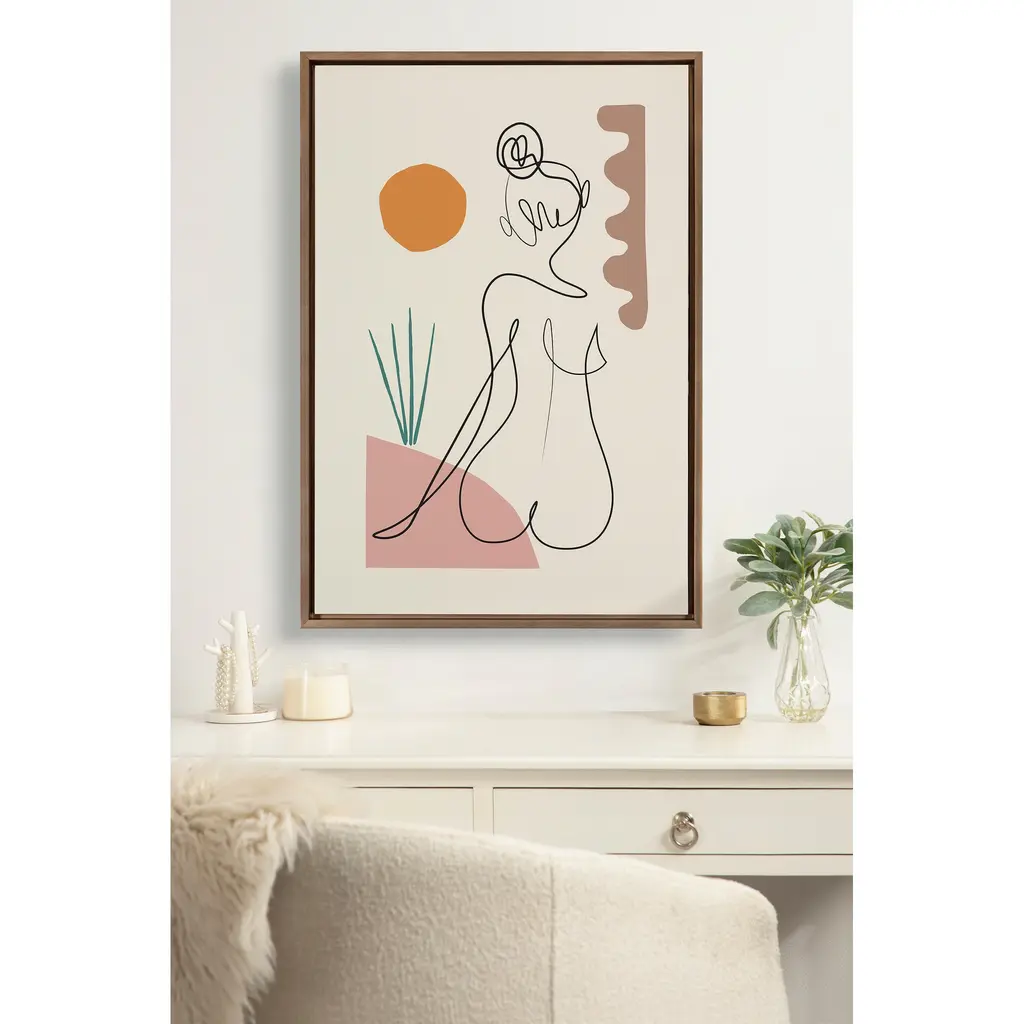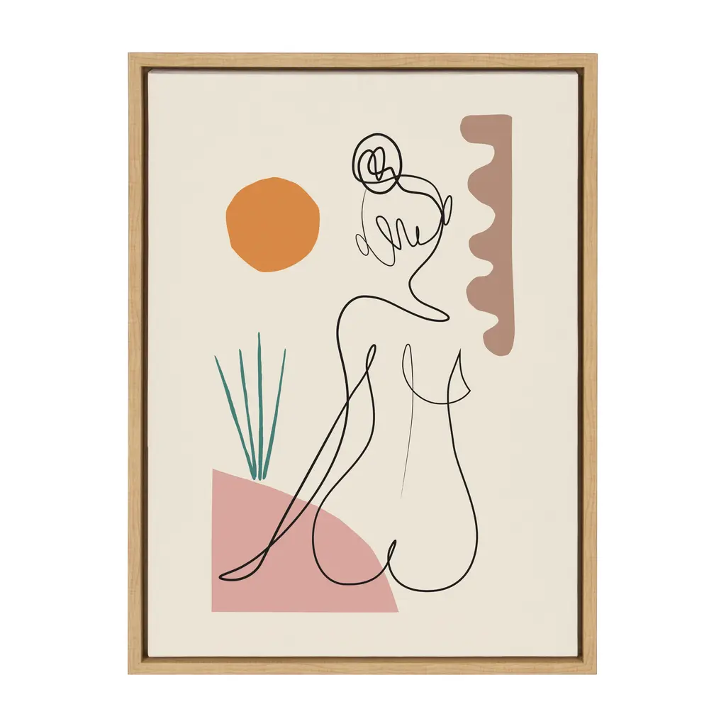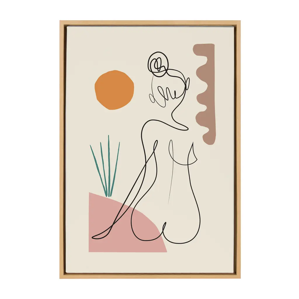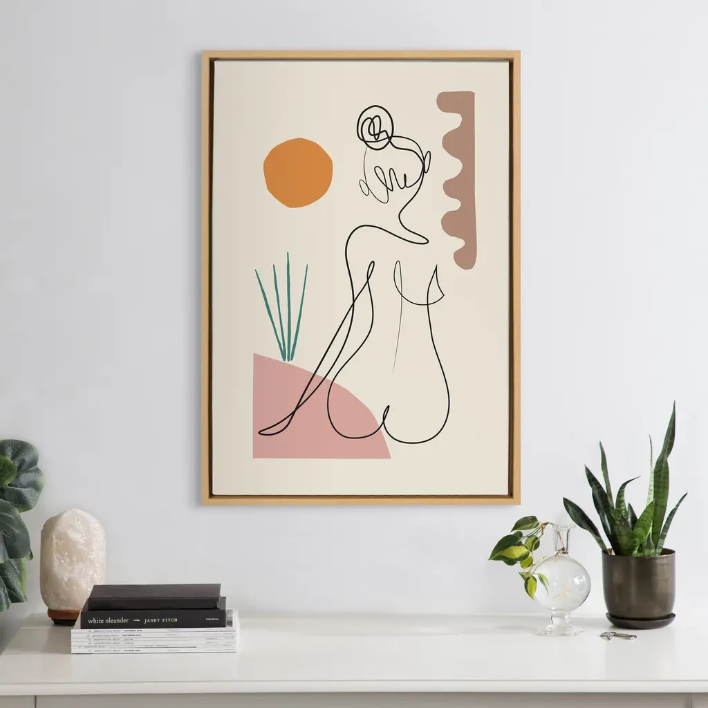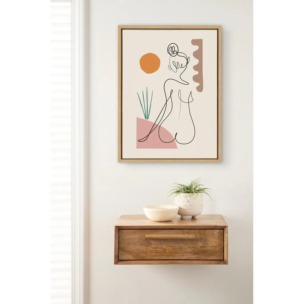 This alluring, avant-garde print captures boho beauty with its feminine subject and bold, abstract design. It's the perfect accent piece to highlight your personal style and give meaning to your wall decor. Framed in the USA in Waunakee, Wisconsin, this floating canvas art will be a pleasure to look at every day in your living room, bedroom, office, or any room in the home. This art print also makes an excellent gift for birthdays, holidays, or house-warming parties. Printed on gallery-wrapped canvas and framed with a lightweight polystyrene frame, this wall art has two hangers already attached to the MDF back for easy wall display. The outer dimensions are 24 inches by 18 inches by 1.6 inches. Print Name: "Sunset"
