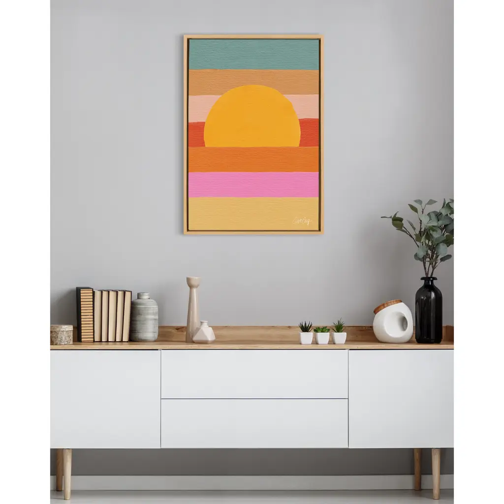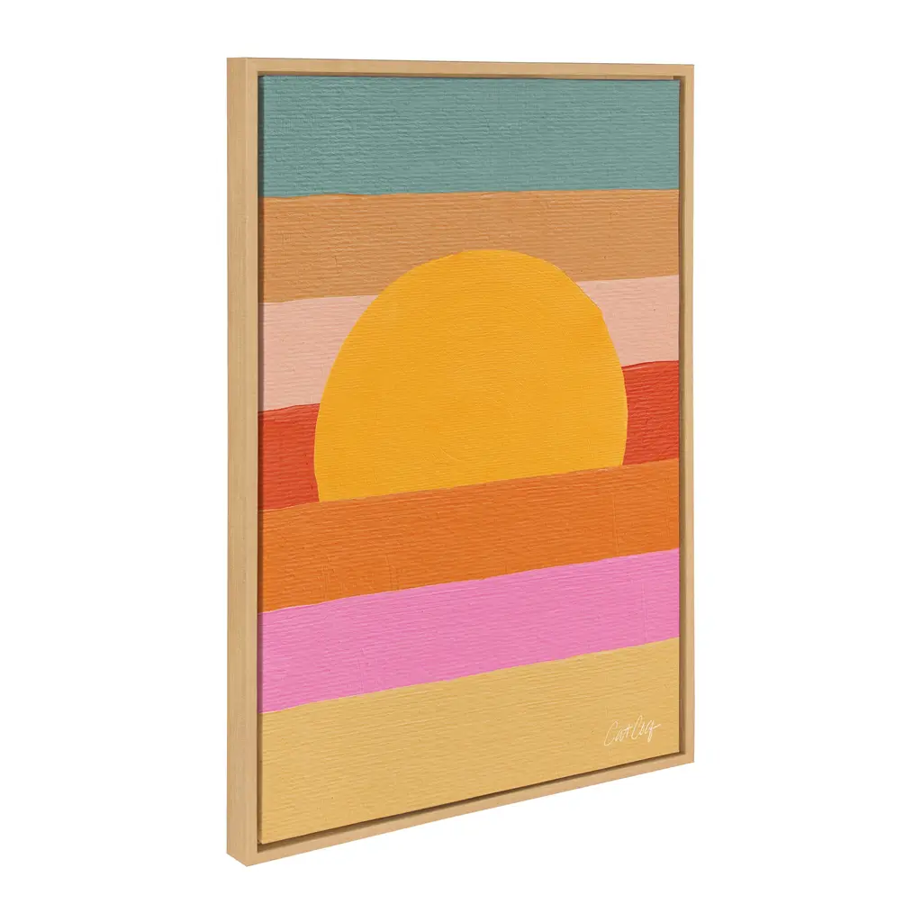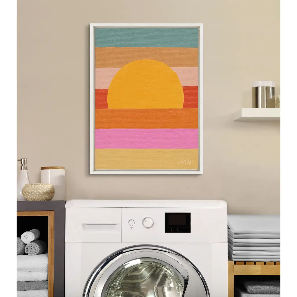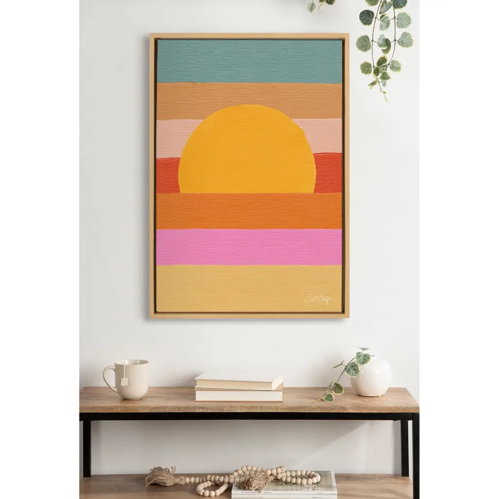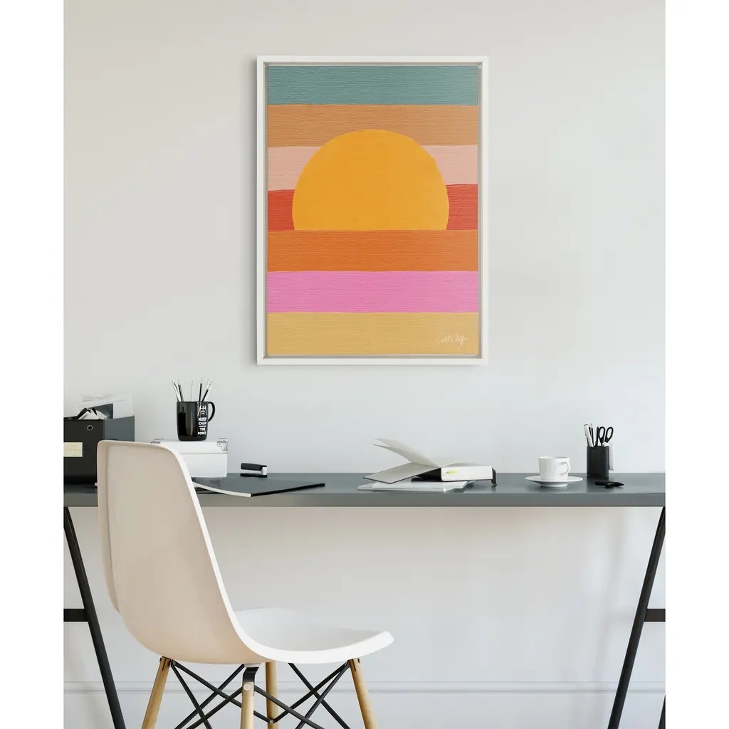 This vibrant burst of color is an excellent way to add some warmth and color to your favorite living spaces. Framed in the USA in Waunakee, Wisconsin, this floating canvas art will be a pleasure to look at every day in your living room, bedroom, bathroom, or any room in the home. Printed on gallery-wrapped canvas and framed with a lightweight polystyrene frame, this wall art has two hangers already attached to the MDF back for easy wall display. The outer dimensions are 24 inches tall by 18 inches wide by 1.63 inches deep. Print Name: "Sunset Waves"