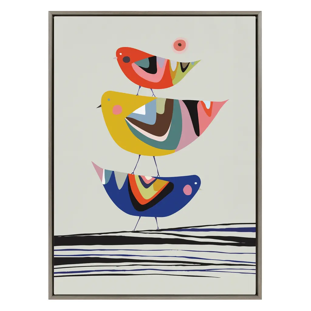 This chic family of birds is the perfect way to create a whimsical mid-century decor theme throughout your home. Framed in the USA in Waunakee, Wisconsin, this floating canvas art will be a pleasure to look at every day in your living room, bedroom, nursery, or any room in the home. Printed on gallery-wrapped canvas and framed with a lightweight polystyrene frame, this wall art has two hangers already attached to the MDF back for easy wall display. The outer dimensions are 33 inches tall by 23 inches wide by 1.63 inches deep. Print Name: "The Family Tree"