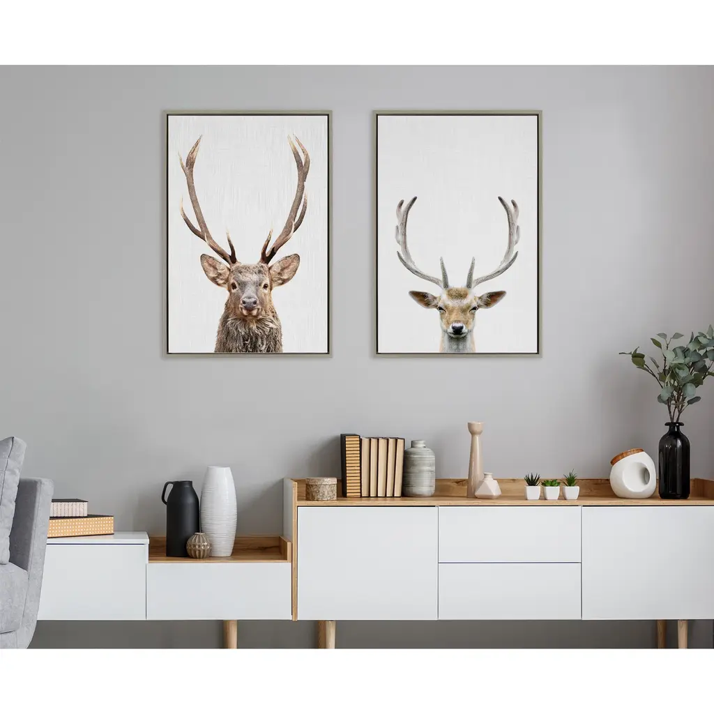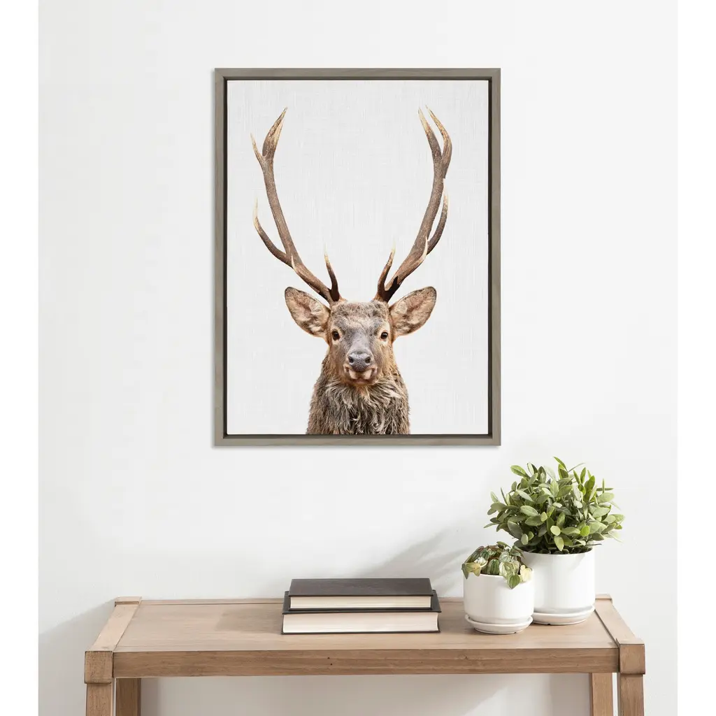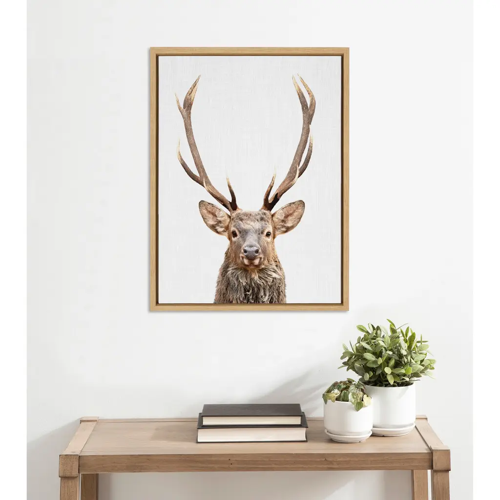 This framed canvas wall art by Simon Te of Tai Prints is a great way to introduce the charm of the forest to your space. Display your love of animals in your home with this powerful deer with antlers portrait. Framed in the USA in Waunakee, Wisconsin, this modern floating canvas art is sure to bring joy to your space. Our design team curates art that will fit perfectly in any room of your home. Showcase this art in your living room, bedroom, home office, kitchen, bathroom, nursery, or anywhere you want to bring a little beauty and charm to your walls. Specializing in home décor, we are continually bringing timeless works of art for the traditional decorator as well as trend-forward pieces for that eclectic art lover. Our high-quality framed canvas art also makes excellent gifts for birthdays, holidays, or housewarming parties. Printed on gallery-wrapped canvas and framed with a simple gallery frame this wall art is easy to display on the wall and will match with any décor style. The outer dimensions are 18 inches by 24 inches by 1.6 inches. Print Name: "The Red Deer Color"