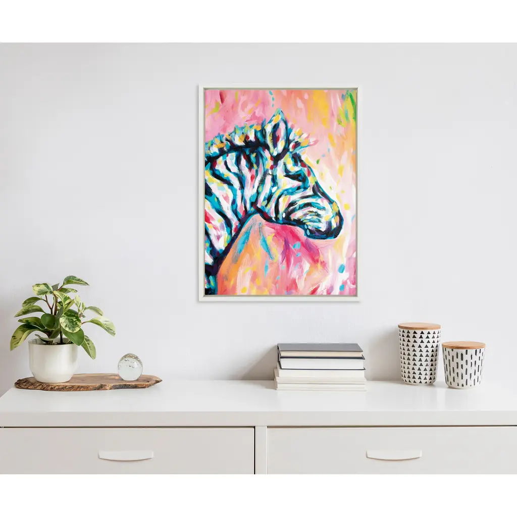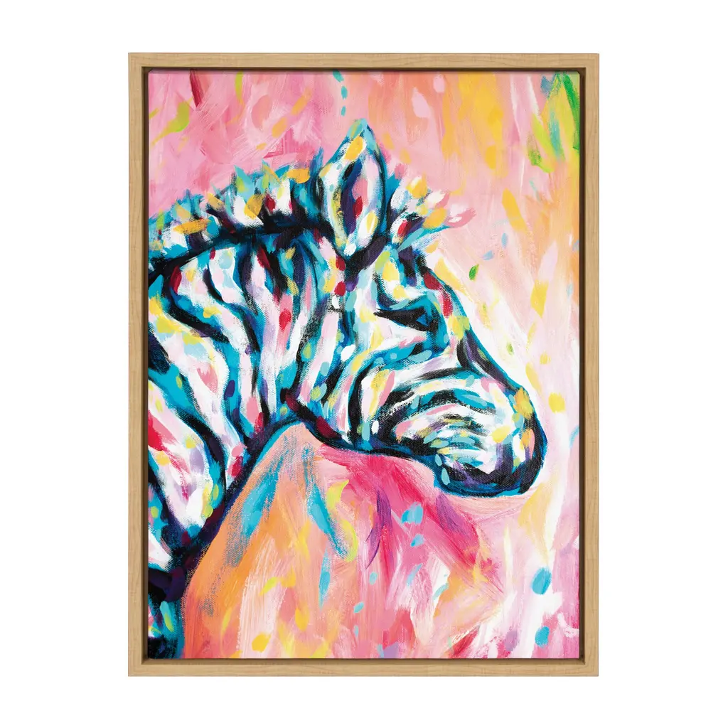 A lively portrayal of a zebra comes to life in this framed canvas wall art by Rachel Christopoulos. Created with vibrant watercolor techniques, the artwork showcases the zebra's distinctive features and essence with its playful color palette and energetic brushstrokes. Framed in the USA in Waunakee, Wisconsin, this modern floating canvas art is sure to bring joy to your space. Our design team curates art that will fit perfectly in any room of your home. Showcase this art in your living room, bedroom, home office, kitchen, bathroom, nursery, or anywhere you want to bring a little beauty and charm to your walls. Specializing in home décor, we are continually bringing timeless works of art for the traditional decorator as well as trend-forward pieces for that eclectic art lover. Our high-quality framed canvas art also makes excellent gifts for birthdays, holidays, or housewarming parties. Printed on gallery-wrapped canvas and framed with a simple gallery frame this wall art is easy to display on the wall and will match with any décor style. The outer dimensions are 18 inches by 24 inches by 1.6 inches. Print Name: "Piata The Zebra"