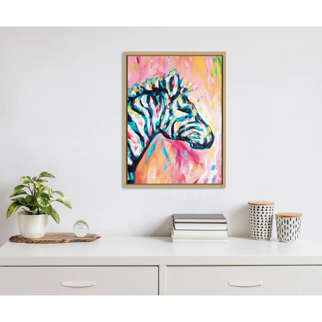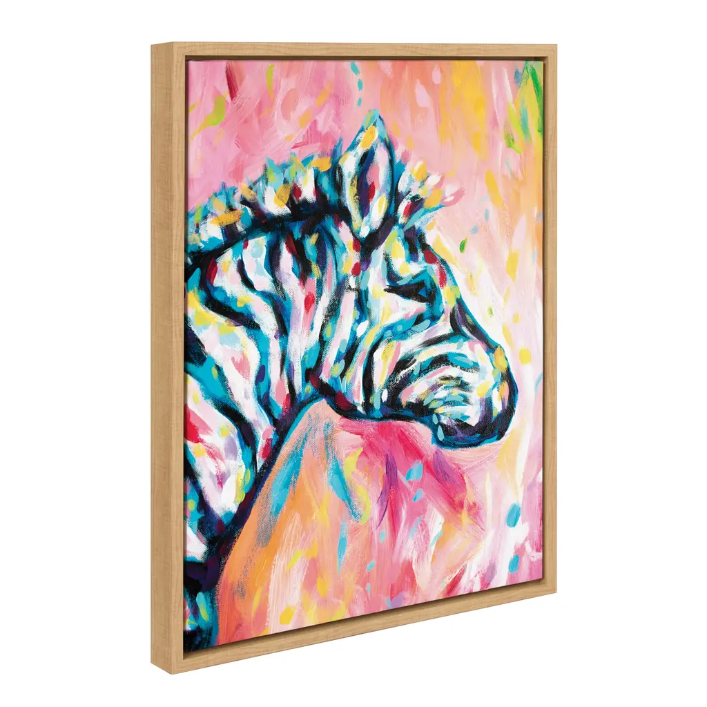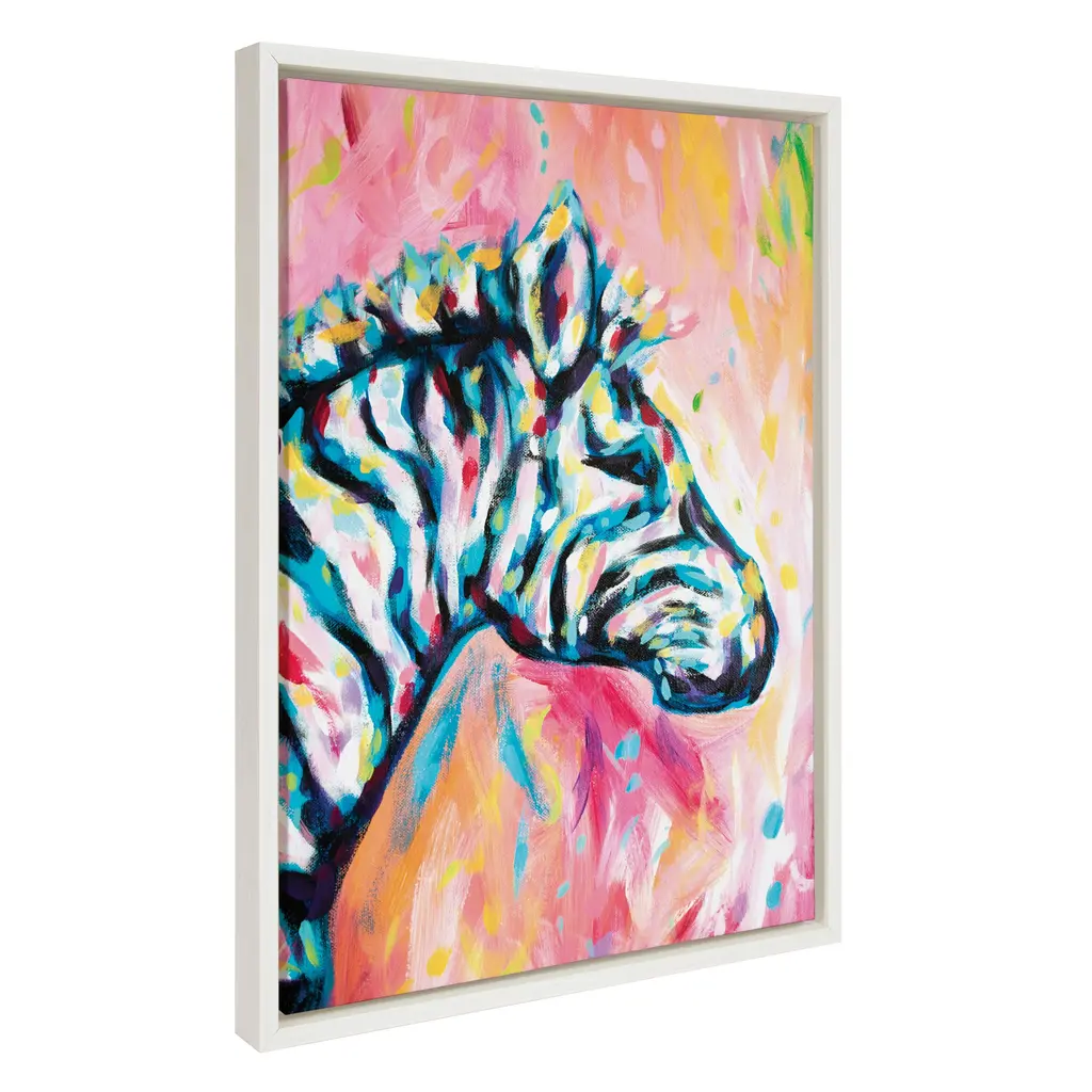 A lively portrayal of a zebra comes to life in this framed canvas wall art by Rachel Christopoulos. Created with vibrant watercolor techniques, the artwork showcases the zebra's distinctive features and essence with its playful color palette and energetic brushstrokes. Framed in the USA in Waunakee, Wisconsin, this modern floating canvas art is sure to bring joy to your space. Our design team curates art that will fit perfectly in any room of your home. Showcase this art in your living room, bedroom, home office, kitchen, bathroom, nursery, or anywhere you want to bring a little beauty and charm to your walls. Specializing in home décor, we are continually bringing timeless works of art for the traditional decorator as well as trend-forward pieces for that eclectic art lover. Our high-quality framed canvas art also makes excellent gifts for birthdays, holidays, or housewarming parties. Printed on gallery-wrapped canvas and framed with a simple gallery frame this wall art is easy to display on the wall and will match with any décor style. The outer dimensions are 18 inches by 24 inches by 1.6 inches. Print Name: "Piata The Zebra"