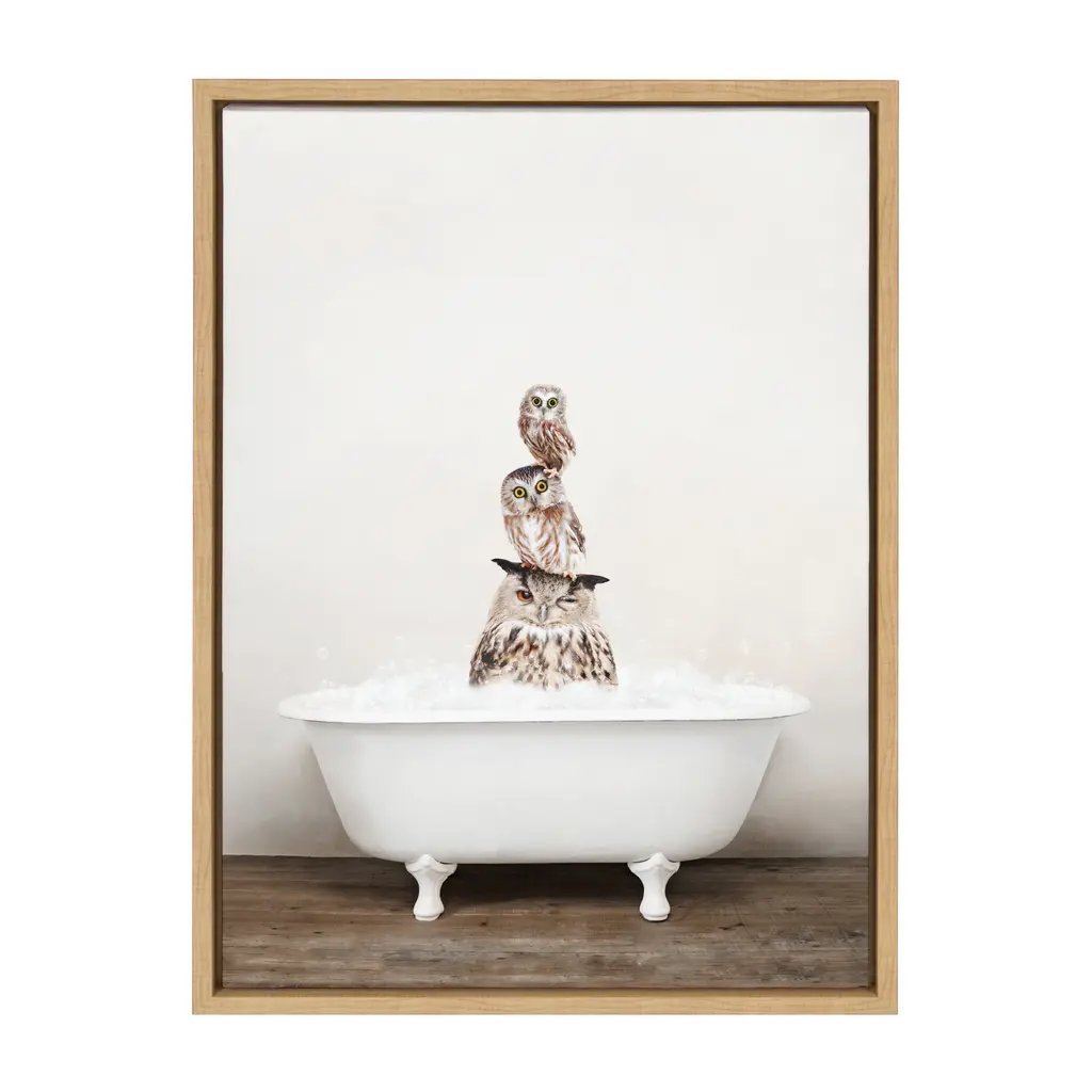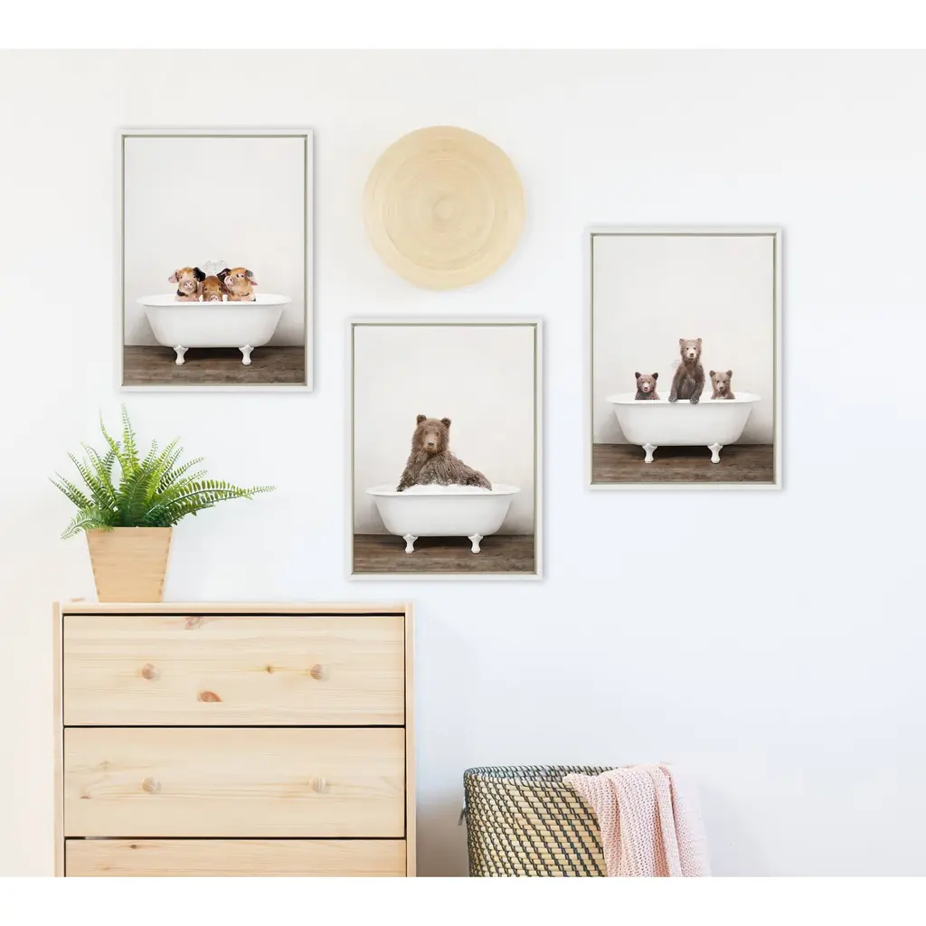 How could you not go full-heart eyes with these adorable baby bears who just want a bath? Framed in the USA in Waunakee, Wisconsin, this floating canvas art will be a pleasure to look at every day in your living room, bedroom, nursery, or any room in the home. Printed on gallery-wrapped canvas and framed with a lightweight polystyrene frame, this wall art has two hangers already attached to the MDF back for easy wall display. The outer dimensions are 24 inches tall by 18 inches wide by 1.63 inches deep. Print Name: "Three Little Bears in Vintage Bathtub"