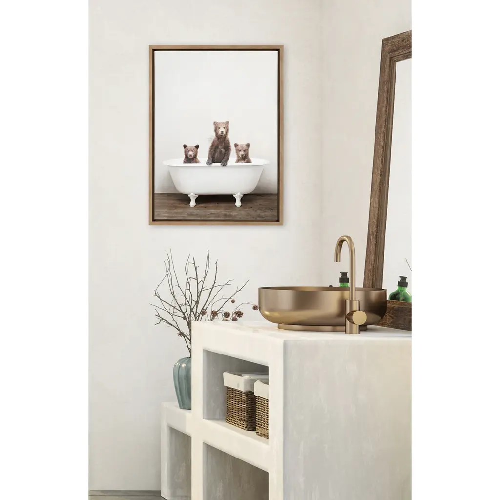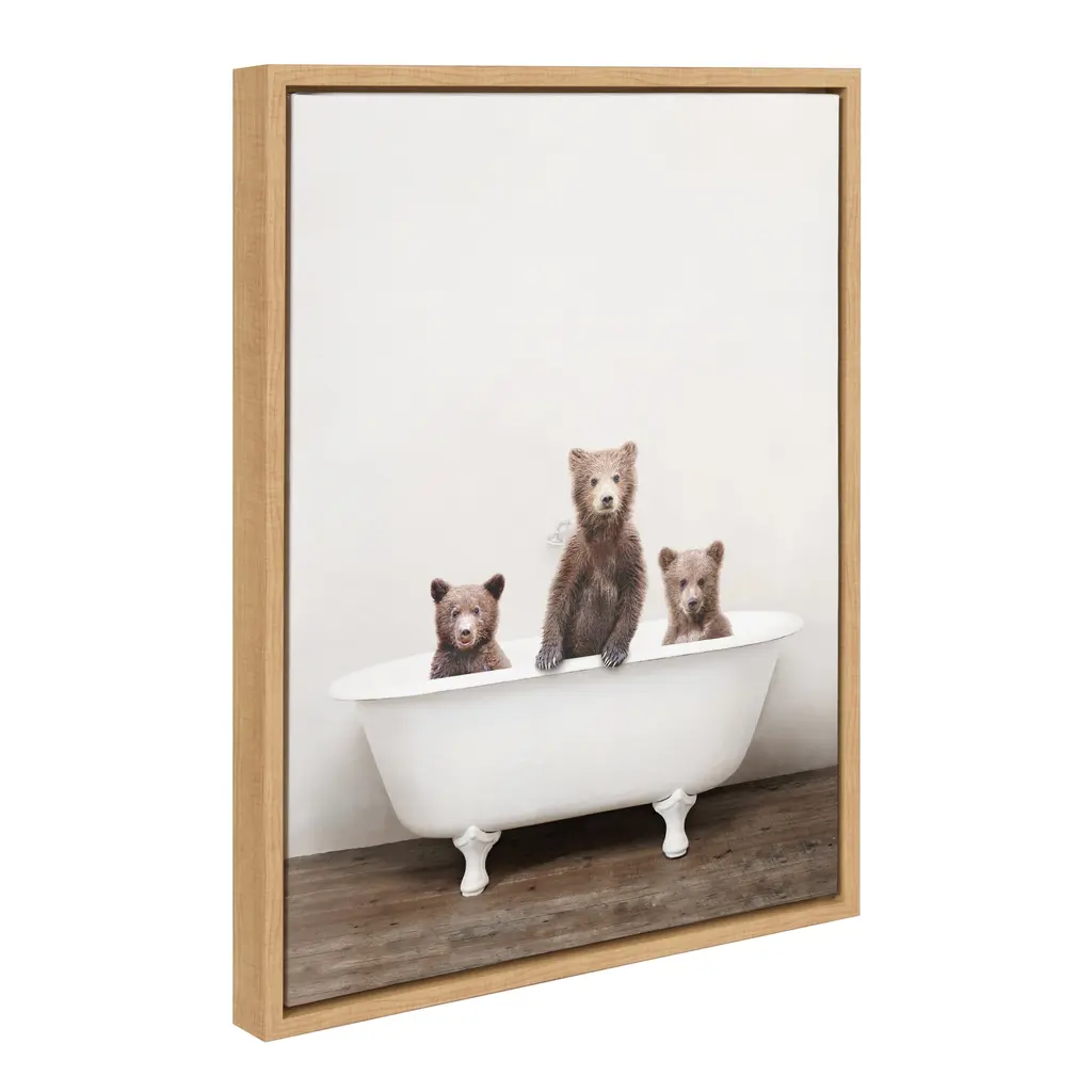 How could you not go full-heart eyes with these adorable baby bears who just want a bath? Framed in the USA in Waunakee, Wisconsin, this floating canvas art will be a pleasure to look at every day in your living room, bedroom, nursery, or any room in the home. Printed on gallery-wrapped canvas and framed with a lightweight polystyrene frame, this wall art has two hangers already attached to the MDF back for easy wall display. The outer dimensions are 24 inches tall by 18 inches wide by 1.63 inches deep. Print Name: "Three Little Bears in Vintage Bathtub"