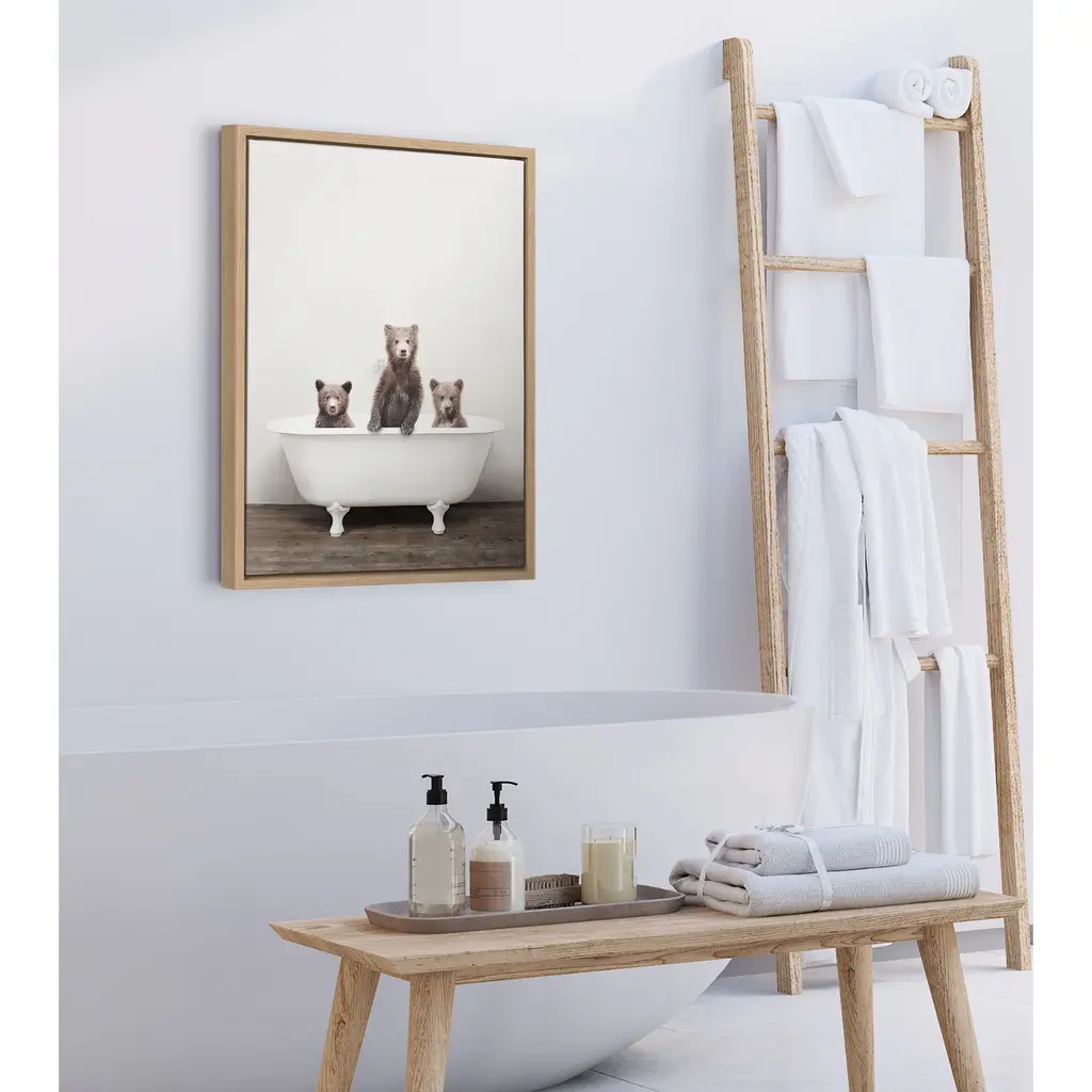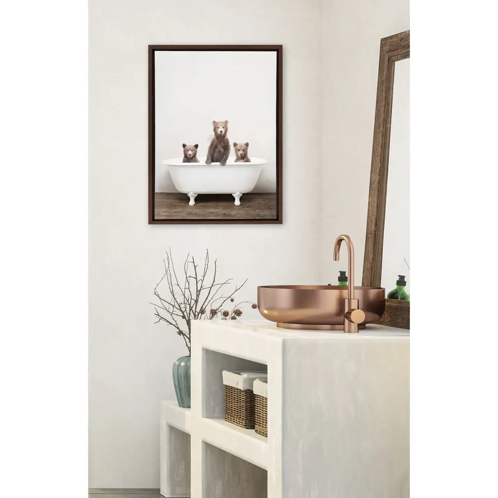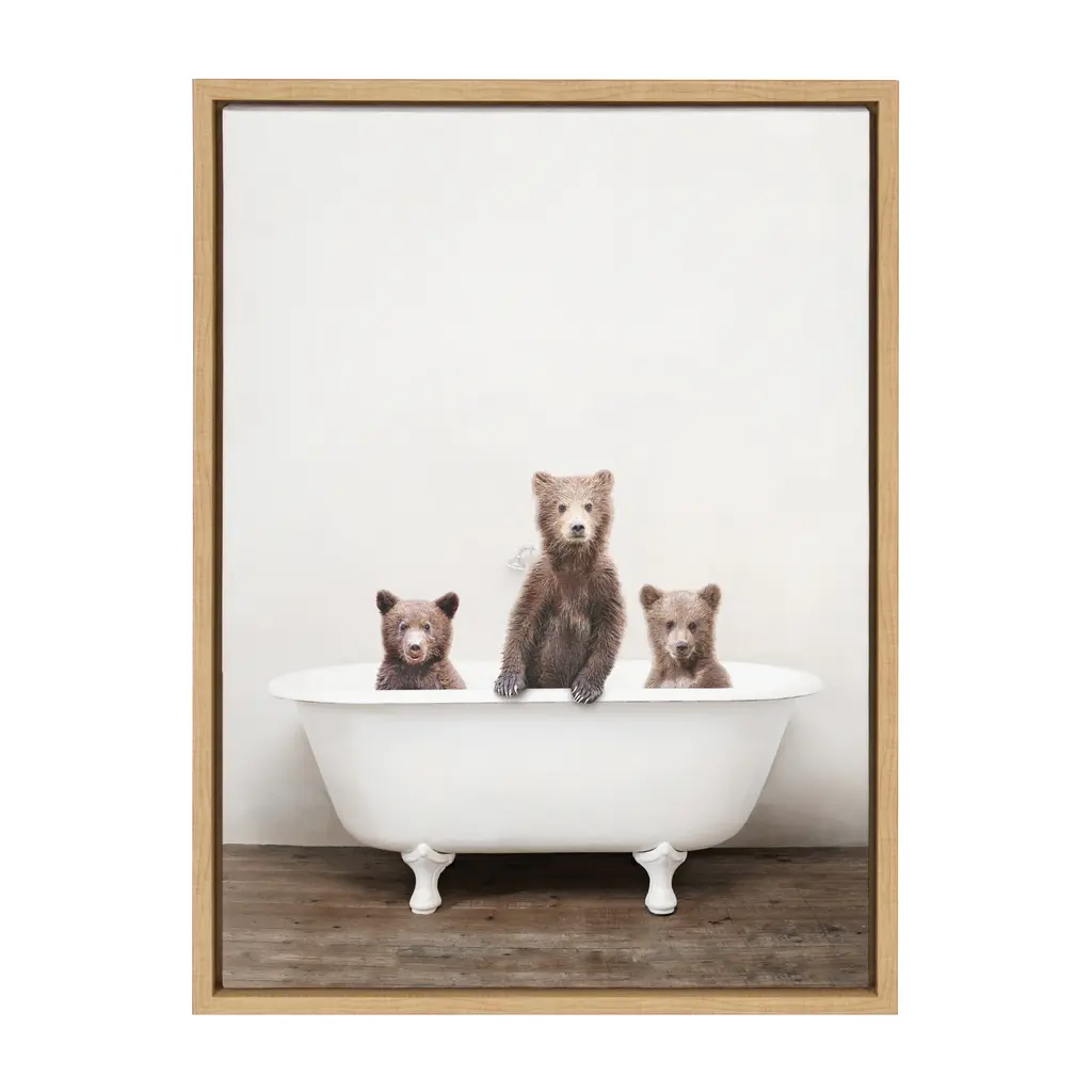 How could you not go full-heart eyes with these adorable baby bears who just want a bath? Framed in the USA in Waunakee, Wisconsin, this floating canvas art will be a pleasure to look at every day in your living room, bedroom, nursery, or any room in the home. Printed on gallery-wrapped canvas and framed with a lightweight polystyrene frame, this wall art has two hangers already attached to the MDF back for easy wall display. The outer dimensions are 24 inches tall by 18 inches wide by 1.63 inches deep. Print Name: "Three Little Bears in Vintage Bathtub"