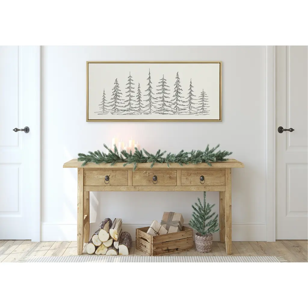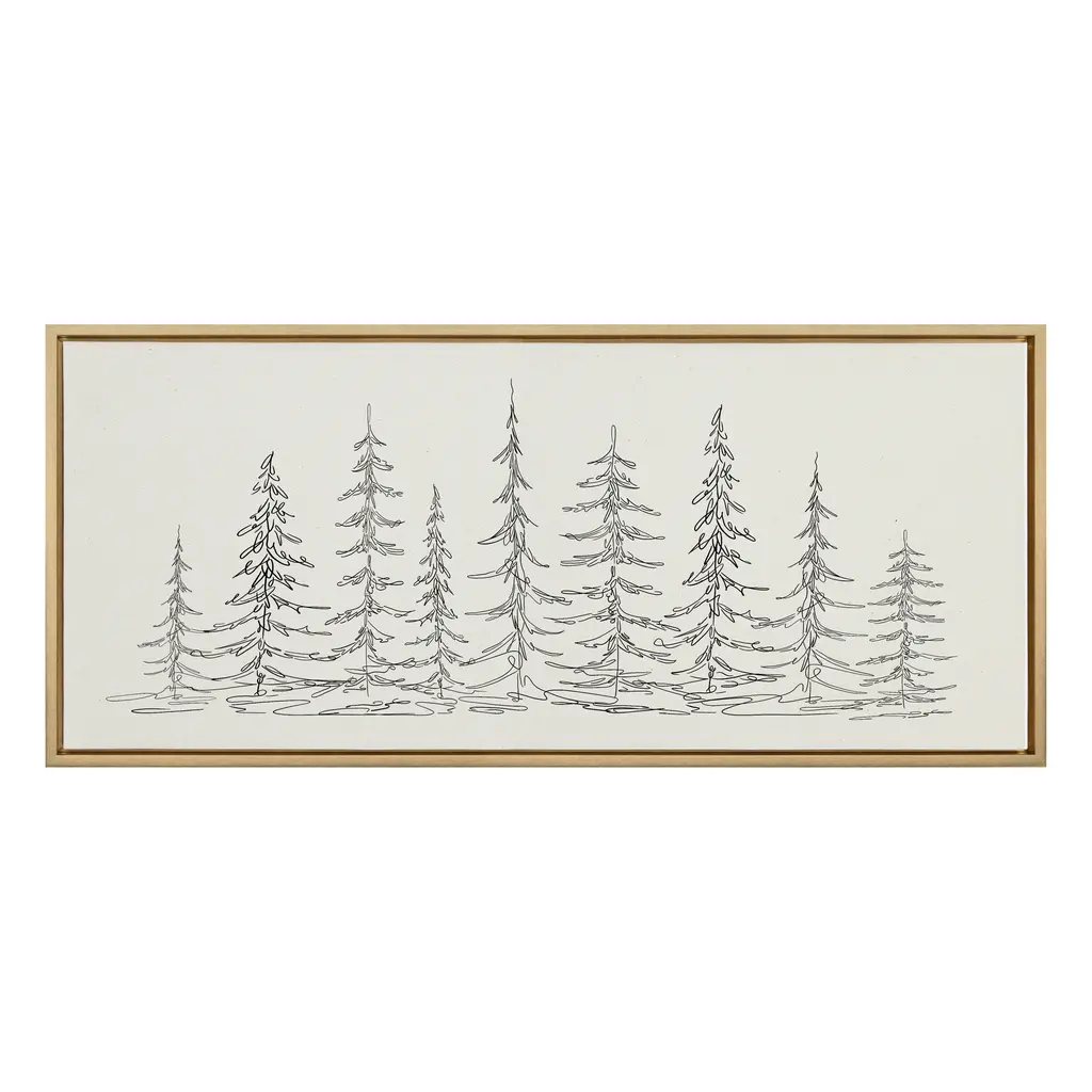 This clean, minimal art print provides your home with a unique look at nature in a sketched design. Framed in the USA in Waunakee, Wisconsin, this floating canvas art will be a pleasure to look at every day in your living room, bedroom, nursery, or any room with a modern look. This art print also makes an excellent gift for birthdays, holidays, or house-warming parties. Printed on gallery-wrapped canvas and framed with a lightweight polystyrene frame, this wall art has two hangers already attached to the MDF back for easy wall display. The outer dimensions are 30 inches tall by 30 inches wide by 1.63 inches deep. Print Name: "Minimalist Evergreen Trees Sketch"