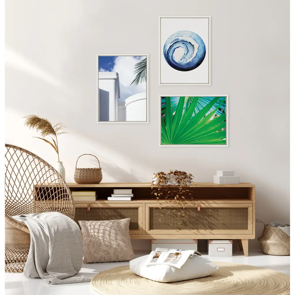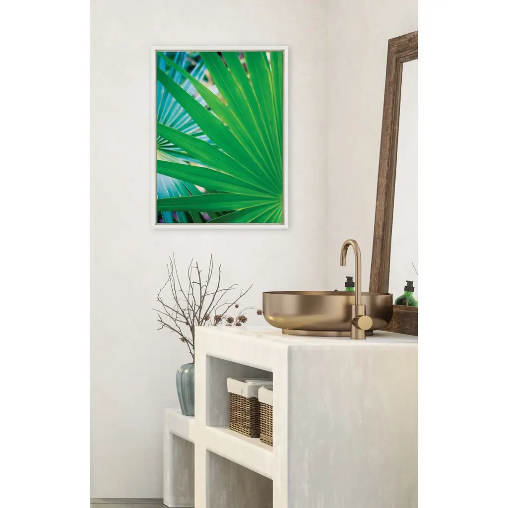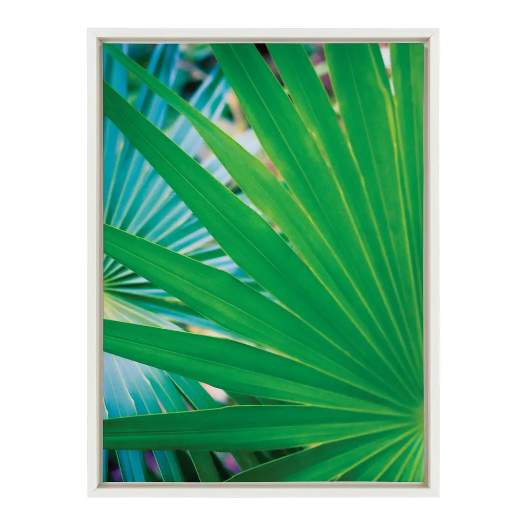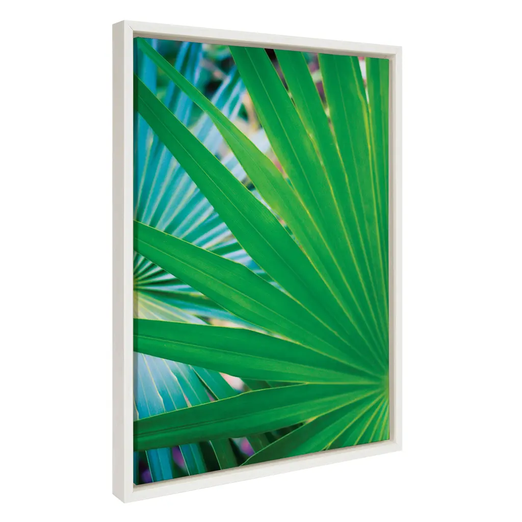Bring a touch of the outdoors inside with this striking palm tree leaf wall art. Framed in white, this Stephanie Klatt canvas print is perfect for adding a fresh and natural feel to your walls. Framed in the USA in Waunakee, Wisconsin, this modern floating canvas art is sure to bring joy to your space. Our design team curates art that will fit perfectly in any room of your home. Showcase this art in your living room, bedroom, home office, kitchen, bathroom, nursery, or anywhere you want to bring a little beauty and charm to your walls. Specializing in home décor, we are continually bringing timeless works of art for the traditional decorator as well as trend-forward pieces for that eclectic art lover. Our high-quality framed canvas art also makes excellent gifts for birthdays, holidays, or housewarming parties. Printed on gallery-wrapped canvas and framed with a simple gallery frame this wall art is easy to display on the wall and will match with any décor style. The outer dimensions are 18 inches by 24 inches by 1.6 inches. Print Name: "Tropical Palm Frond Starburst"