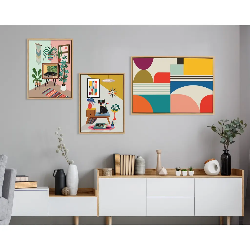 This canvas print's relaxing vibe and light color palette make it a great addition to the most calming room of your home. Framed in the USA in Waunakee, Wisconsin, this floating canvas art will be a pleasure to look at every day in your living room, bedroom, nursery, or any room in the home. This art print also makes an excellent gift for birthdays, holidays, or house-warming parties. Printed on gallery-wrapped canvas and framed with a lightweight polystyrene frame, this wall art has two hangers already attached to the MDF back for easy wall display. The outer dimensions are 24 inches by 18 inches by 1.6 inches. Print Name: "TV Cat Bed"