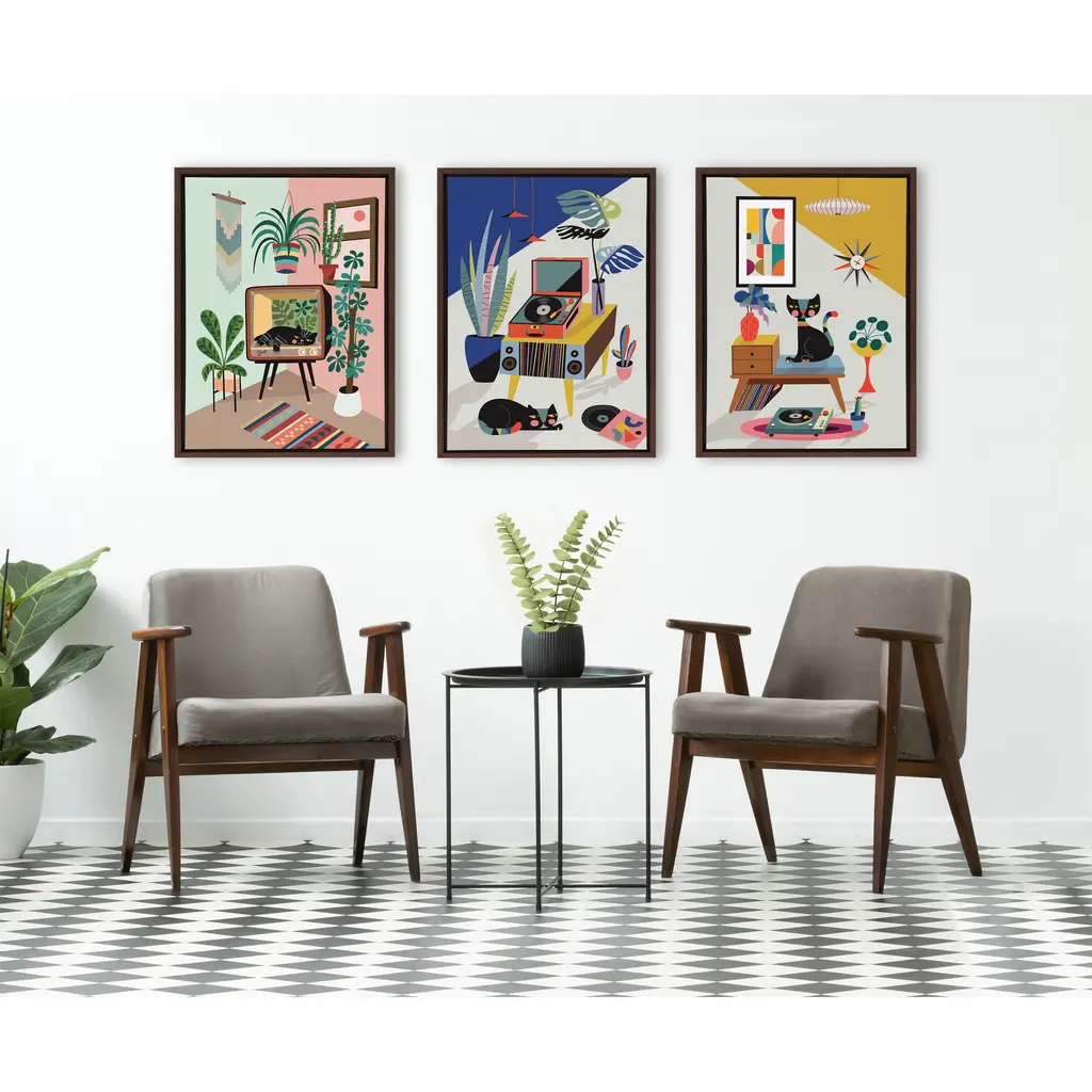 This canvas print's relaxing vibe and light color palette make it a great addition to the most calming room of your home. Framed in the USA in Waunakee, Wisconsin, this floating canvas art will be a pleasure to look at every day in your living room, bedroom, nursery, or any room in the home. This art print also makes an excellent gift for birthdays, holidays, or house-warming parties. Printed on gallery-wrapped canvas and framed with a lightweight polystyrene frame, this wall art has two hangers already attached to the MDF back for easy wall display. The outer dimensions are 24 inches by 18 inches by 1.6 inches. Print Name: "TV Cat Bed"