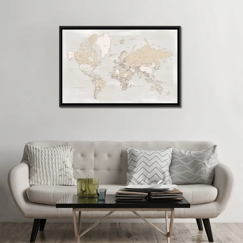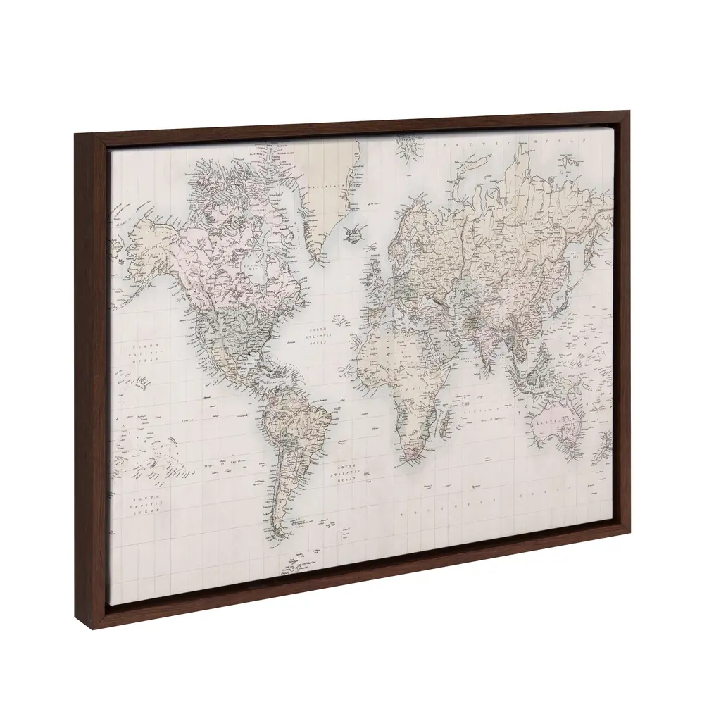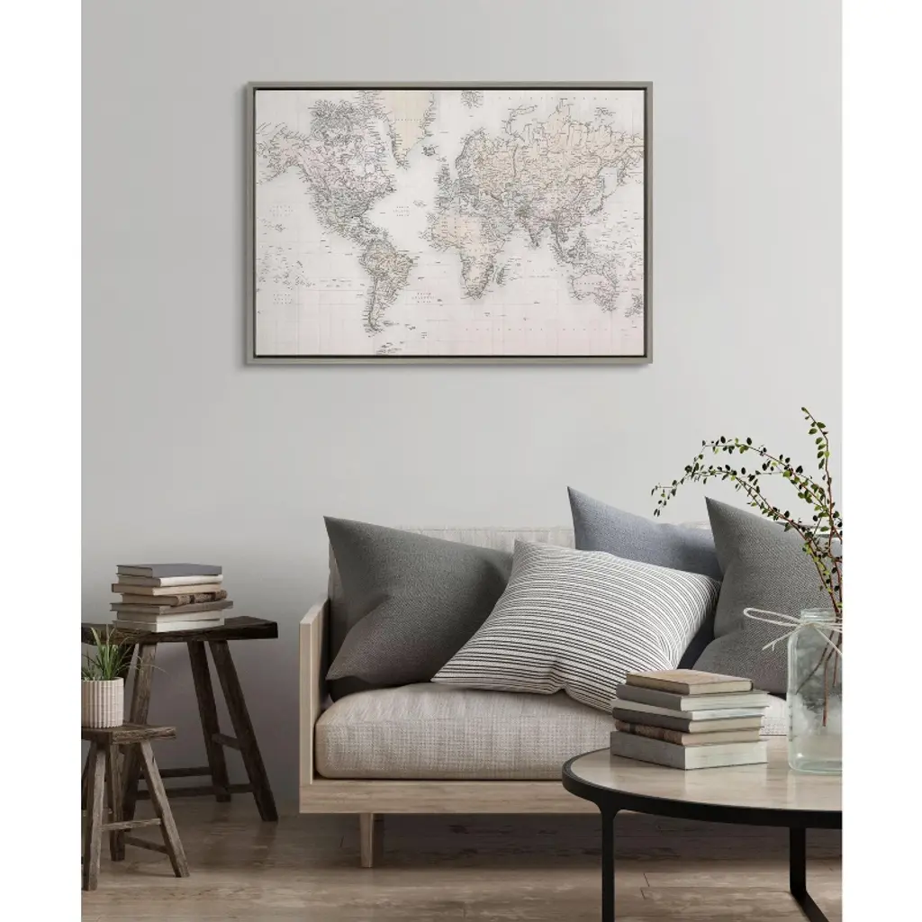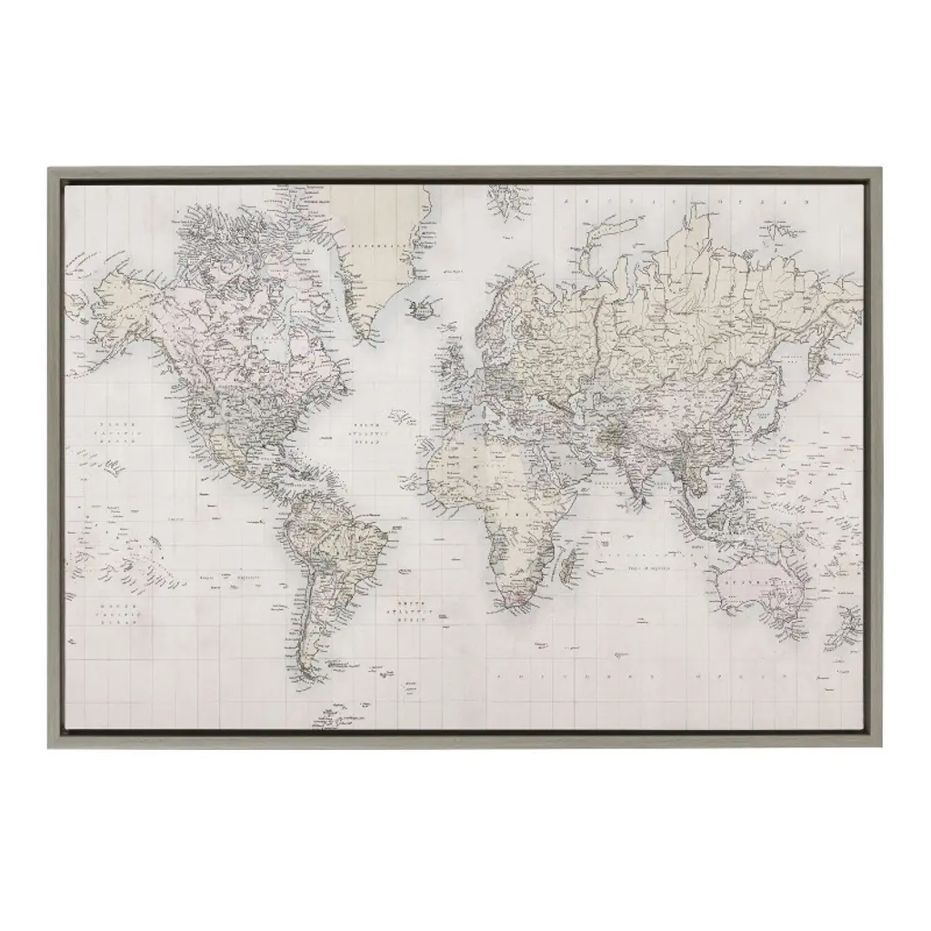 This neutral world map will inspire you to take that trip you've always wanted to take. Use it as a dream board or buy little tacks to poke the places you've been. Gorgeous in an office, dining room or right over your couch in the living room. Framed in the USA in Waunakee, Wisconsin, this floating canvas art will be a pleasure to look at every day in your living room, bedroom, nursery, or any room in the home. This art print also makes an excellent gift for birthdays, holidays, or house-warming parties. Printed on gallery-wrapped canvas and framed with a lightweight polystyrene frame, this wall art is easy to display on the wall. The outer dimensions are 24 inches by 18 inches by 1.6 inches. Print Name: ?Vintage World Map?