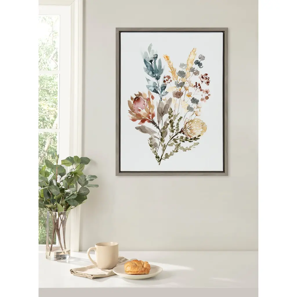 This chic floral art print is fantastic for adding elegance and sophistication to your wall art. Framed in the USA in Waunakee, Wisconsin, this floating canvas art will be a pleasure to look at every day in your living room, bedroom, office, or any room in the home. This art print also makes an excellent gift for birthdays, holidays, or house-warming parties. Printed on gallery-wrapped canvas and framed with a lightweight polystyrene frame, this wall art has two hangers already attached to the MDF back for easy wall display. The outer dimensions are 24 inches by 18 inches by 1.63 inches. Print Name: "Wildflower Bunch"