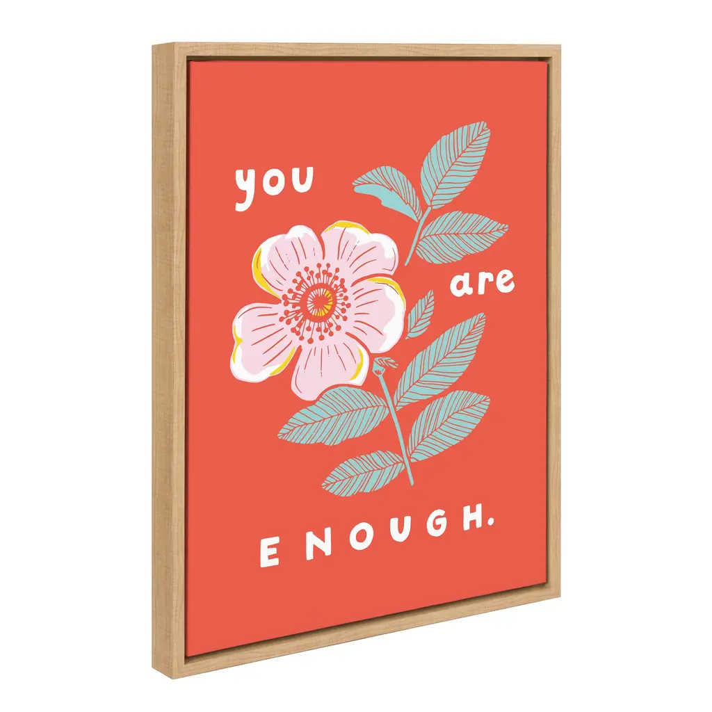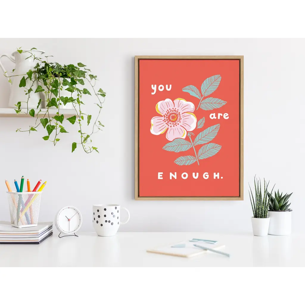 Remind yourself to be patient in your own growth and flourish in your confidence with this lovely, inspirational flower print. Framed in the USA in Waunakee, Wisconsin, this floating canvas art will be a pleasure to look at every day in your living room, bedroom, office, or any room in the home that needs a self-affirming print. This print is also an excellent gift for a birthday or holiday. Printed on gallery-wrapped canvas and framed with a lightweight polystyrene frame, this wall art has two hangers already attached to the MDF back for easy wall display. The outer dimensions are 24 inches tall by 18 inches wide by 1.63 inches deep. Print Name: "You Are Enough"