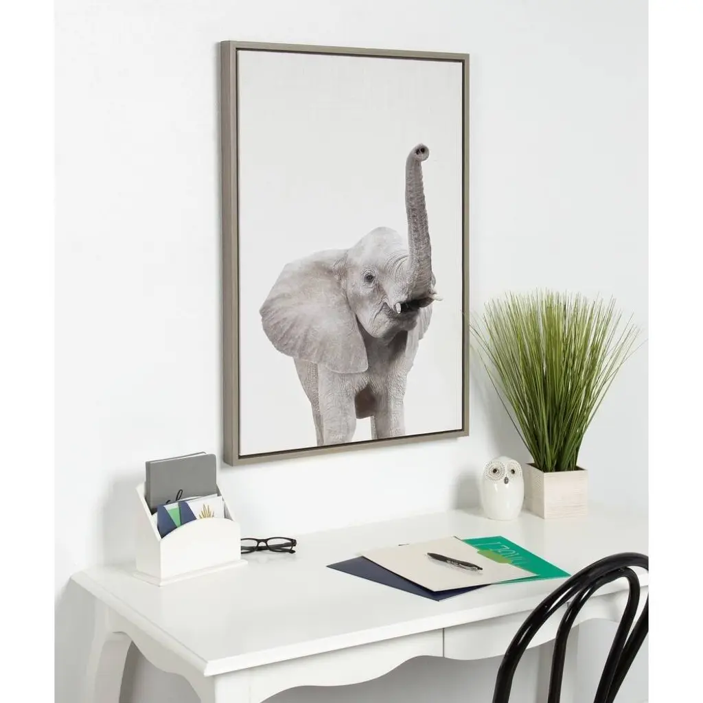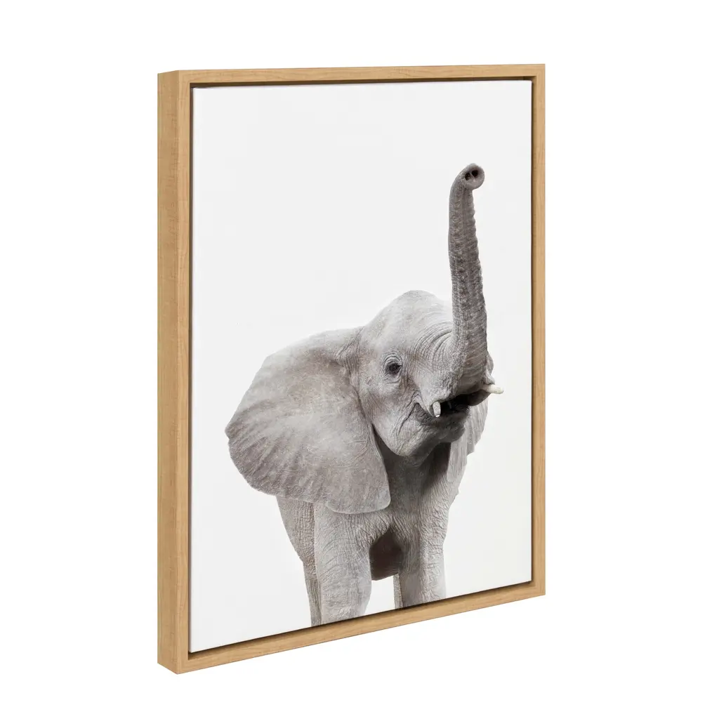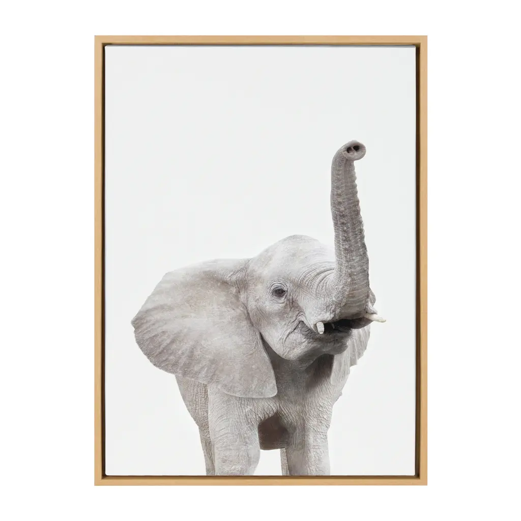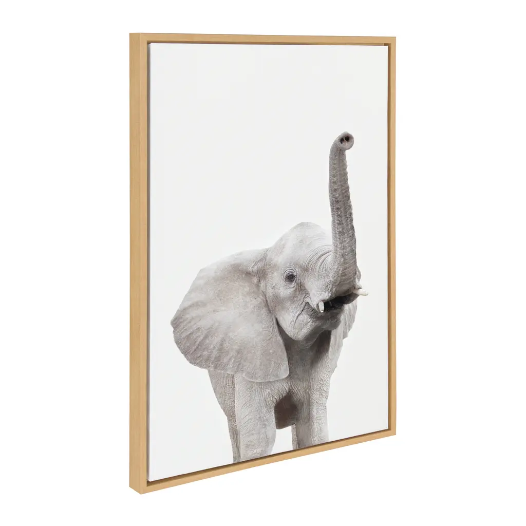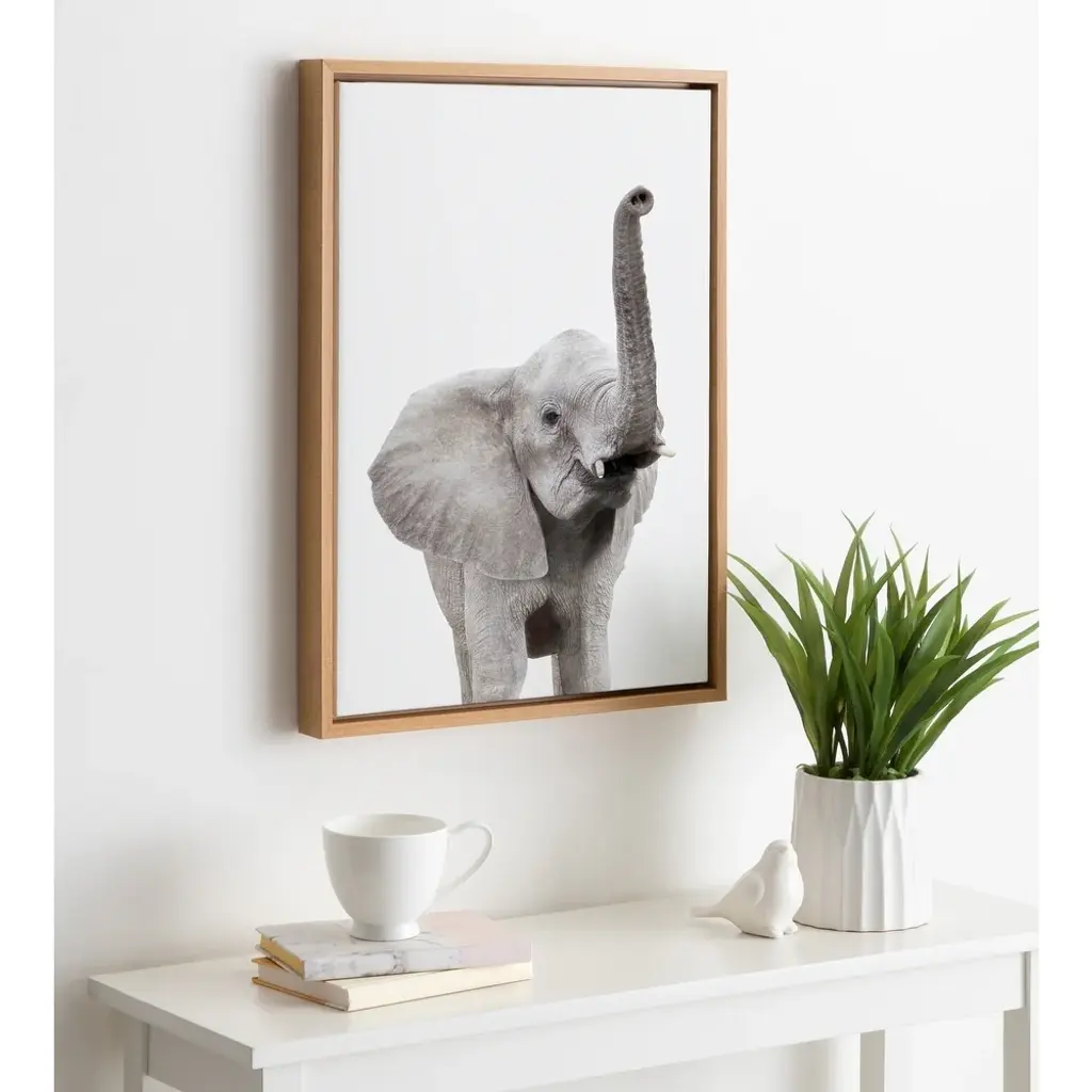 Enjoy the sheer majesty of nature along with a bit of cuteness when hanging this framed canvas art by Amy Peterson featuring a young elephant. This digital print captures the fine details of Peterson's original artwork, and the natural wood coloring of the frame contrasts elegantly with the greys hues of the elephant.