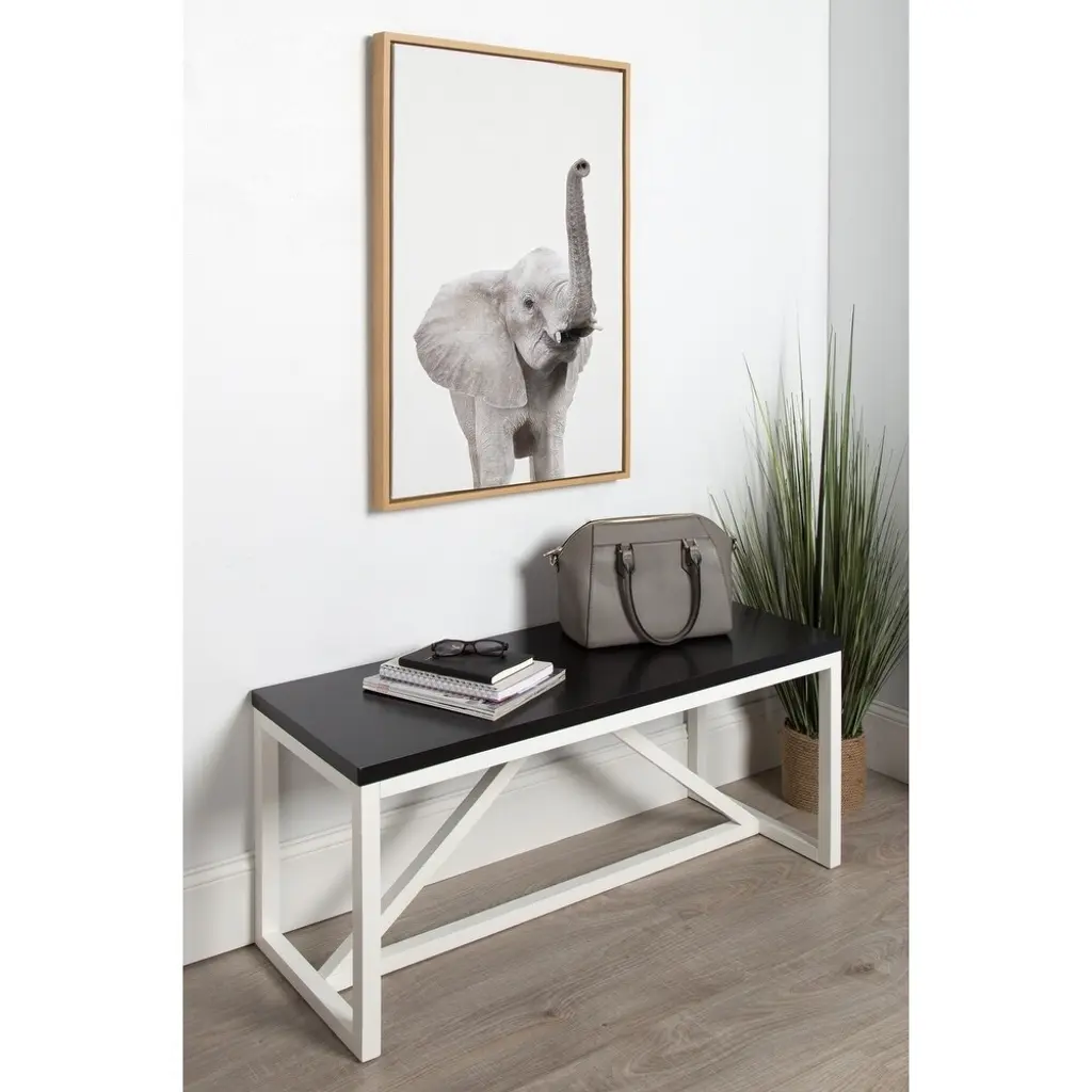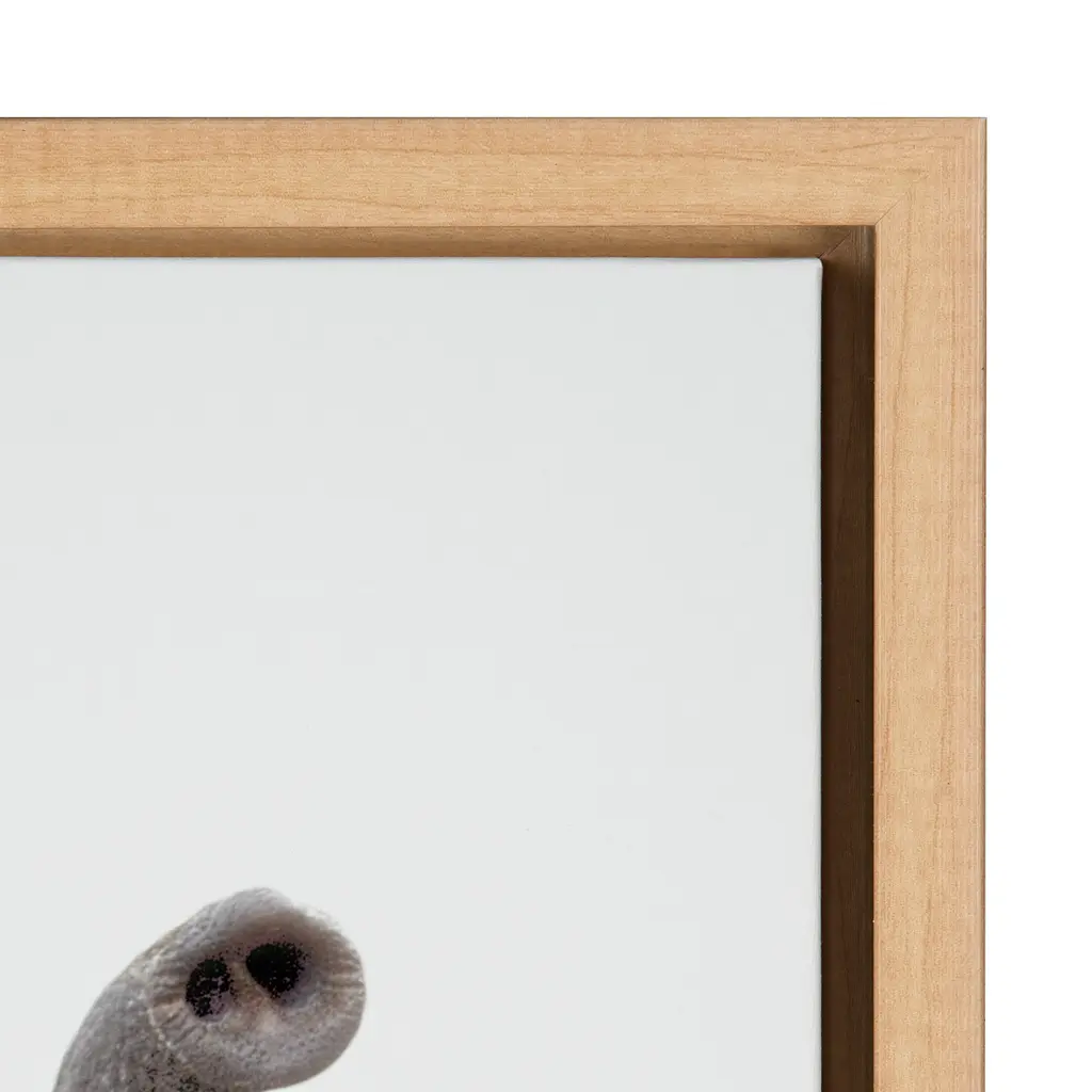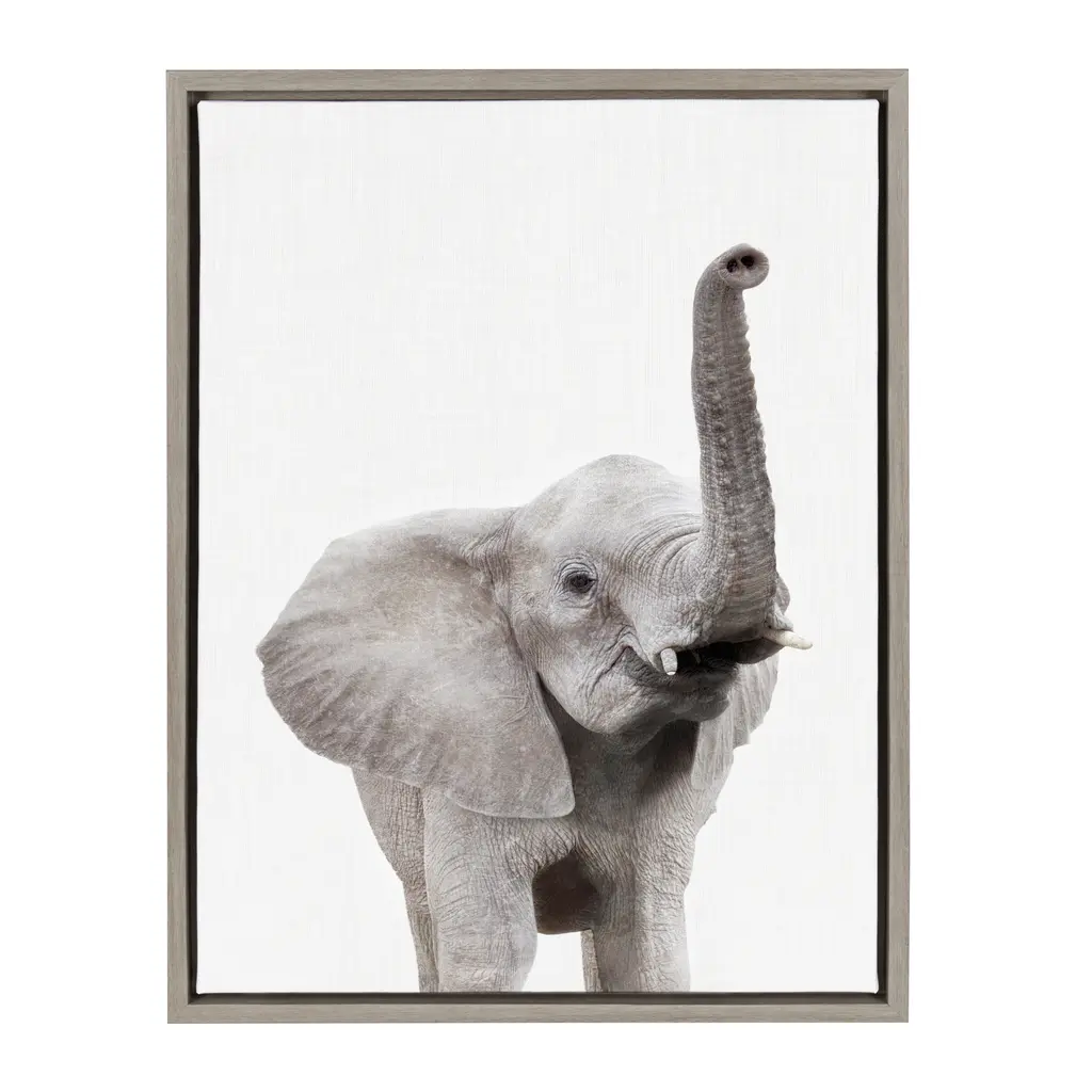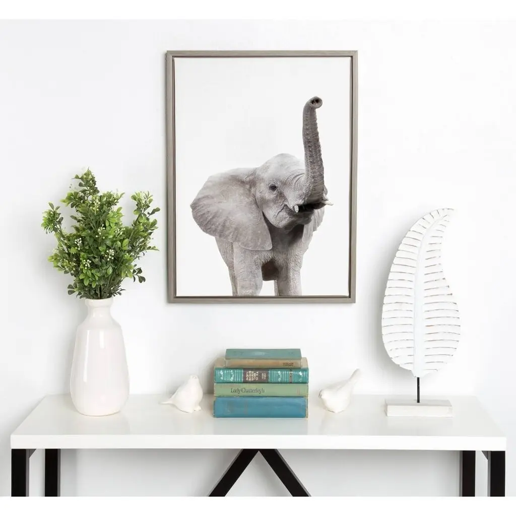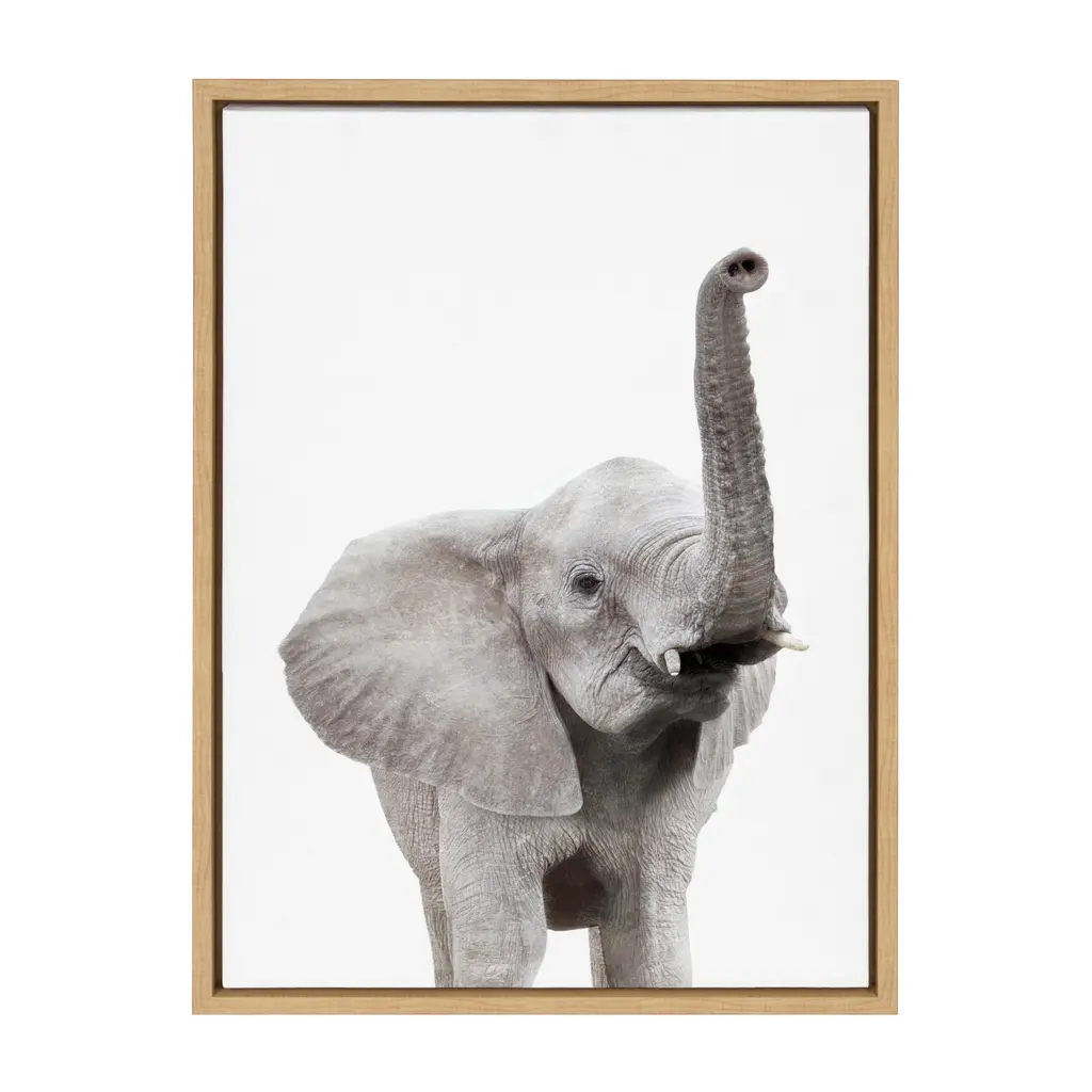Enjoy the sheer majesty of nature along with a bit of cuteness when hanging this framed canvas art by Amy Peterson featuring a young elephant. This digital print captures the fine details of Peterson's original artwork, and the natural wood coloring of the frame contrasts elegantly with the greys hues of the elephant.
