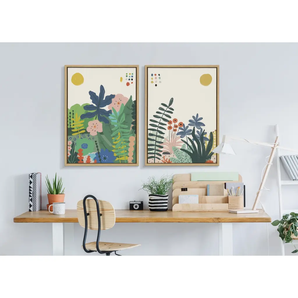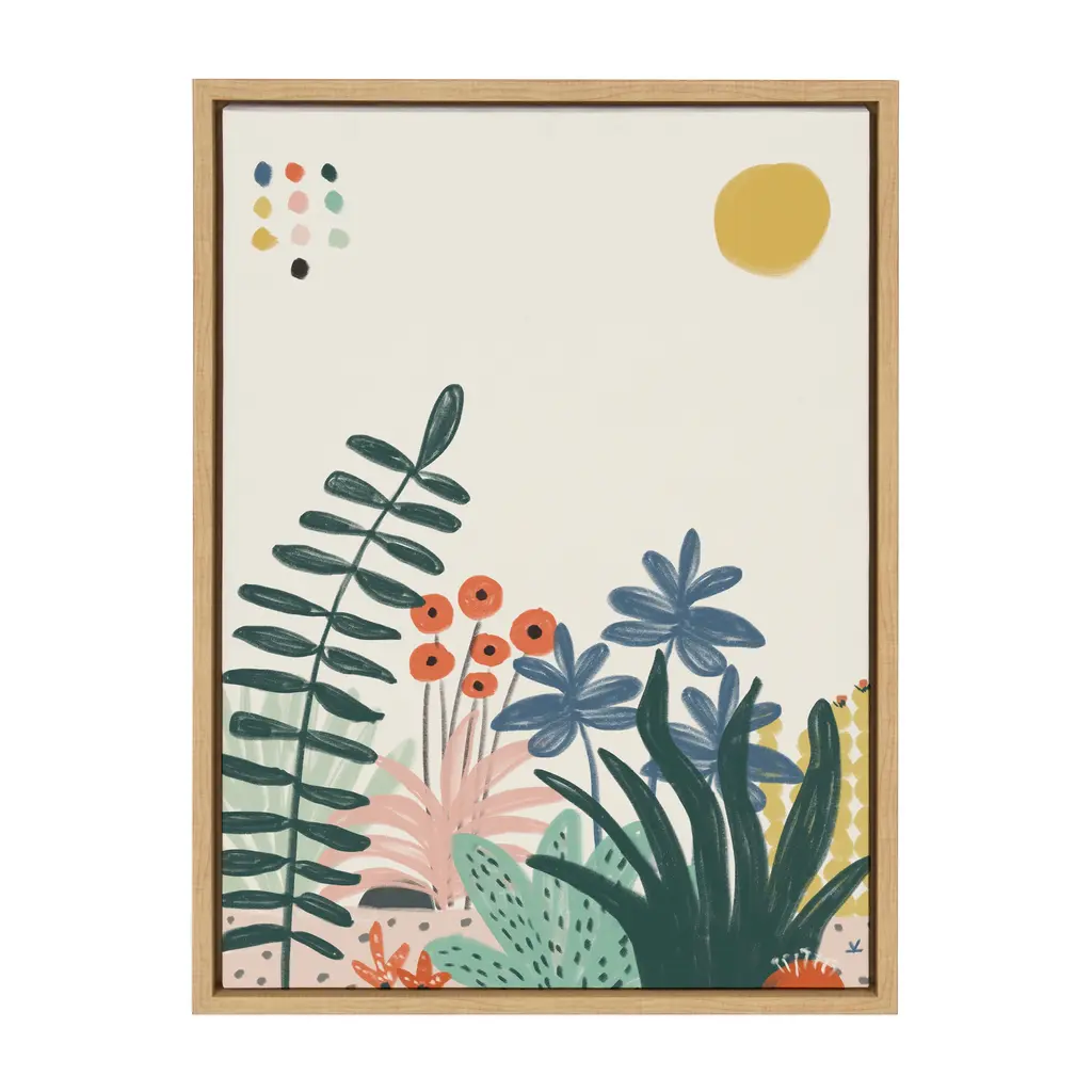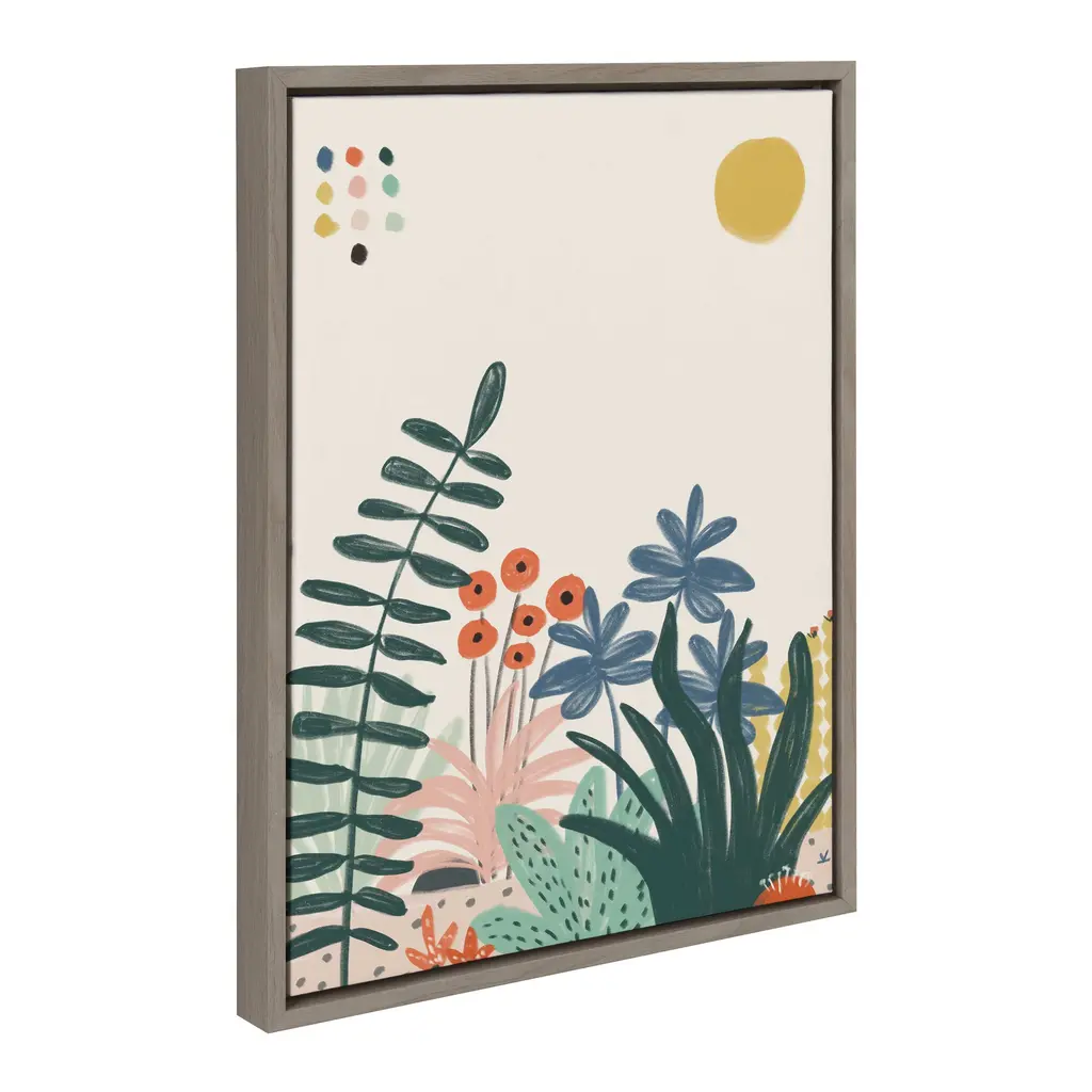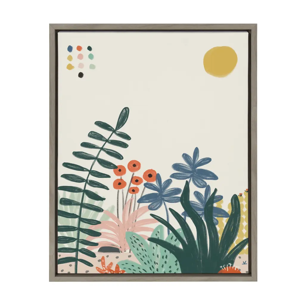 Create a colorful and creative space with this beautiful floral art print on your wall. Framed in the USA in Waunakee, Wisconsin, this floating canvas art will be a pleasure to look at every day in your living room, bedroom, nursery, or any room in the home. This art print also makes an excellent gift for birthdays, holidays, or house-warming parties. Printed on gallery-wrapped canvas and framed with a lightweight polystyrene frame, this wall art has two hangers already attached to the MDF back for easy wall display. The outer dimensions are 24 inches by 18 inches by 1.63 inches. Print Name: "Zen Garden 2"