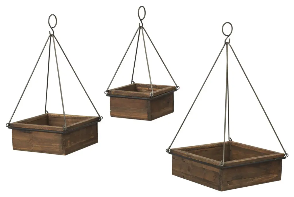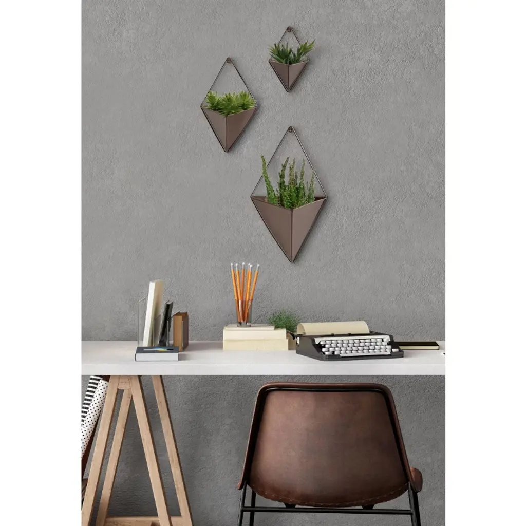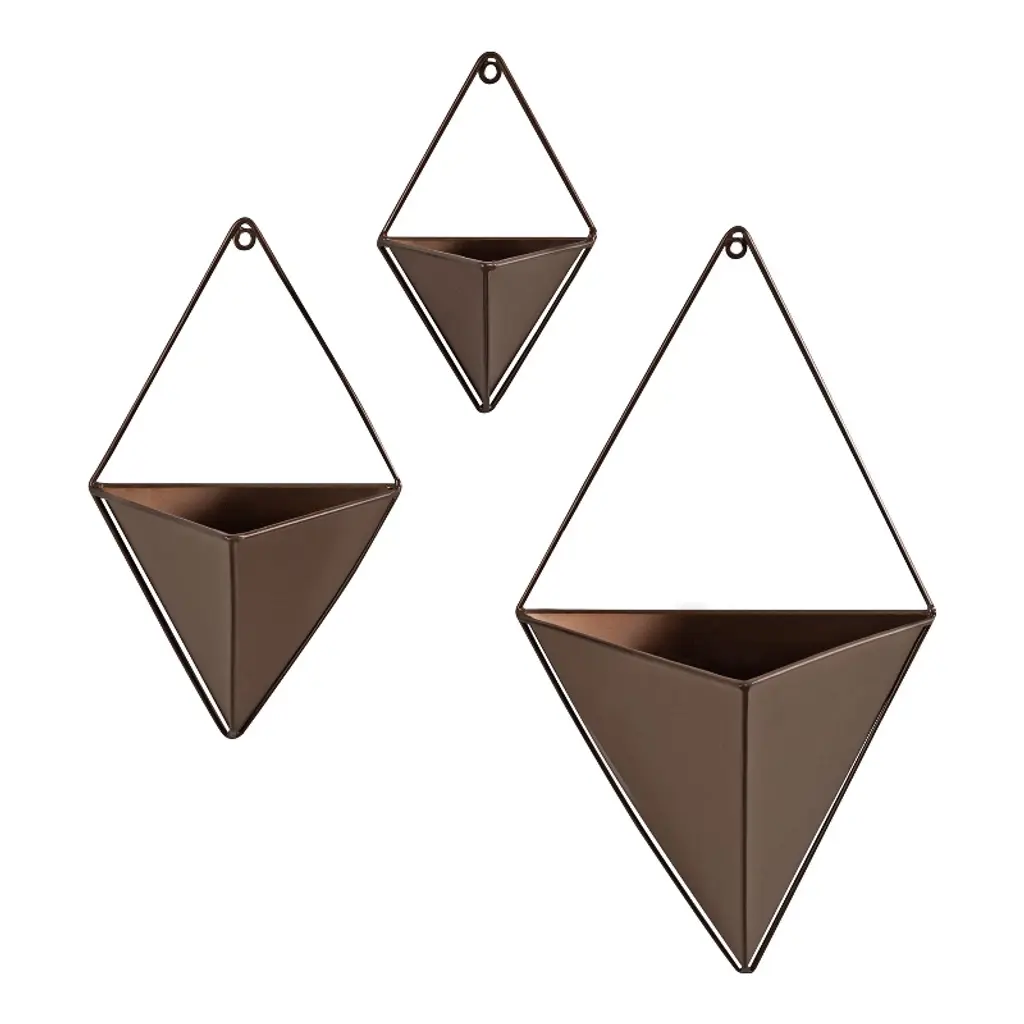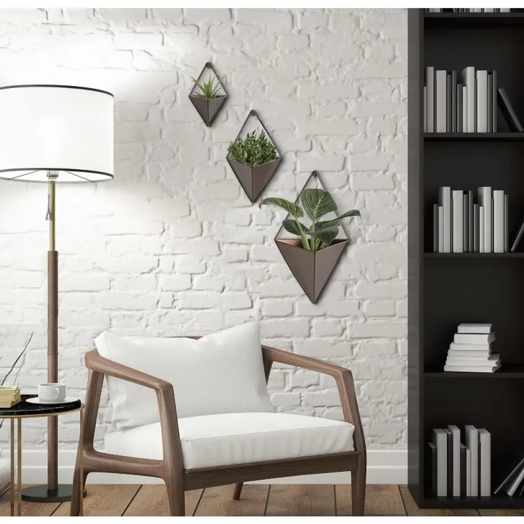 Mix your love of nature and industrial decor with the beautiful Tulla Planter set from Kate and Laurel. This set of three takes inspiration from the modern industrial design movement. Each hanging planter includes a geometric and prismatic shape with a clean, black finish. This modern finish allows this set to easily mesh with the rest of your home decor, with the black finish adaptable to any living room, bedroom, bathroom, entryway, or dining room. The prism shape elevates these house planters by adding dimension to your standard wall decor, showing off your personal style while instantly drawing the eye. These planters in particular are made with small faux plants in mind, although it is possible to use real plants with the right protective liner. Hang this set of planters together as one dynamic wall display or install them all throughout your home for a cohesive decor aesthetic. They're ready out of the box with no assembly required, plus they hang in seconds with metal eyelet hangers.