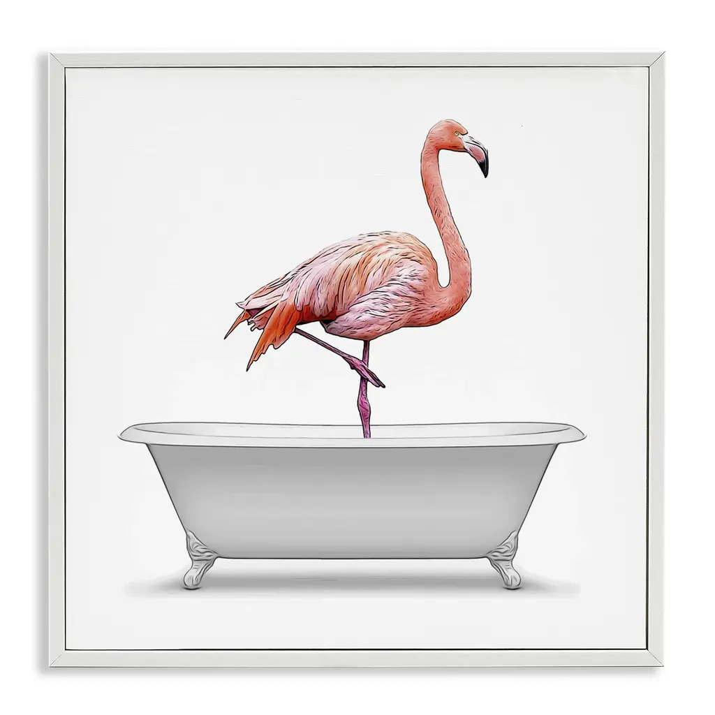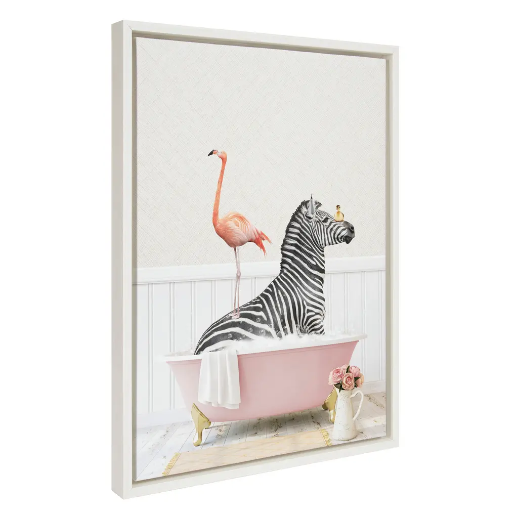 Make a bold impression on your house guests with this whimsical animal art piece by artist Amy Peterson. With its sleek modern frame, this fun, contemporary design is the perfect art piece to add to your home decor collection. Framed in the USA in Waunakee, Wisconsin, this floating canvas art will be a pleasure to look at every day in your living room, bedroom, nursery, or any room in the home. This art print also makes an excellent gift for birthdays, holidays, or house-warming parties. Printed on gallery-wrapped canvas and framed with a lightweight polystyrene frame, this wall art is easy to display on the wall. The outer dimensions are 18 inches by 24 inches by 1.6 inches. Print Name: "Zebra and Flamingo in Cottage Rose Bath"