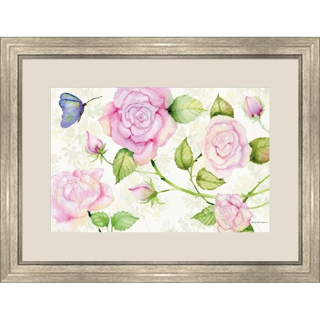 Floral Delight VI Butterflies by Kathleen Parr McKenna is a high quality piece of framed artwork. The finished size of this piece is 26" X 20". It has a Classic Champagne Silver with Ornate Inner Edge frame, is single matted and finished with high quality Acrylic Plexiglass. 100% Satisfaction Guaranteed.