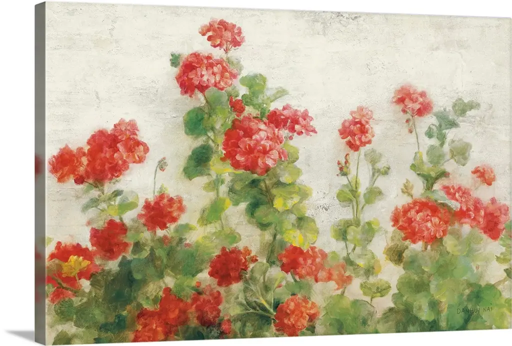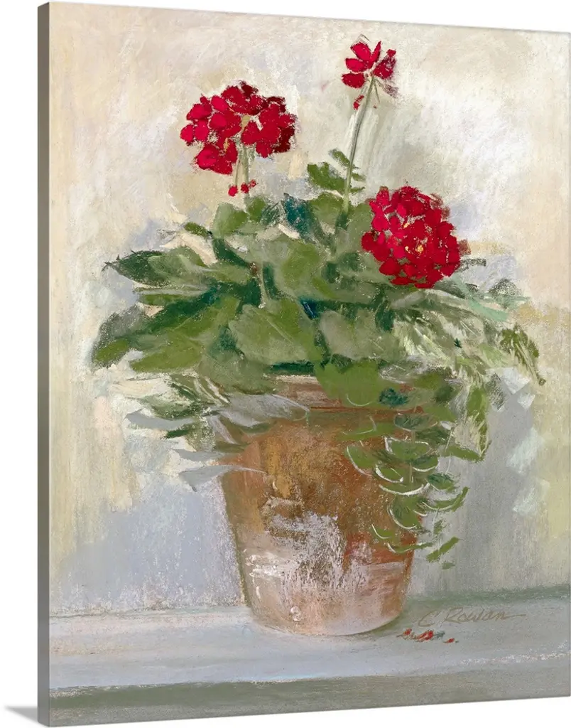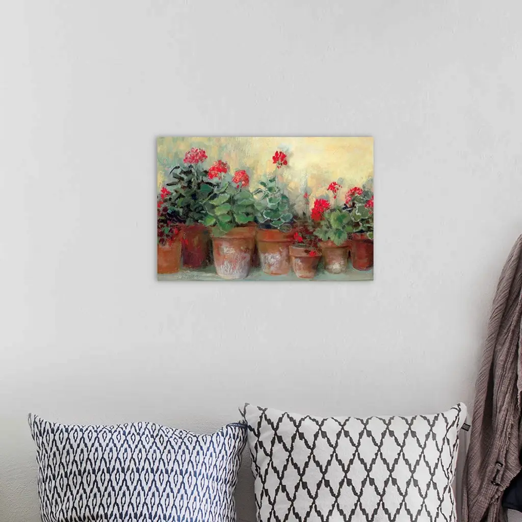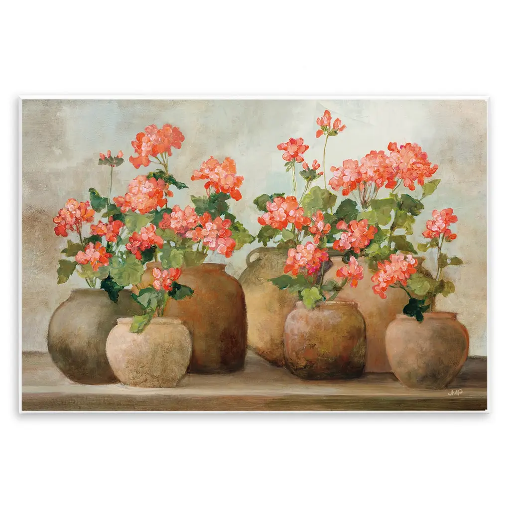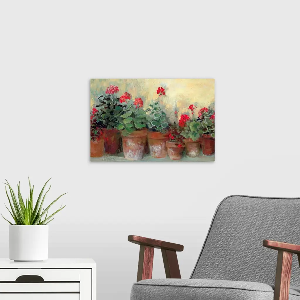 Painting of a row of flower pots varying in size. Each flower pot contains bold colored flowers and greenery.