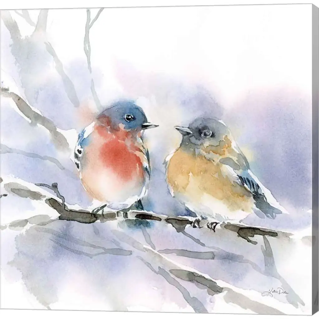 Bluebird Pair by Katrina Pete is a high quality piece of canvas artwork. The finished size of this piece is 24" X 24", and it has a depth 1.5". There is a UV protective coating over the entire image, and it is ready to hang on your wall with a standard drywall screw (not included). 100% Satisfaction Guaranteed.