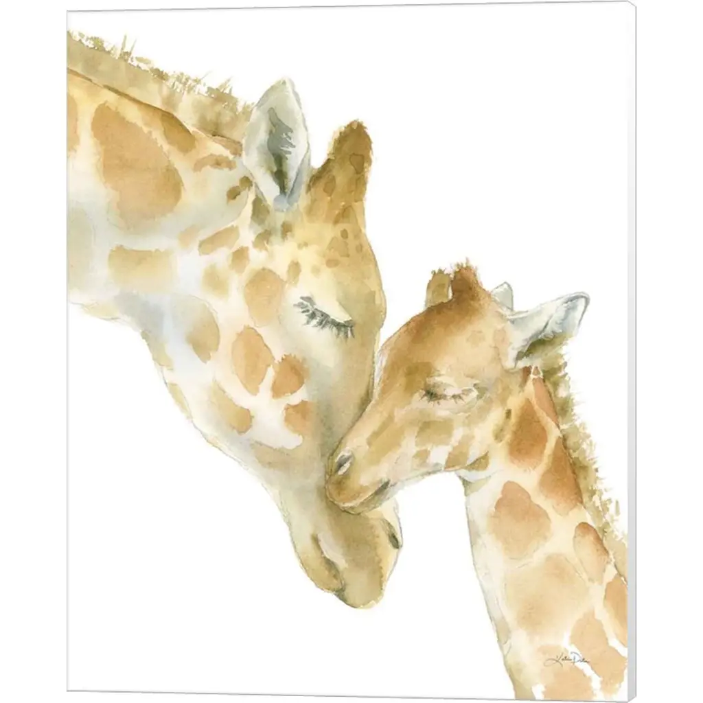 Giraffe Love on White by Katrina Pete is a high quality piece of canvas artwork. The finished size of this piece is 16" X 20", and it has a depth 0.75" with white painted sides. There is a UV protective coating over the entire image, and it is ready to hang on your wall with a standard drywall screw (not included). 100% Satisfaction Guaranteed.