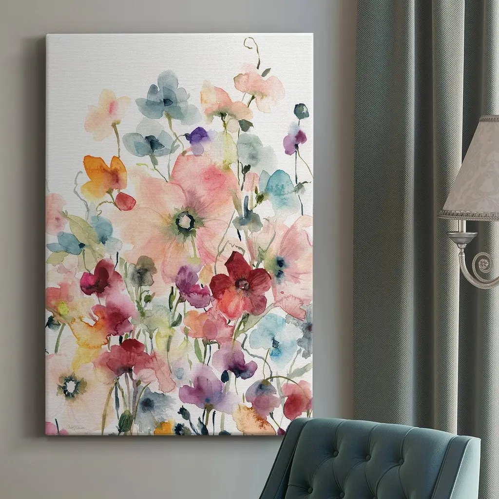 Hummingbird Meadow by Katrina Pete is a high quality piece of canvas artwork. The finished size of this piece is 12" X 12", and it has a depth 1.5". There is a UV protective coating over the entire image, and it is ready to hang on your wall with no hardware required. 100% Satisfaction Guaranteed.