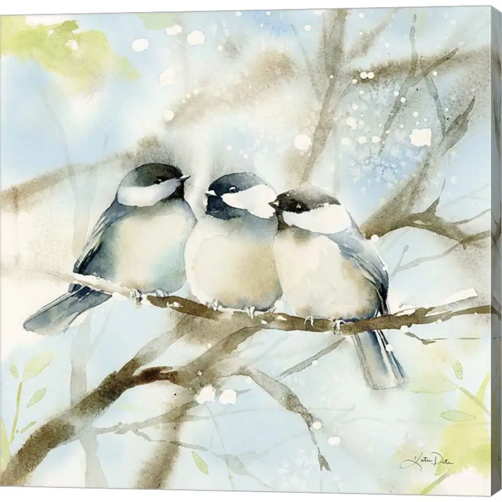 Three Chickadees in Spring Sq by Katrina Pete is a high quality piece of canvas artwork. The finished size of this piece is 12" X 12", and it has a depth 1.5". There is a UV protective coating over the entire image, and it is ready to hang on your wall with a standard drywall screw (not included). 100% Satisfaction Guaranteed.