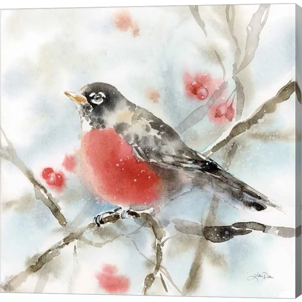 Winter Robin by Katrina Pete is a high quality piece of canvas artwork. The finished size of this piece is 24" X 24", and it has a depth 1.5". There is a UV protective coating over the entire image, and it is ready to hang on your wall with a standard drywall screw (not included). 100% Satisfaction Guaranteed.