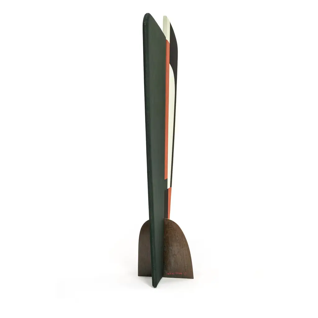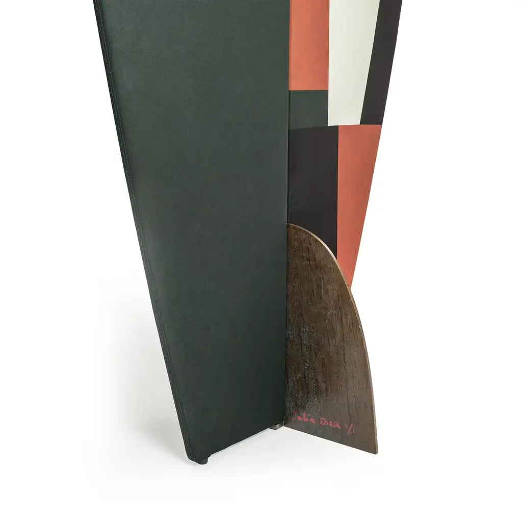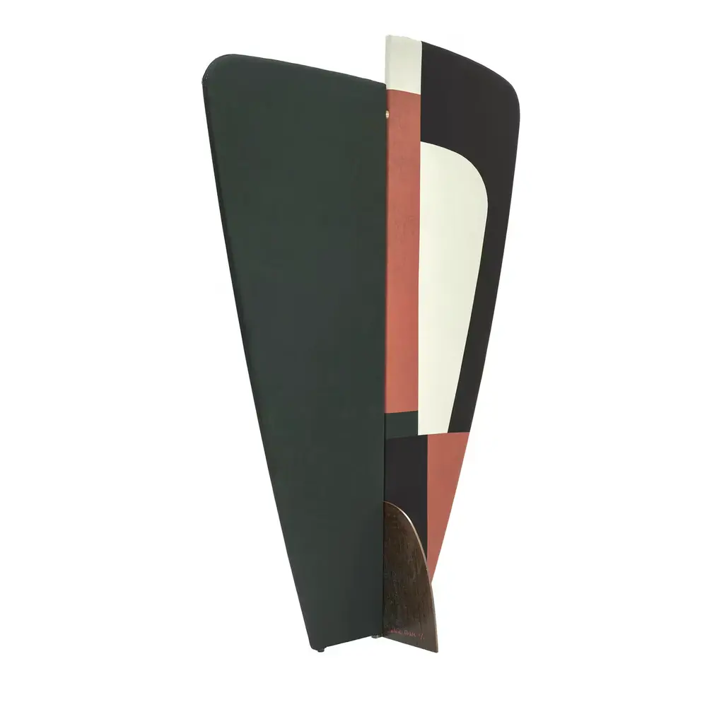 Elegant in its simplicity, this screen created by designer Julia Dozsa is an experiment in three dimensions. Marked by a tapered silhouette with a narrow base and rounded corners, this dual-panel screen subverts traditional screen design with its abstract charm. The asymmetric screen panels have a wooden frame covered with a jersey fabric, half in pine green and half in black with red and white geometric forms inspired by Kazimir Malevich's paintings. Two magnets covered by brass rings connect the panels while the semi-oval corten steel base with rust-like finish supports the entire piece. This piece is a prototype handcrafted and signed by the designer and is immediately available for order.
