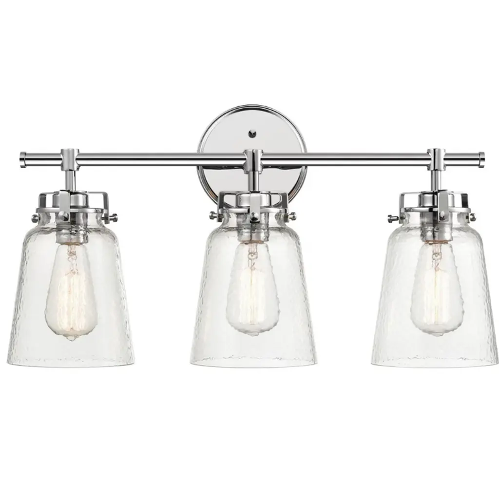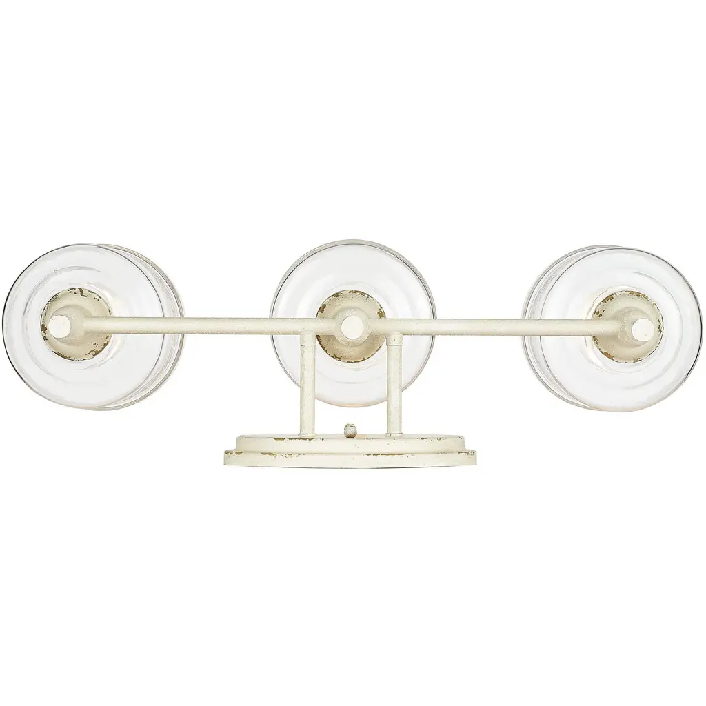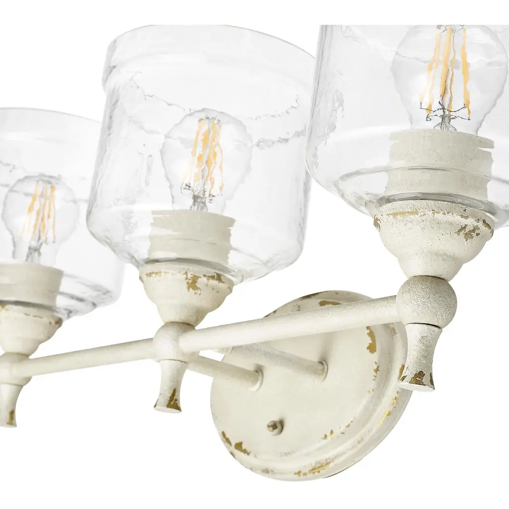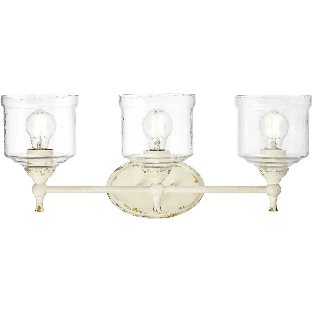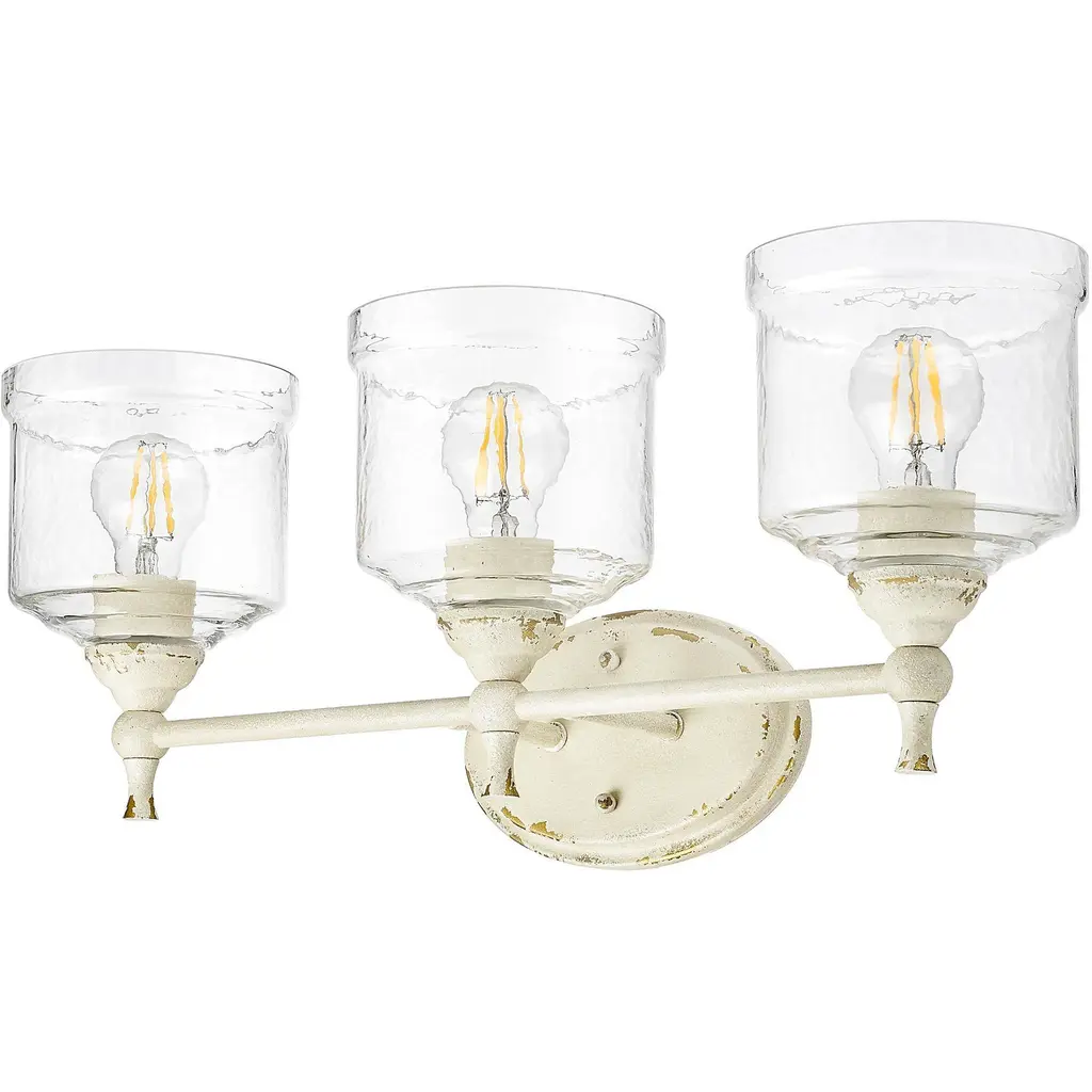 Bring traditional charm into your home with the Golden Lighting Keating 3-light Vanity in Antique Ivory. Featuring a glass shade and a classic Antique Ivory frame, it creates a welcoming atmosphere. This stunning glass shade offers a Hammered Water Glass finish, characterized by an irregular texture that beautifully distorts and refracts light, adding a dramatic elegance. The Antique Ivory finish evokes the character of a treasured heirloom, rich with distressed details that reveal glints of gold beneath, providing a romantic touch to any space. Brighten up bathrooms with dedicated lighting that flatters while providing practical task illumination. The fixture is damp location rated, making it suitable for covered areas with occasional moisture like bathrooms and laundry rooms. Overall Dimensions: 23.88"W x 9.75"H x 7.5"D. Requires 3 E26 Medium base bulbs (not included), maximum 100 wattage per bulb. Perfect for creating a cozy, authentic atmosphere, this fixture combines quality craftsmanship with timeless design.