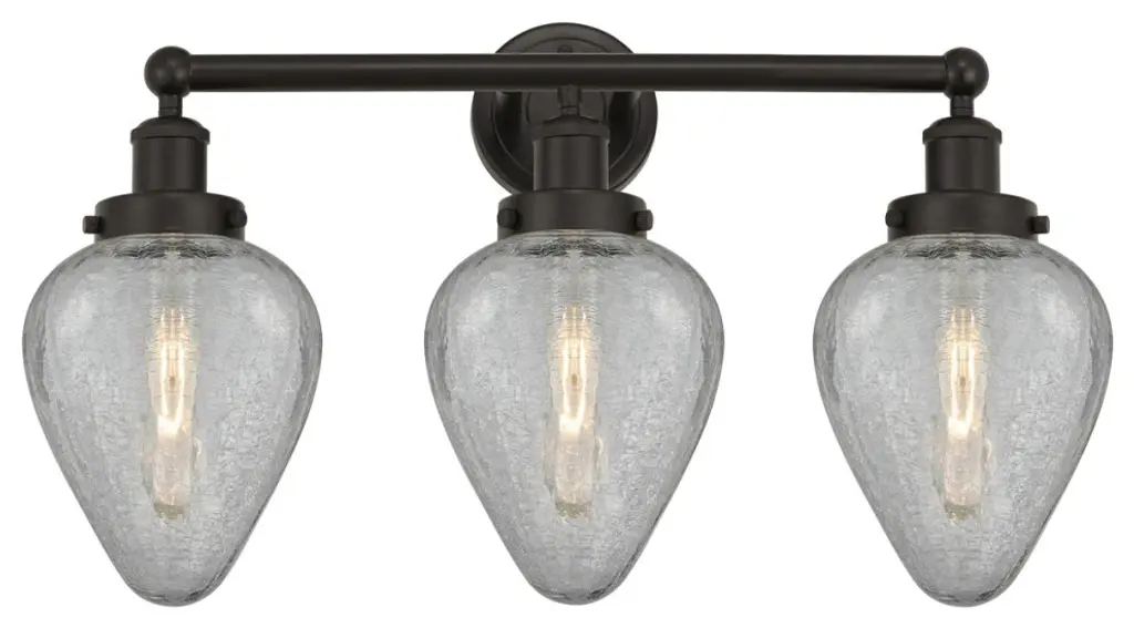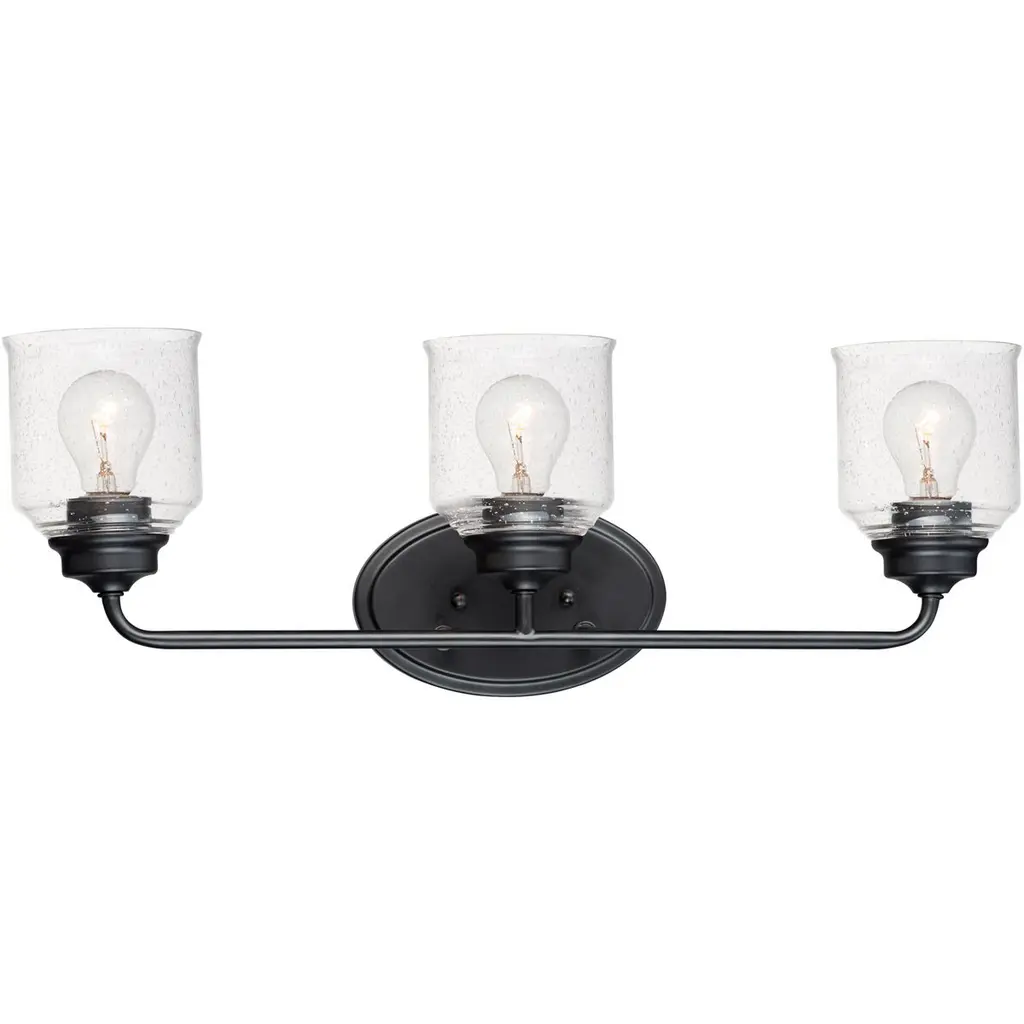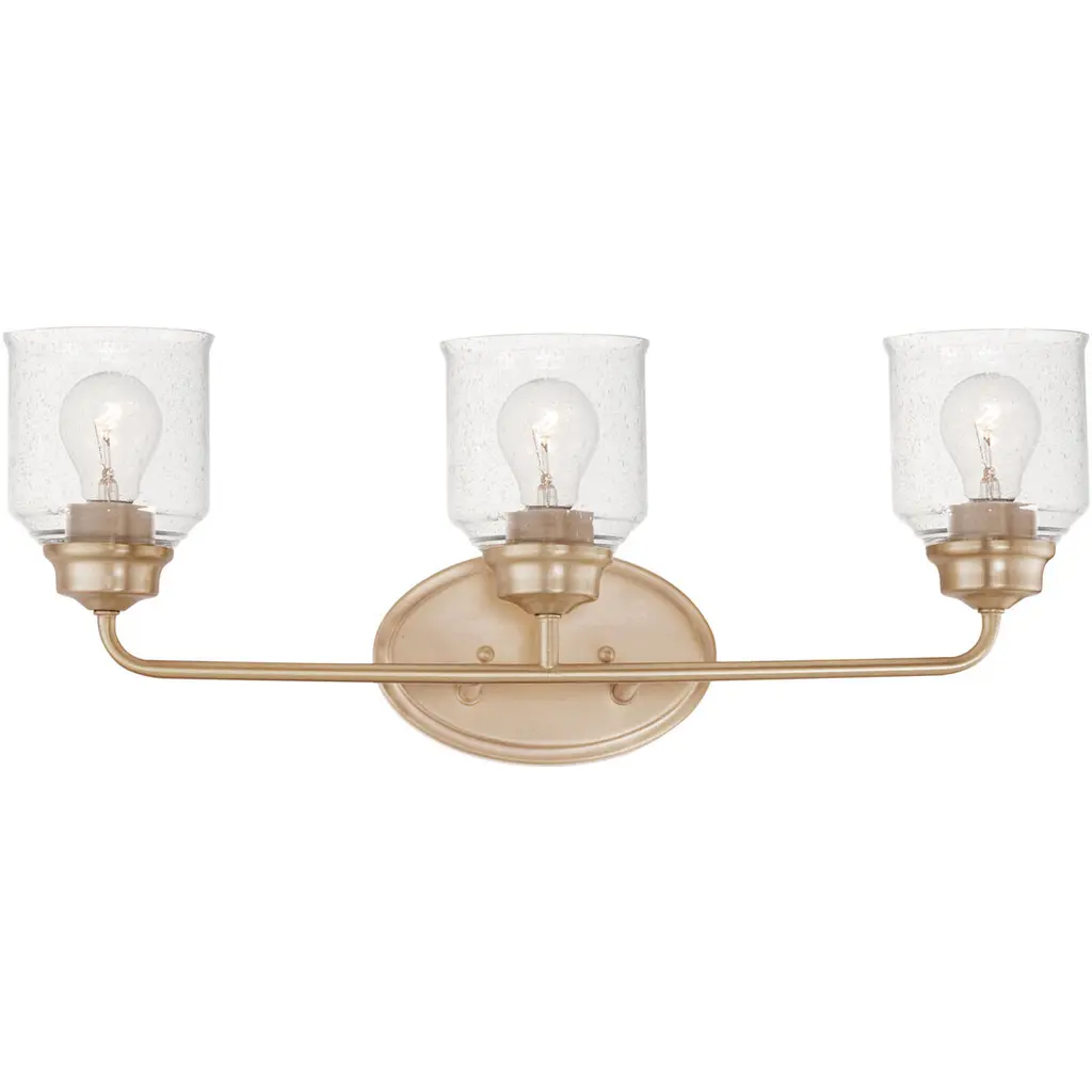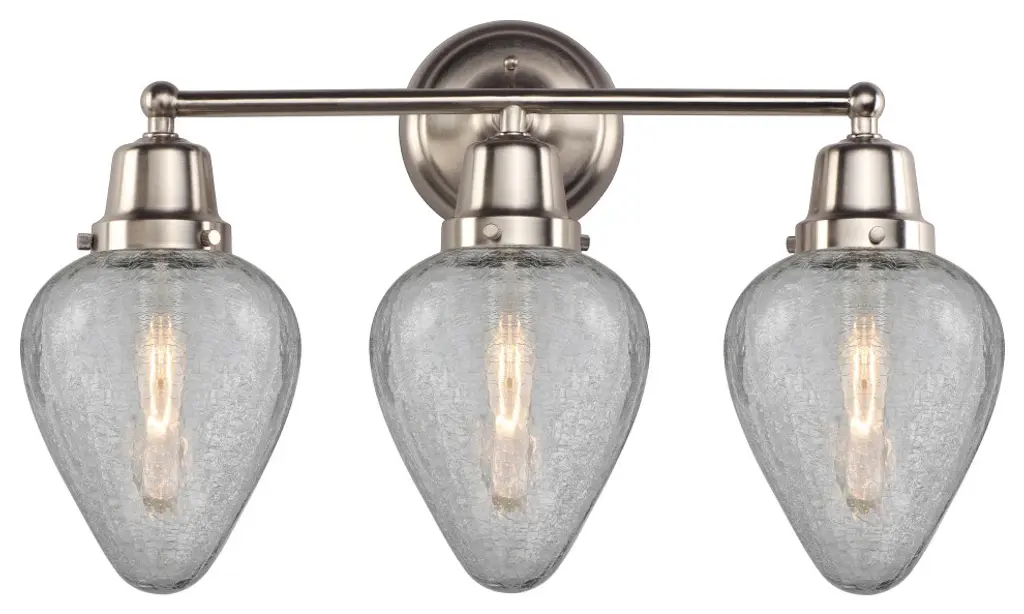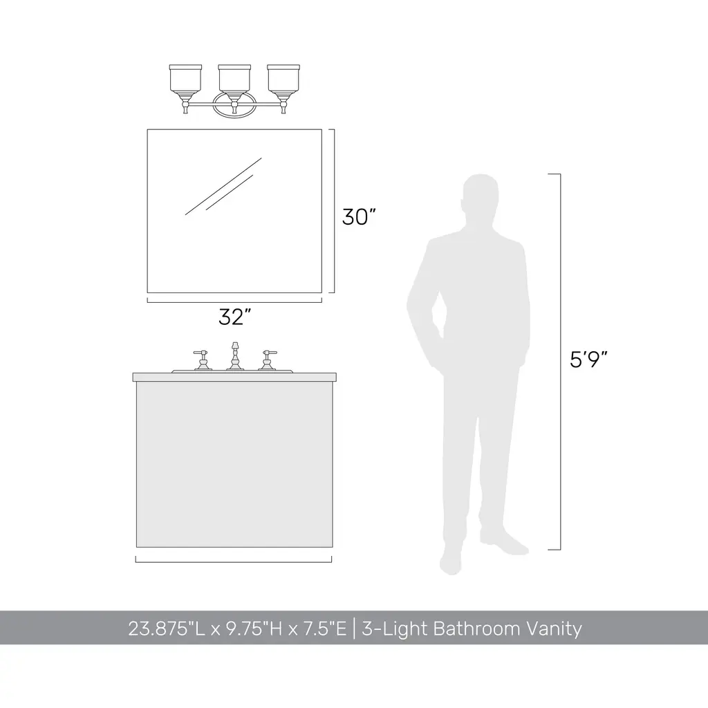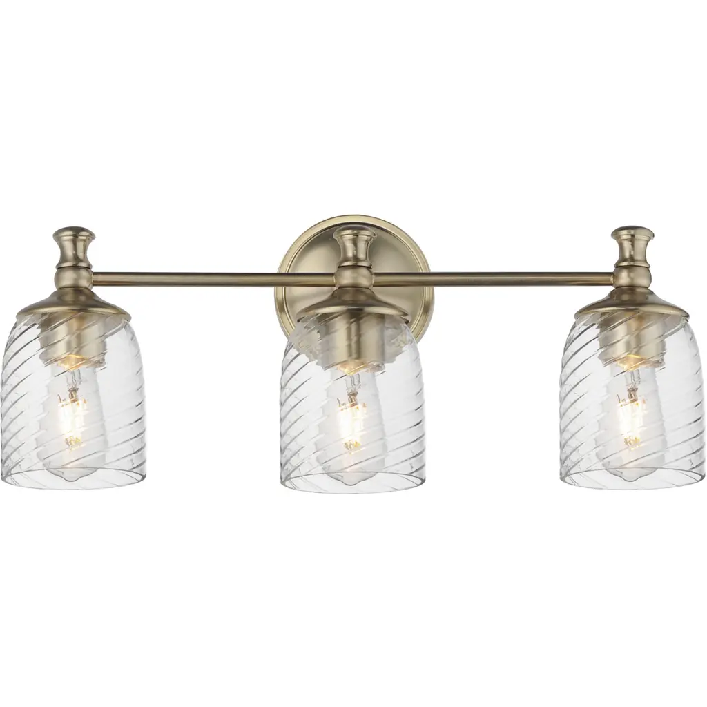 Bring traditional charm into your home with the Golden Lighting Keating 3-light Vanity in Antique Ivory. Featuring a glass shade and a classic Antique Ivory frame, it creates a welcoming atmosphere. This stunning glass shade offers a Hammered Water Glass finish, characterized by an irregular texture that beautifully distorts and refracts light, adding a dramatic elegance. The Antique Ivory finish evokes the character of a treasured heirloom, rich with distressed details that reveal glints of gold beneath, providing a romantic touch to any space. Brighten up bathrooms with dedicated lighting that flatters while providing practical task illumination. The fixture is damp location rated, making it suitable for covered areas with occasional moisture like bathrooms and laundry rooms. Overall Dimensions: 23.88"W x 9.75"H x 7.5"D. Requires 3 E26 Medium base bulbs (not included), maximum 100 wattage per bulb. Perfect for creating a cozy, authentic atmosphere, this fixture combines quality craftsmanship with timeless design.