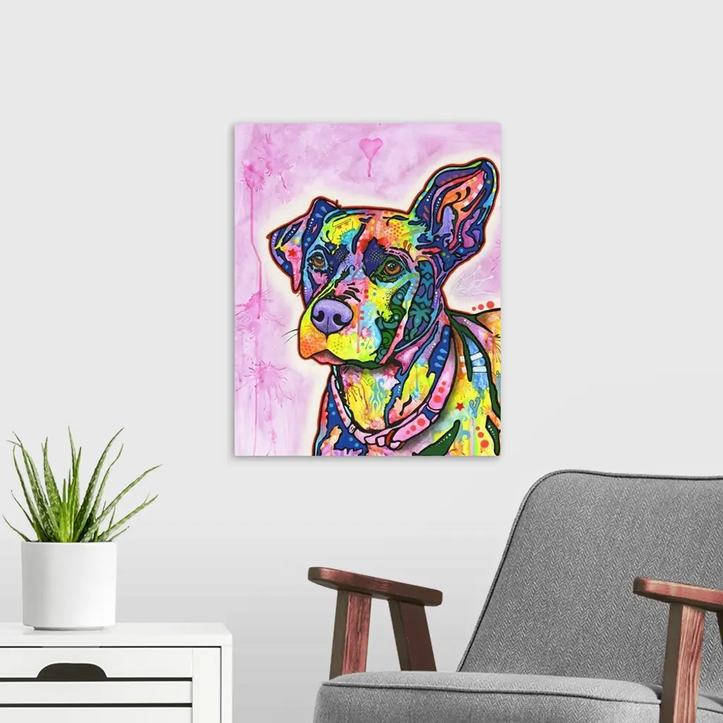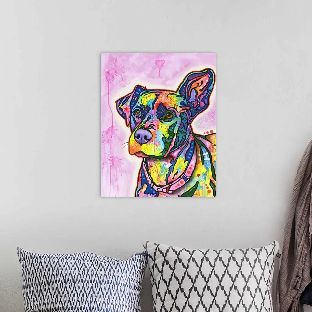 Colorful painting of a Labrador with graffiti-like designs on a pink background.