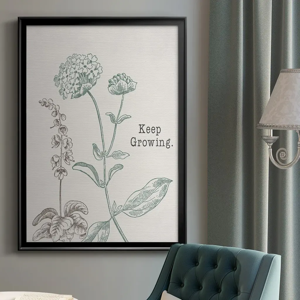Keep Growing Premium Framed Print - Ready to Hang A Premium Framed Print created to last. Framed in distressed wood and available in an array of sizes and colors Featuring a beveled a solid wood stretcher bar, each piece comes ready to hand 4 SIZES AVAILABLE 30.5''X42.5'' - Overall Size 26.5'X36.5'' - Overall Size 22.5''x30.5'' - Overall Size 18.5''x24.5'' - Overall Size Each piece is made to order. Each piece comes with hanging hardware. Made in the USA Ready to Hang