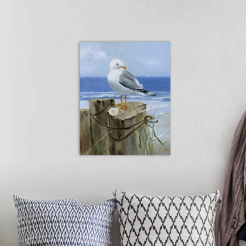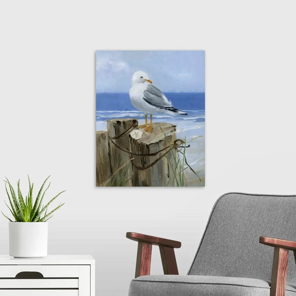 Contemporary painting of a seagull perched on a wooden post with a sand dollar and the ocean in the background.