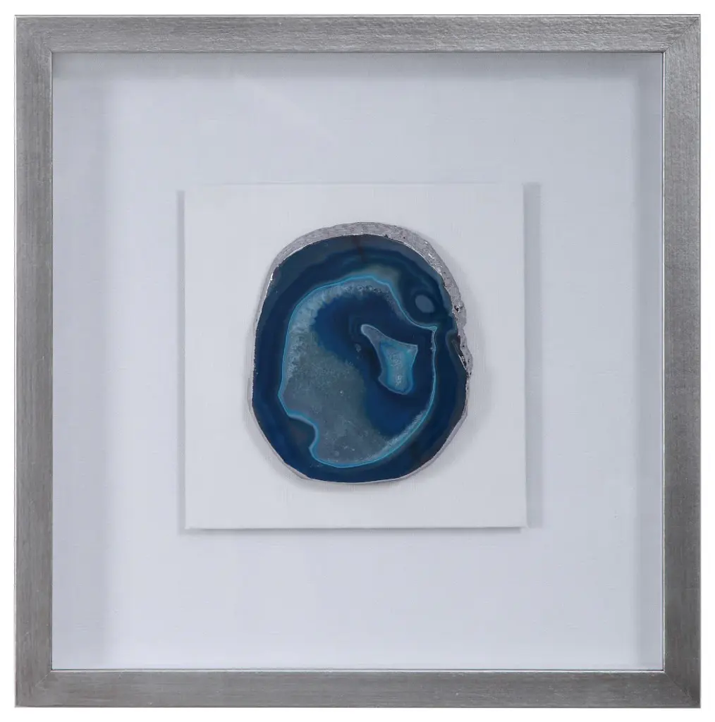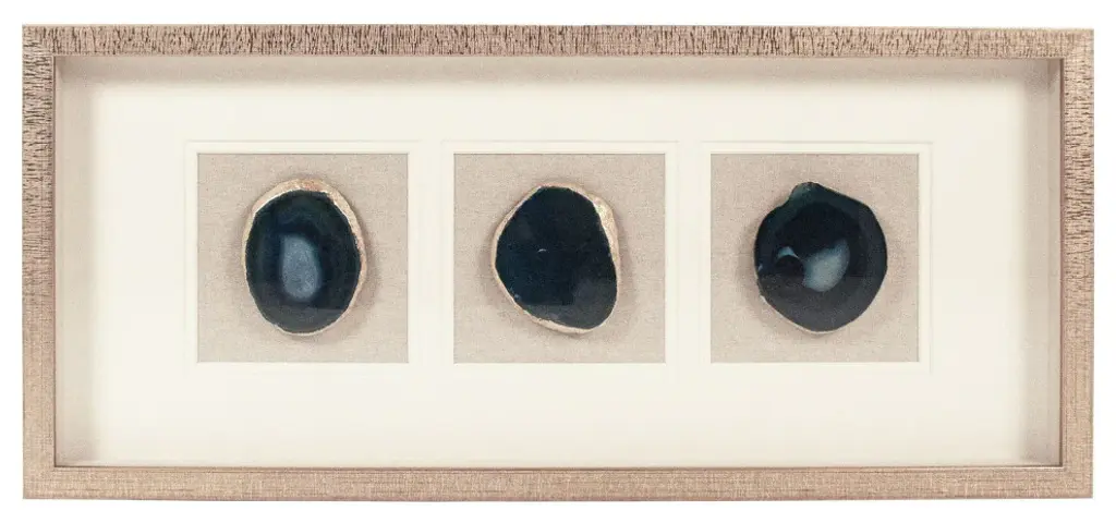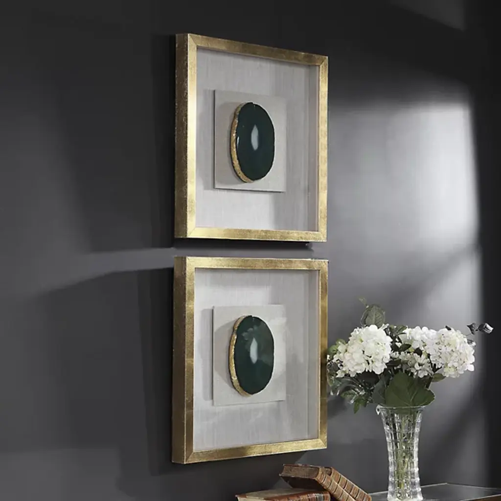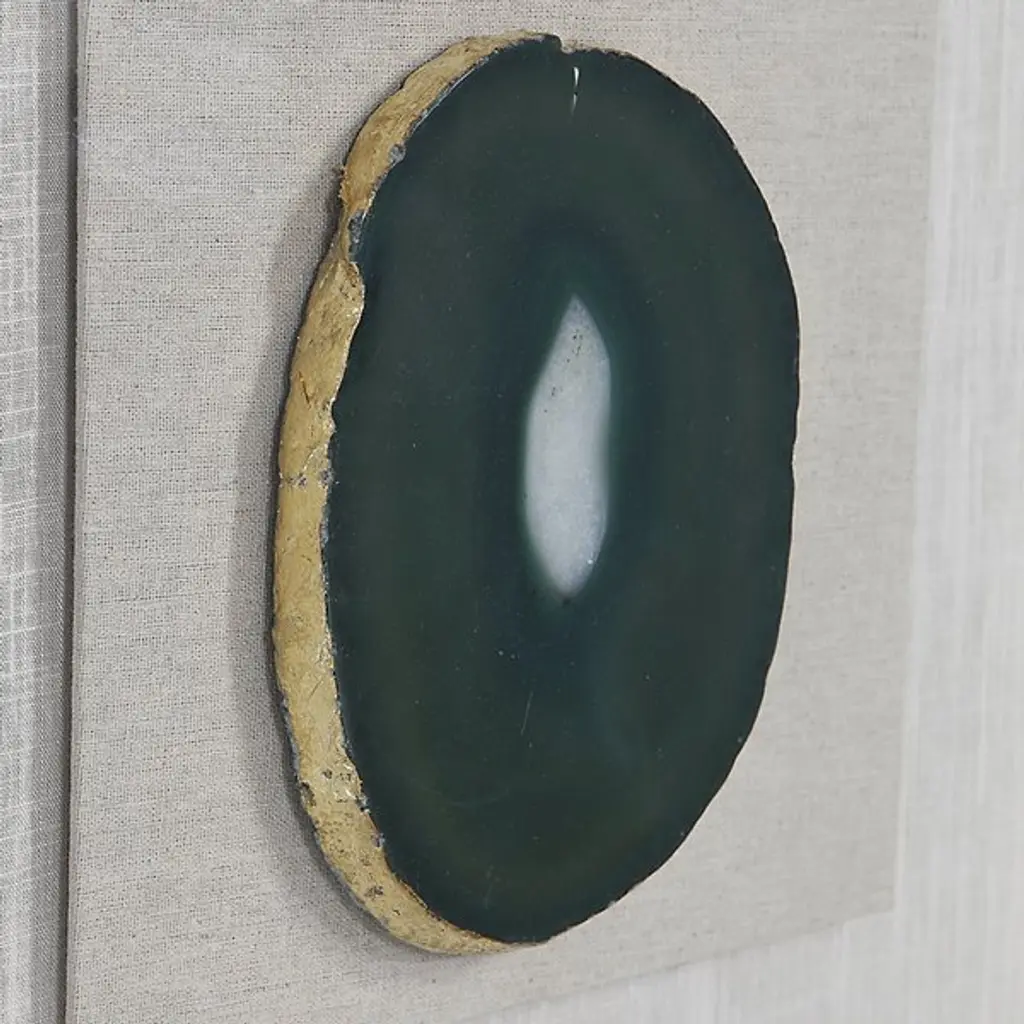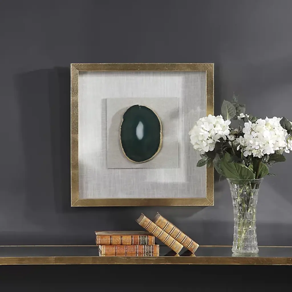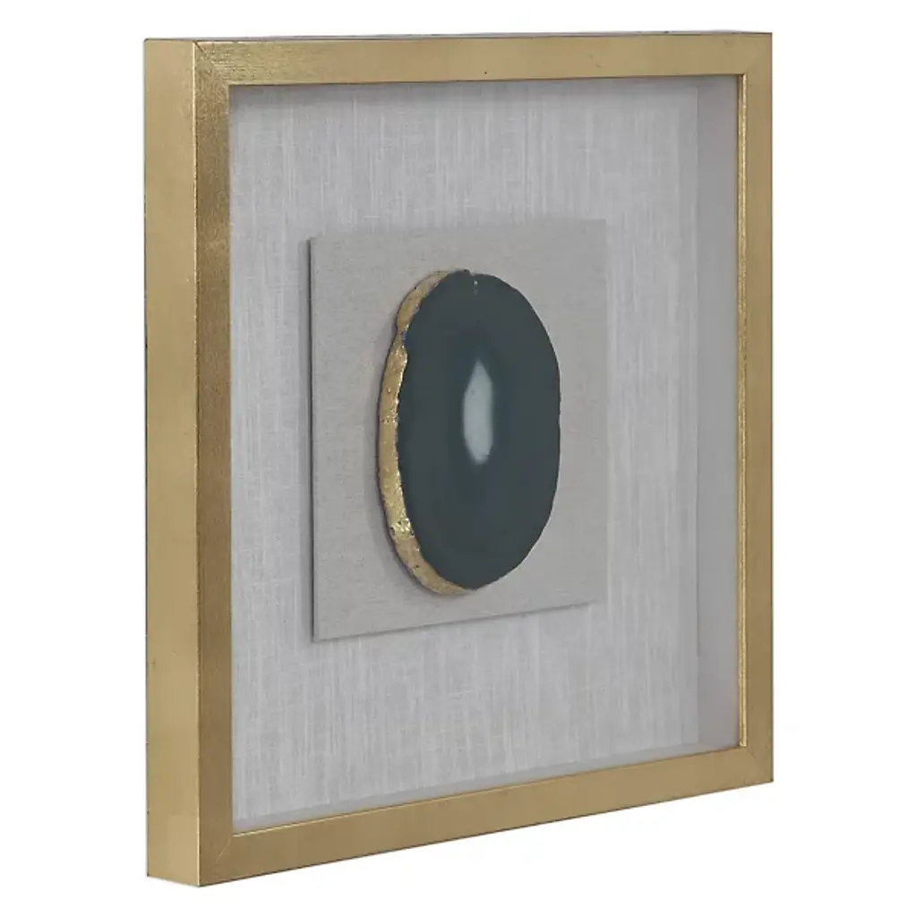 The Keeva Shadow Box from Uttermost highlights a rare agate stone specimen as nature's artwork. Hand-painted gold edging enhances the stone's natural veining, while the offset mounting creates dimensionality within the frame. The pine wood construction with gold leaf application provides an understated yet refined backdrop for the mineral centerpiece. Light reflection on the agate's surface changes throughout the day, making this piece constantly evolving artwork. The linen backing offers textural contrast to the smooth stone and polished frame, completing this naturally luxurious wall accent.