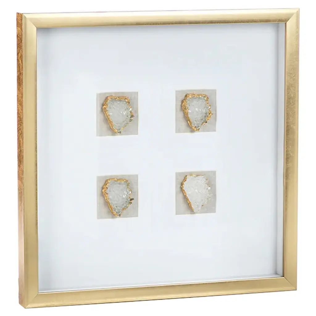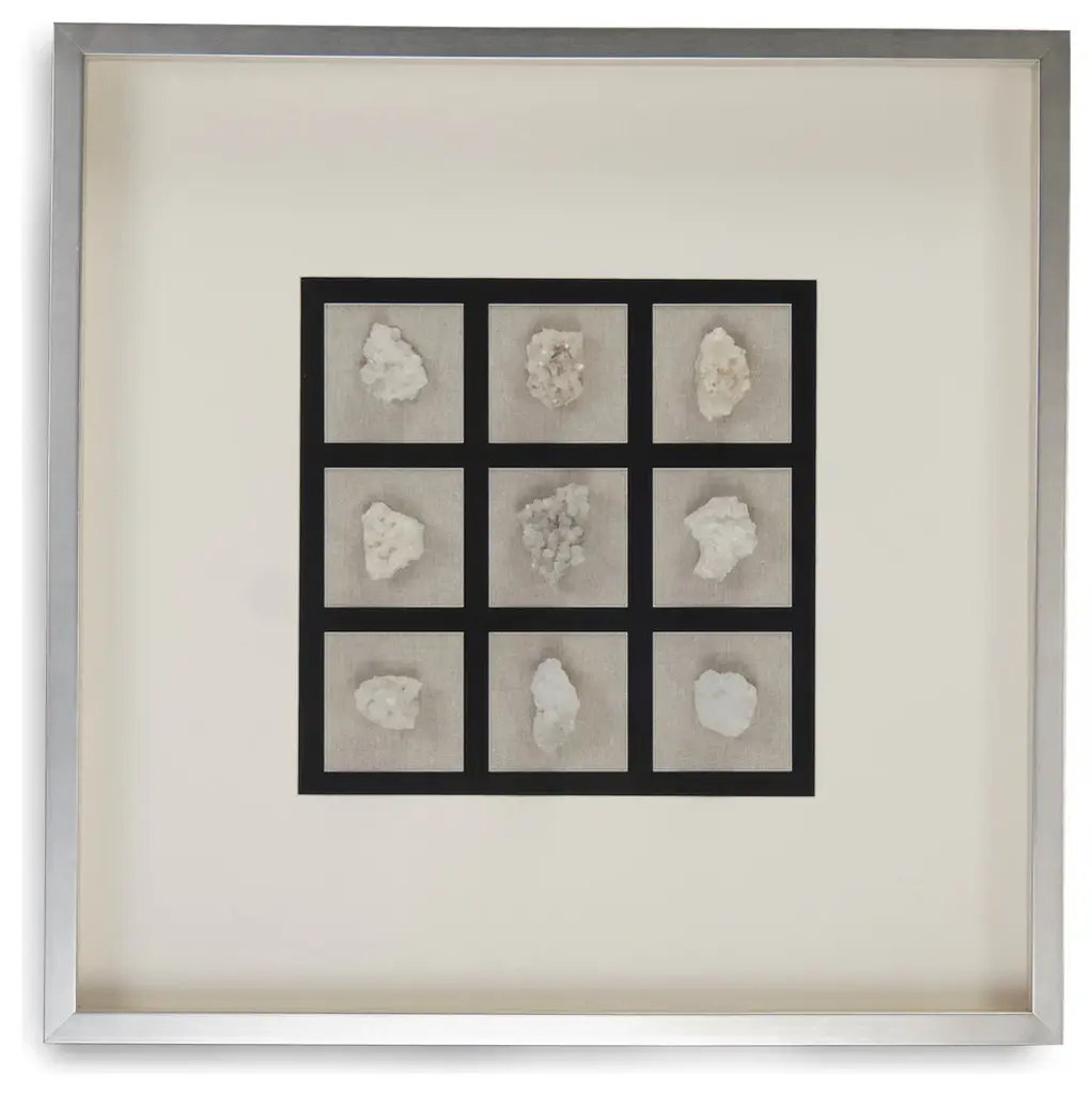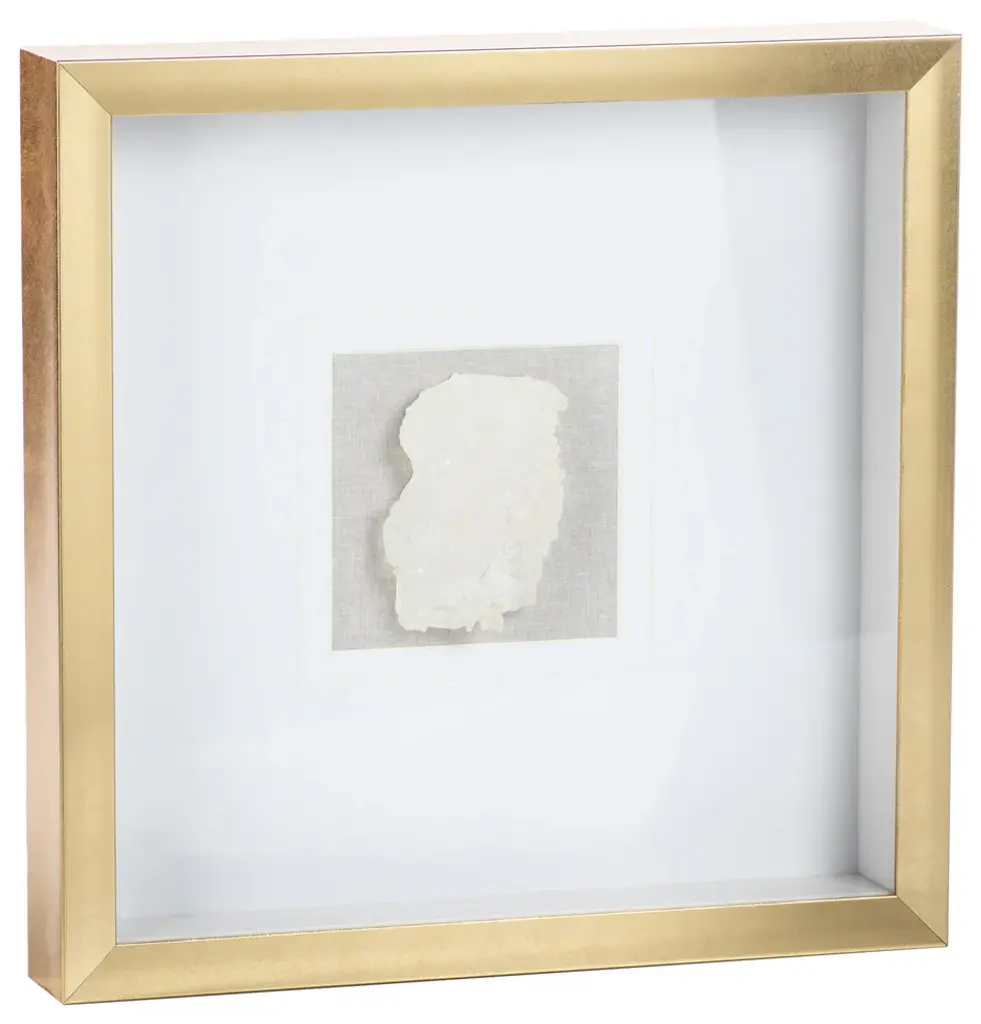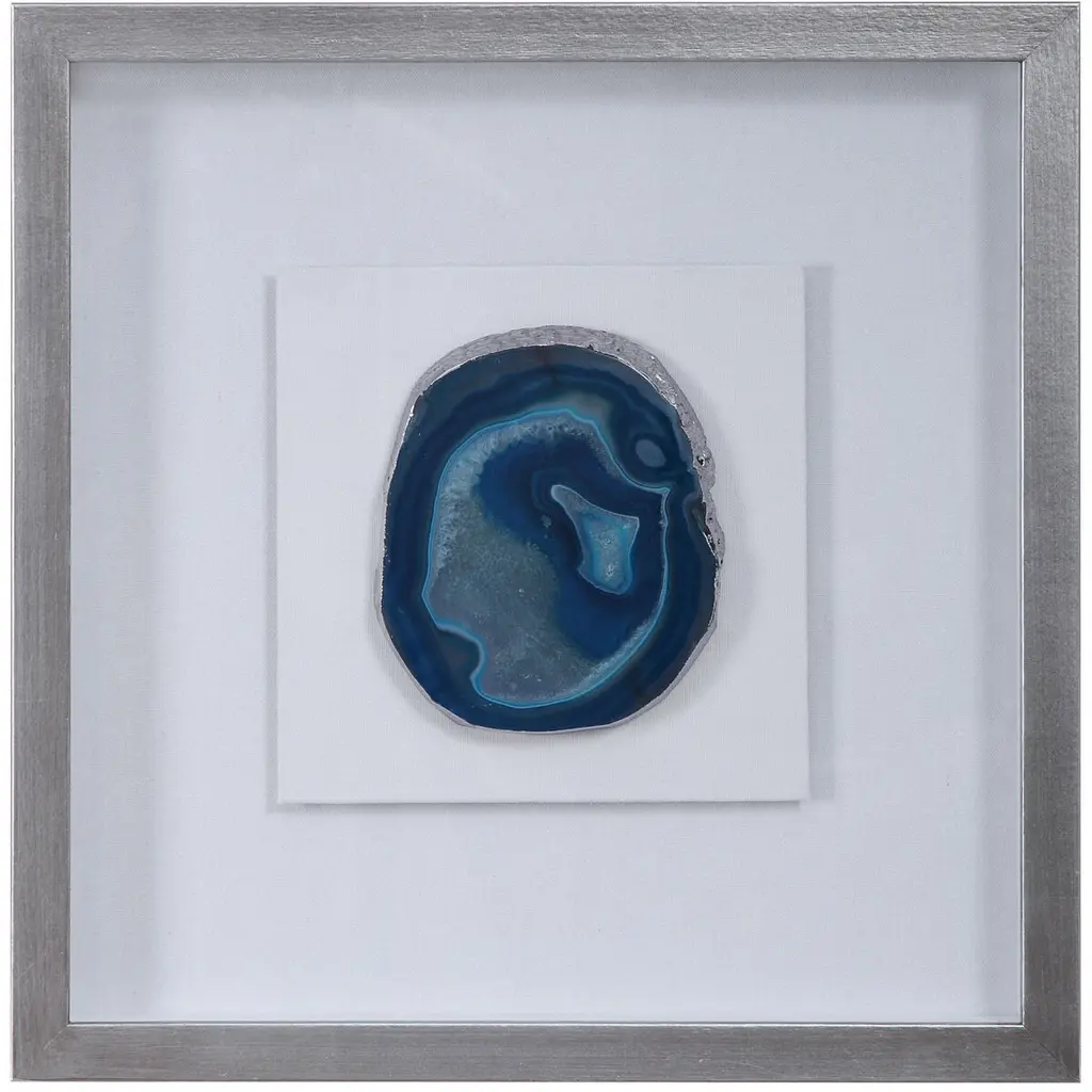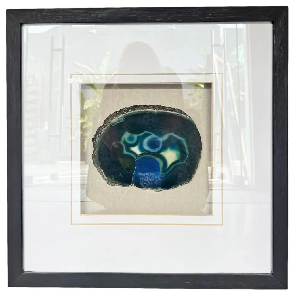 The Keeva Shadow Box from Uttermost highlights a rare agate stone specimen as nature's artwork. Hand-painted gold edging enhances the stone's natural veining, while the offset mounting creates dimensionality within the frame. The pine wood construction with gold leaf application provides an understated yet refined backdrop for the mineral centerpiece. Light reflection on the agate's surface changes throughout the day, making this piece constantly evolving artwork. The linen backing offers textural contrast to the smooth stone and polished frame, completing this naturally luxurious wall accent.