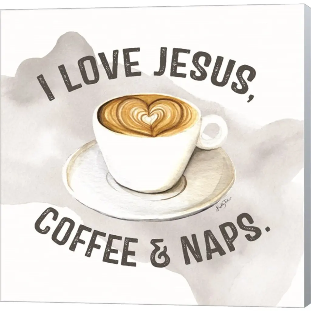 Jesus - Coffee - Naps by Kelley Talent is a high quality piece of canvas artwork. The finished size of this piece is 12" X 12", and it has a depth 1.5" with wintergray painted sides. There is a UV protective coating over the entire image, and it is ready to hang on your wall with no hardware required. 100% Satisfaction Guaranteed.