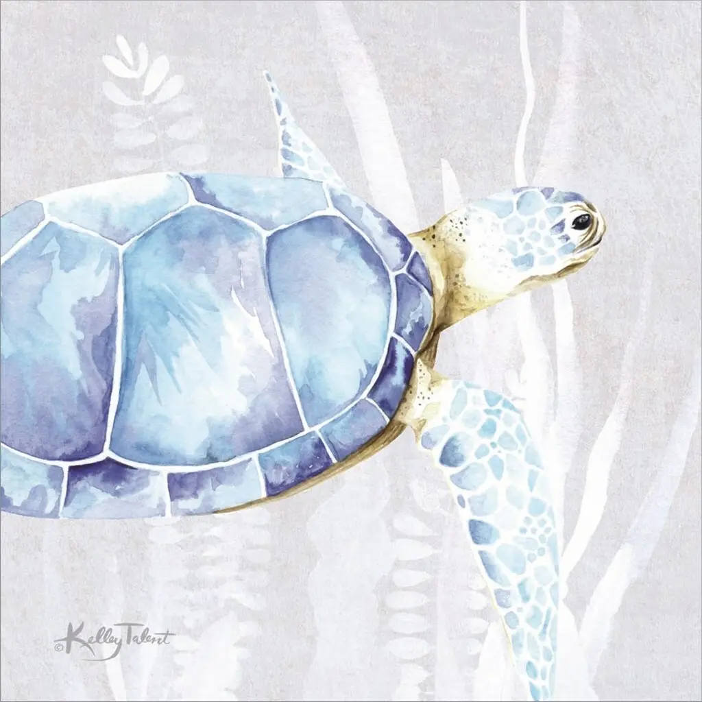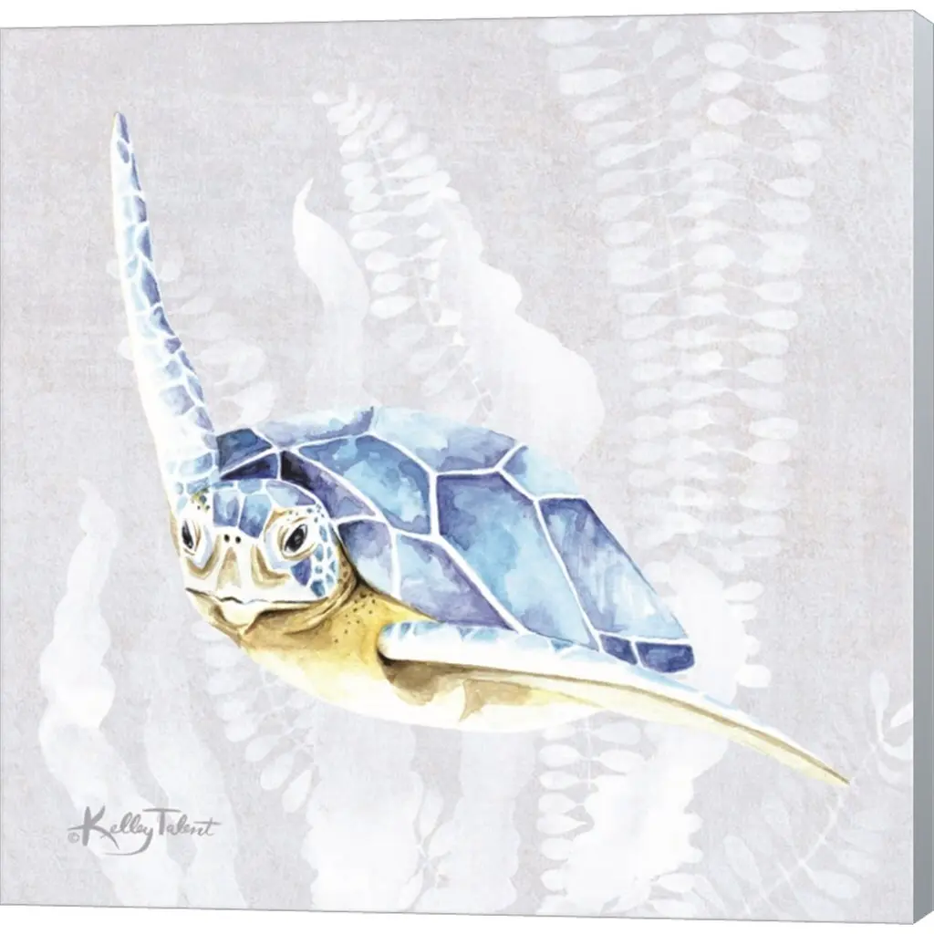 Sea Turtle II by Kelley Talent is a high quality piece of canvas artwork. The finished size of this piece is 16" X 16", and it has a depth 1.5" with winter gray painted sides. There is a UV protective coating over the entire image, and it is ready to hang on your wall with no hardware required. 100% Satisfaction Guaranteed.