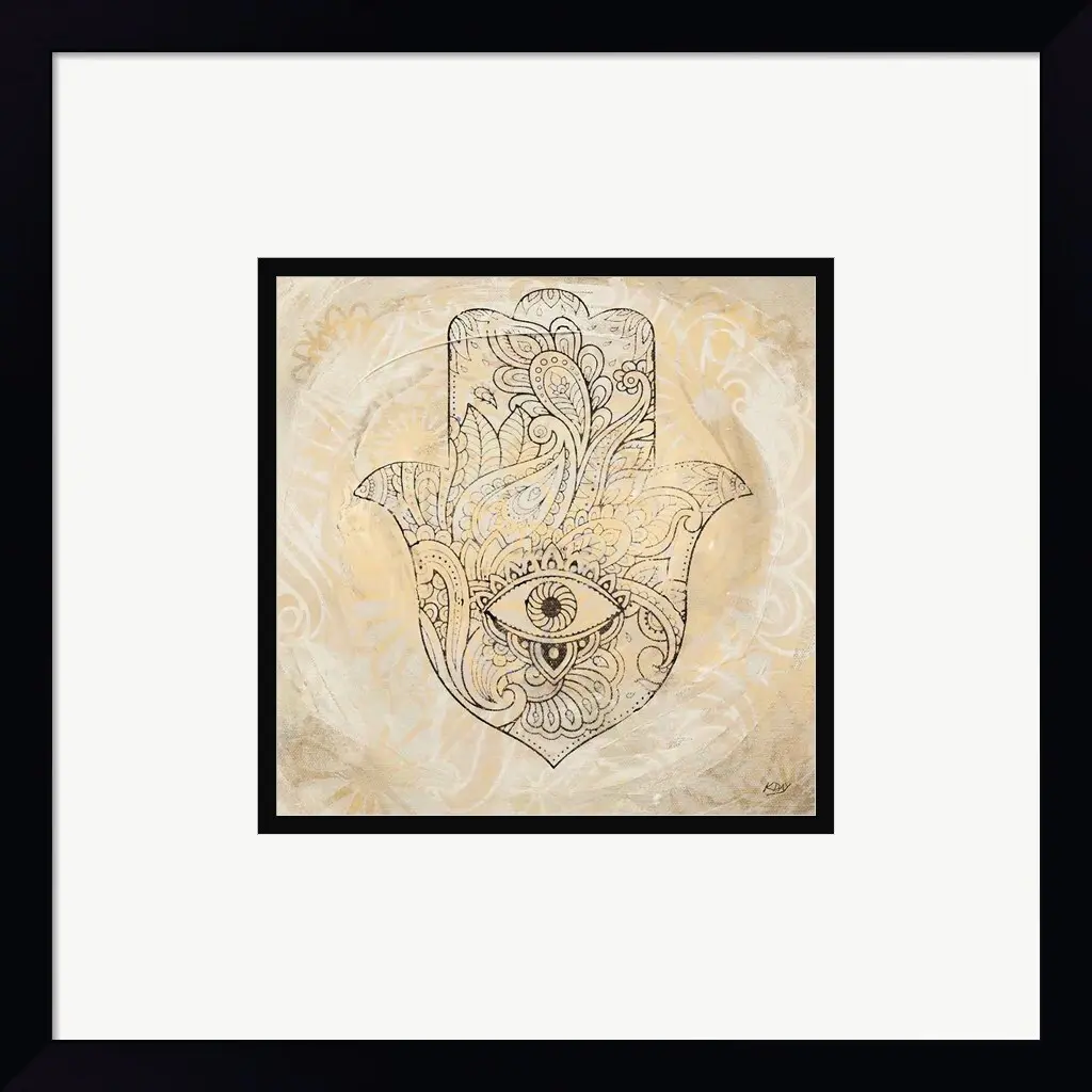 Hamsa Eye Neutral by Kellie Day is a high quality piece of framed artwork. The finished size of this piece is 15.5" X 15.5". It has a Petite Black with Flat Front frame, is double matted and finished with high quality Acrylic Plexiglass. 100% Satisfaction Guaranteed.