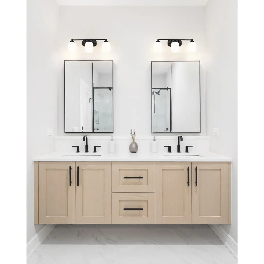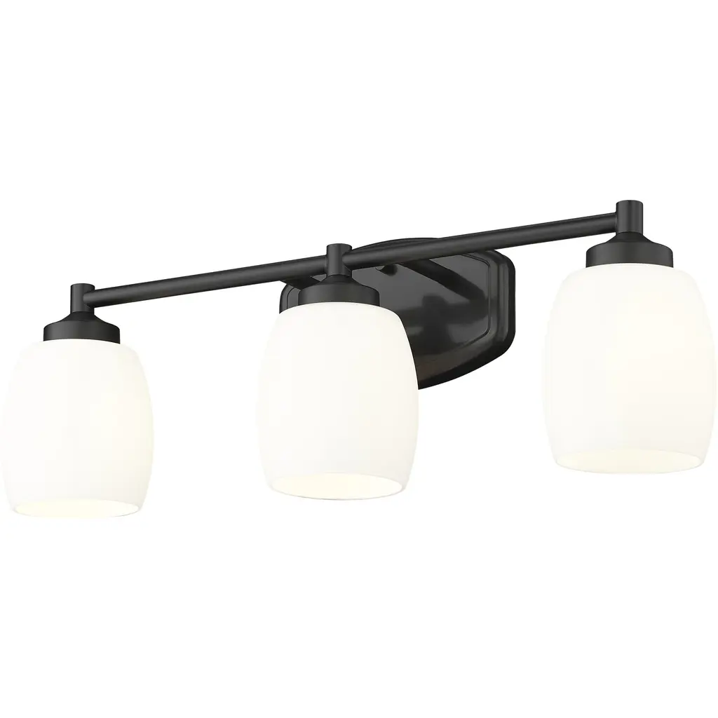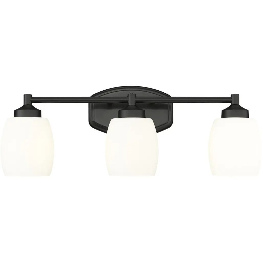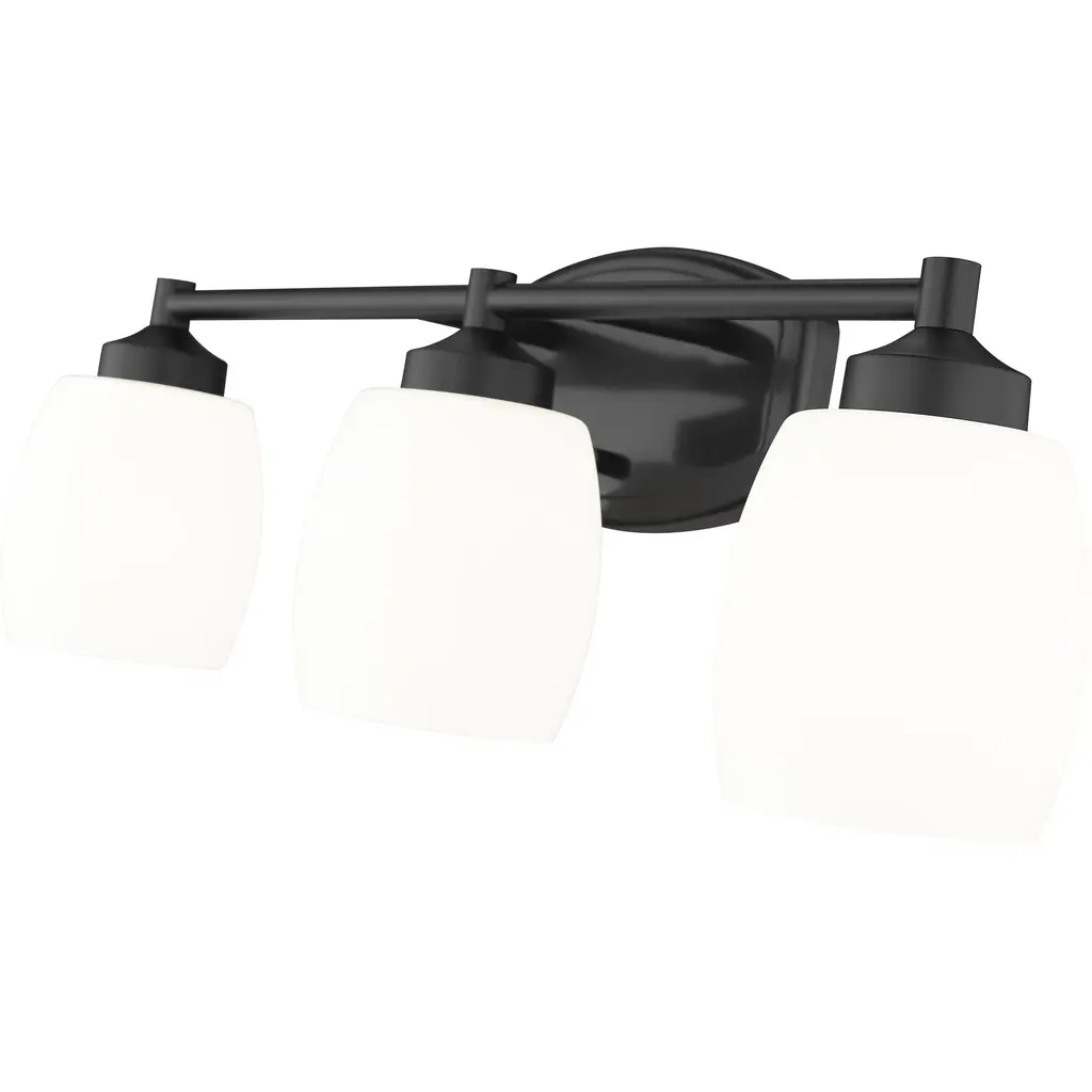 Understated design and subtle curves are the hallmarks of a modern three-light vanity fixture. In matte black for optimal contrast and definition, the fixture features steel construction paired with matte opal shades that diffuse illumination beautifully. It's the ideal solution for a refined, contemporary bathroom space.