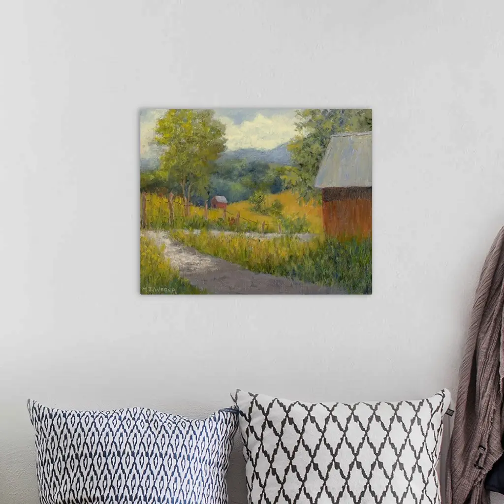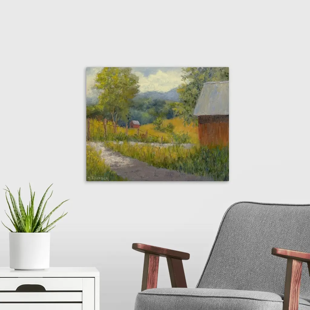 Horizontal painting on a big wall hanging of a small path leading through a green landscape on a farm, a small building sits in the foreground while another can be seen in the distant hills.