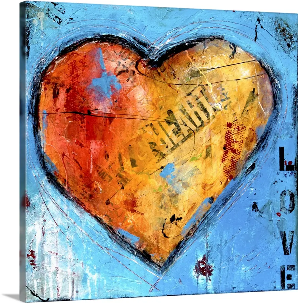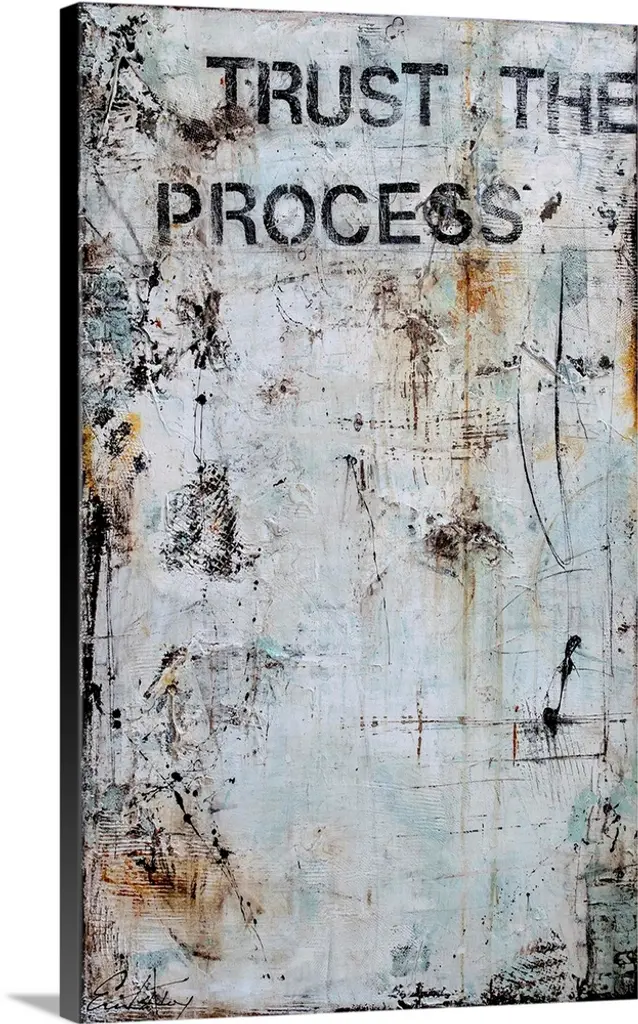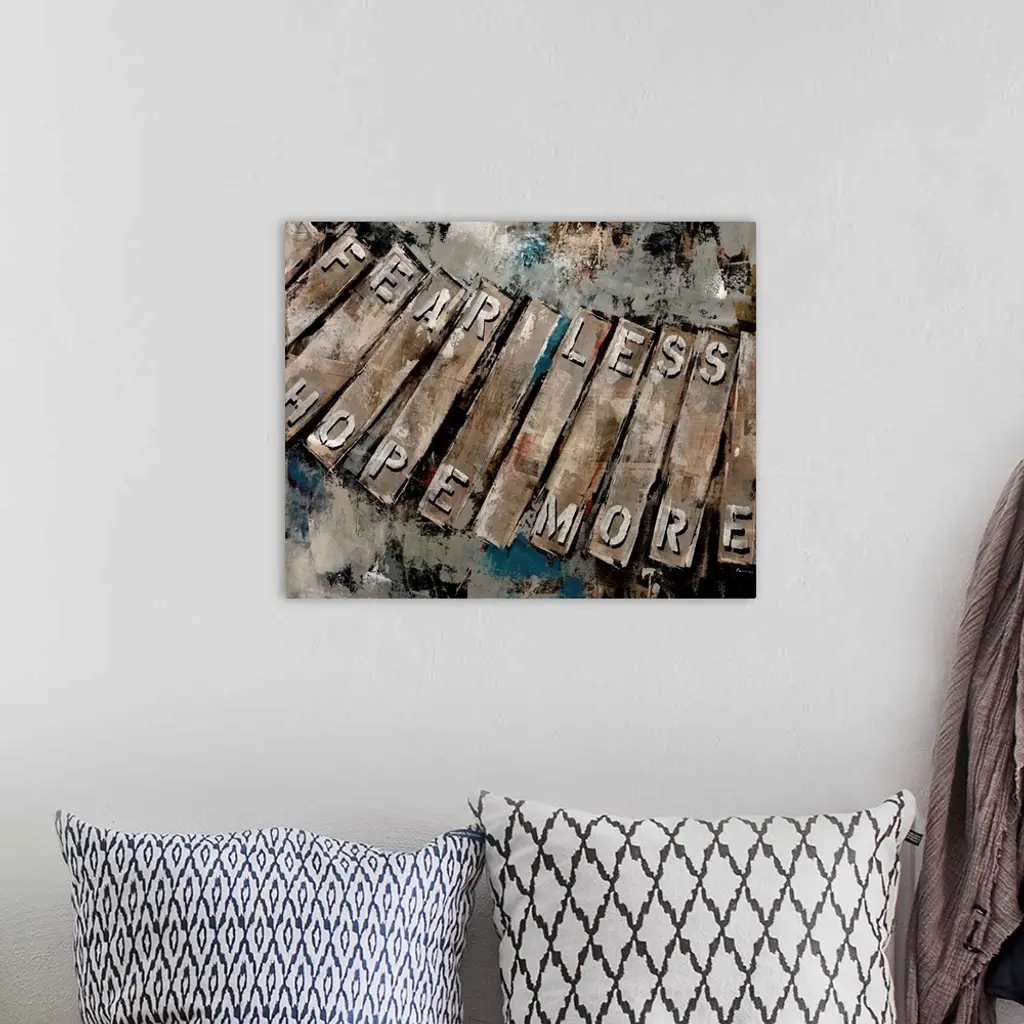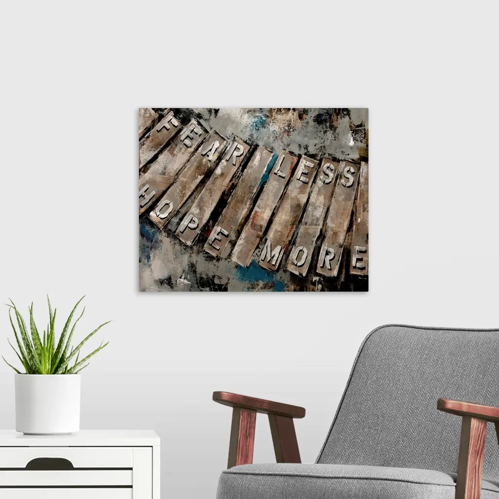 Contemporary artwork with long blocks and the words fear less, hope more spelled out on them. The background is abstract with blotches of cooler colors.