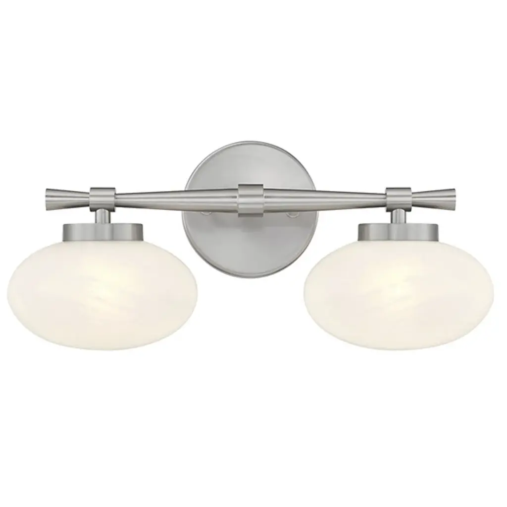 Add a refined radiance to interiors with the dual-disc shape of the Khan LED Vanity Light from Visual Comfort Studio. A mix of transitional design and contemporary technology designed by Sean Lavin, it uses a circle wall plate contrasted with a horizontal crossbar to support energy-efficient and damp-rated lamping. Glass puck shades cap off inside circular housings, transforming bright light into a restrained, even radiance ideal for bathroom illumination, particularly if it is placed over a mirror.
