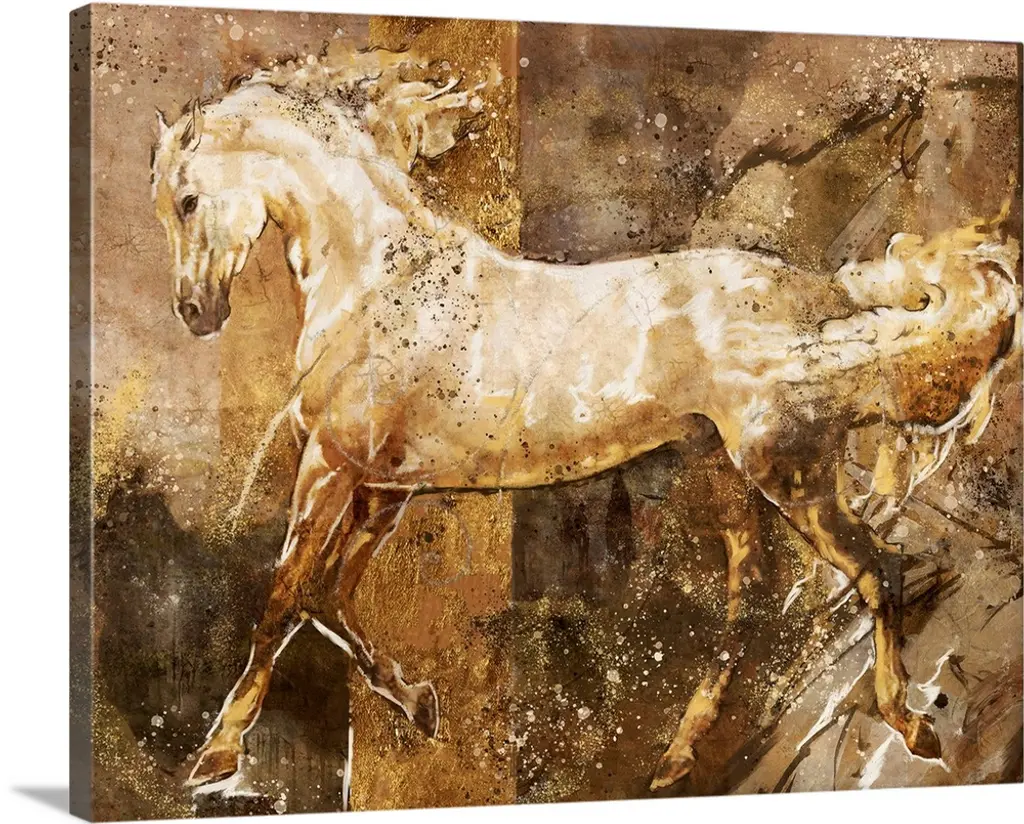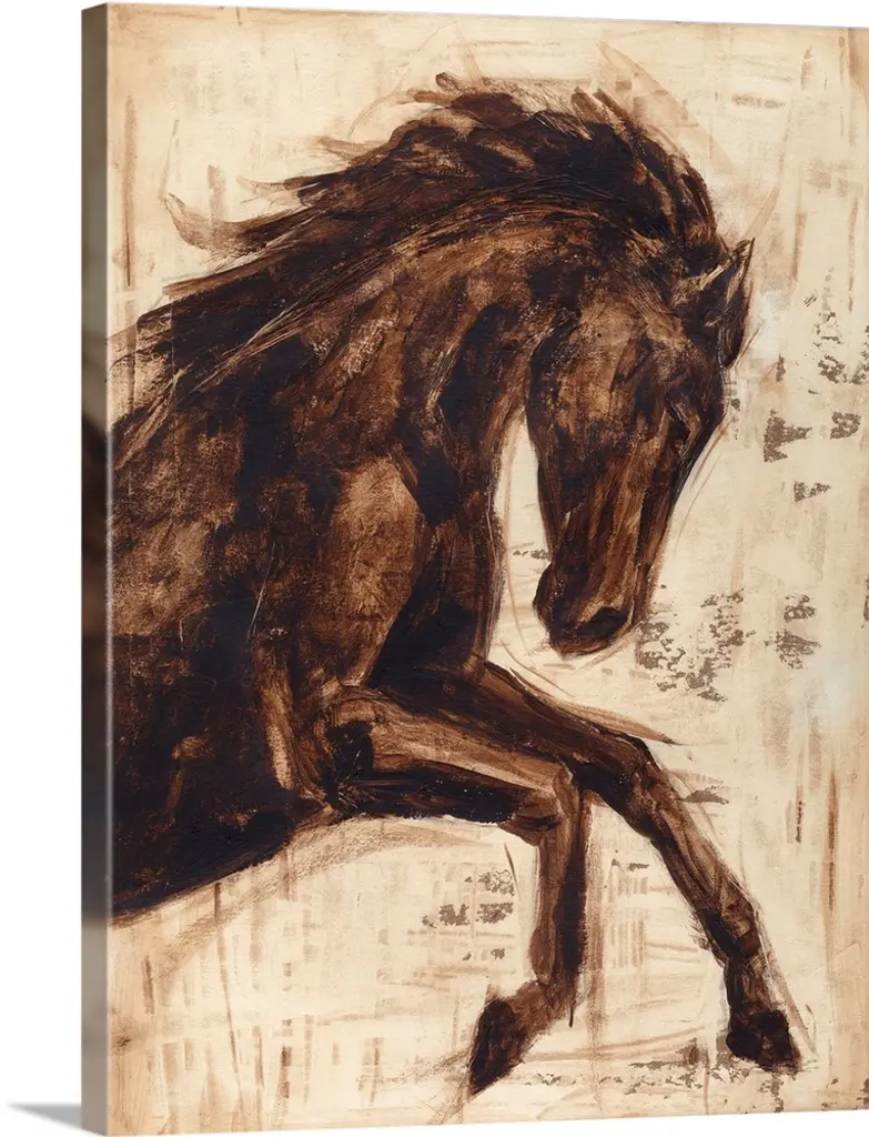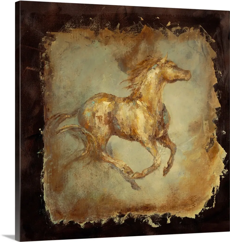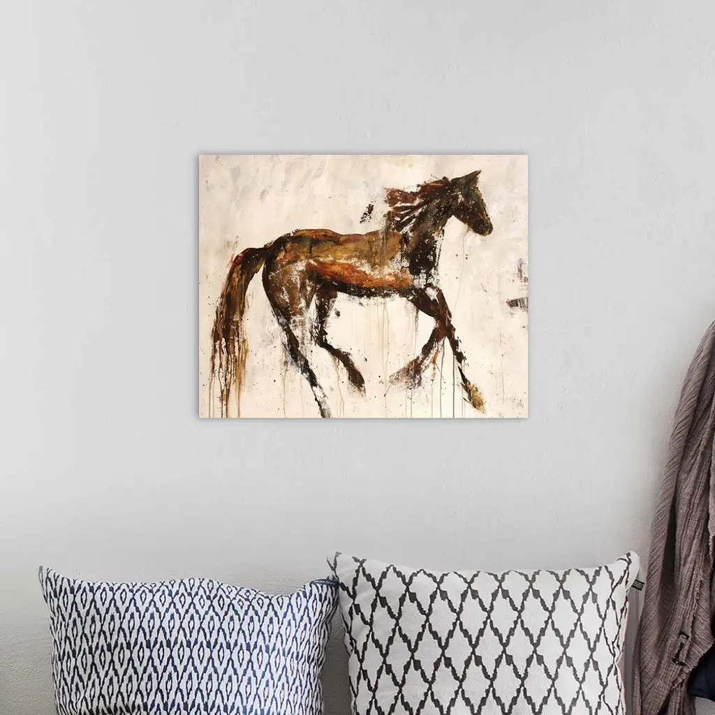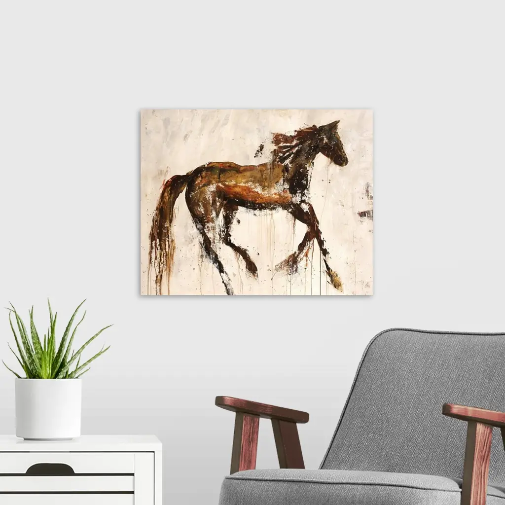 Contemporary painting of a brown rustic looking horse in a galloping motion.
