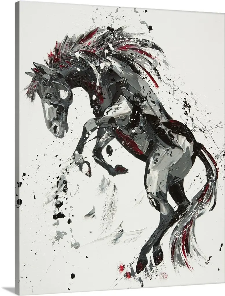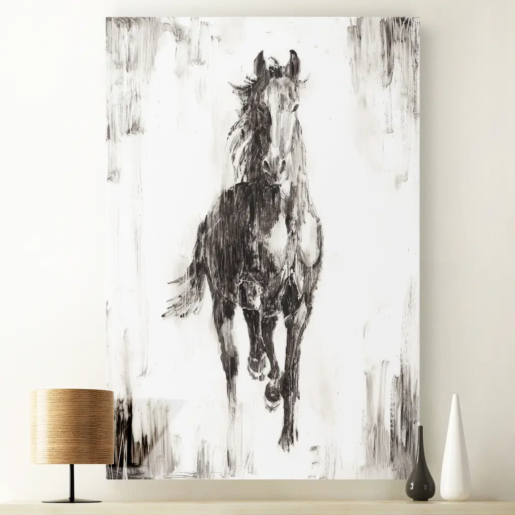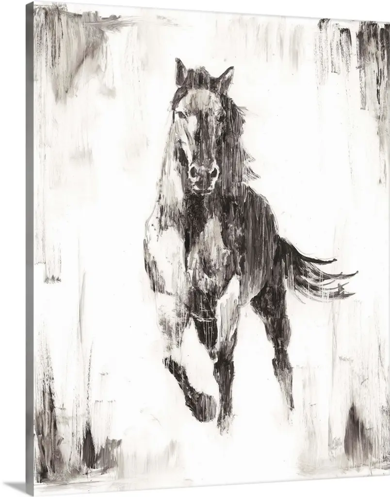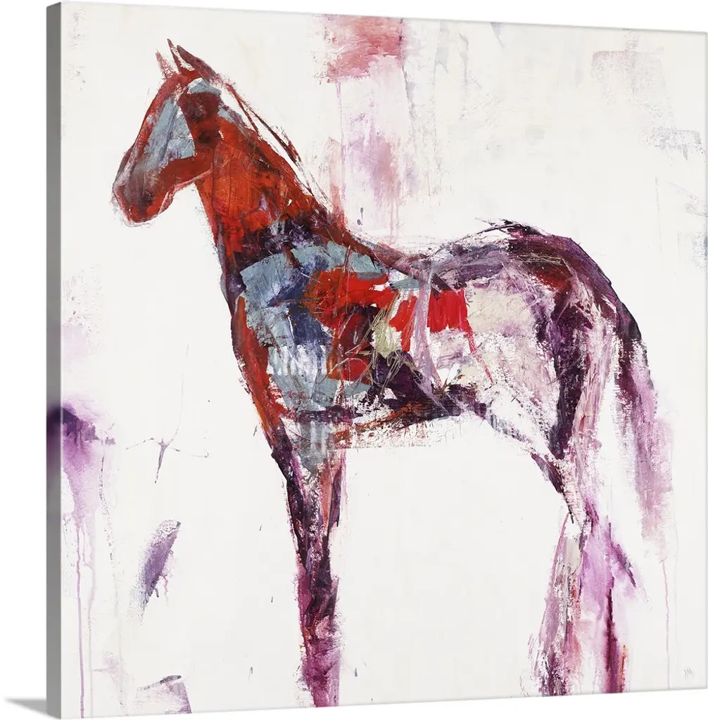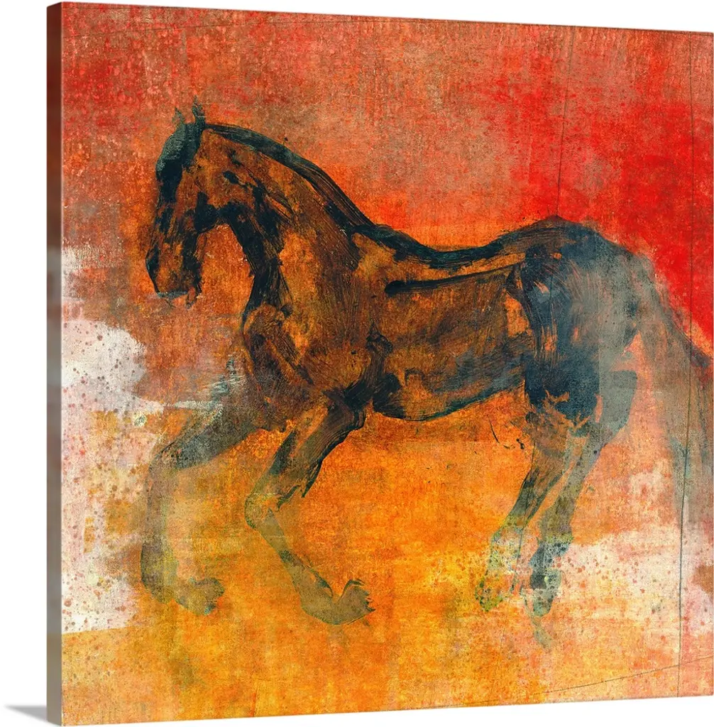 Contemporary painting of a brown rustic looking horse in a galloping motion.