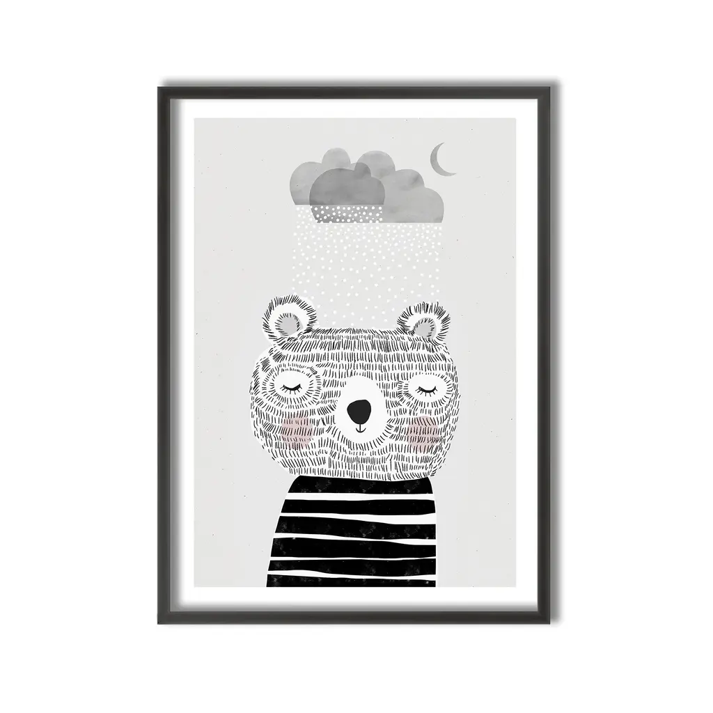 Framed kids art print I Love Snow by artist Treechild is a fun addition to any nursery & kid's room decor. Whether they're an animal lover or just enjoy bright colors. It features the image of a baby bear in a striped sweater enjoying the snowy weather—making it a playful piece. This piece is handcrafted in Chattanooga, Tennessee by Ready2HangArt, using eco-friendly practices. The print is archival with a white border, assembled in a 100% pine wood frame and finished with hardware for simple installation.